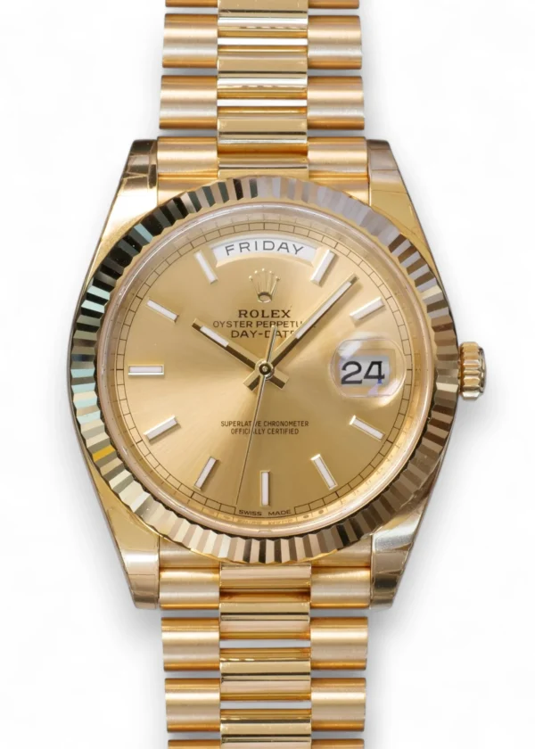 ROLEX DAY-DATE 40 YELLOW GOLD CHAMPAGNE DIAL NOS FULL FACTORY STICKERS
