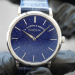 So what is so special about the Blue Copper dial? Blue Copper, or Goldstone as it’s more commonly known, is glass that looks similar to Aventurine with enamel treatment. To breakdown the complexity of manufacturing this dial, the dial is made of silver sterling with flakes of copper, through an Aventurine glass based paint i.e. a fire enamel paint with multiple applications of firing it in a kiln, with the copper elements insinuated to create the image or at least the illusion of a bottomless and endless glistening cosmos – the experience and pleasure of its own kind, all housed inside an ultra-thin case of circa 6mm.