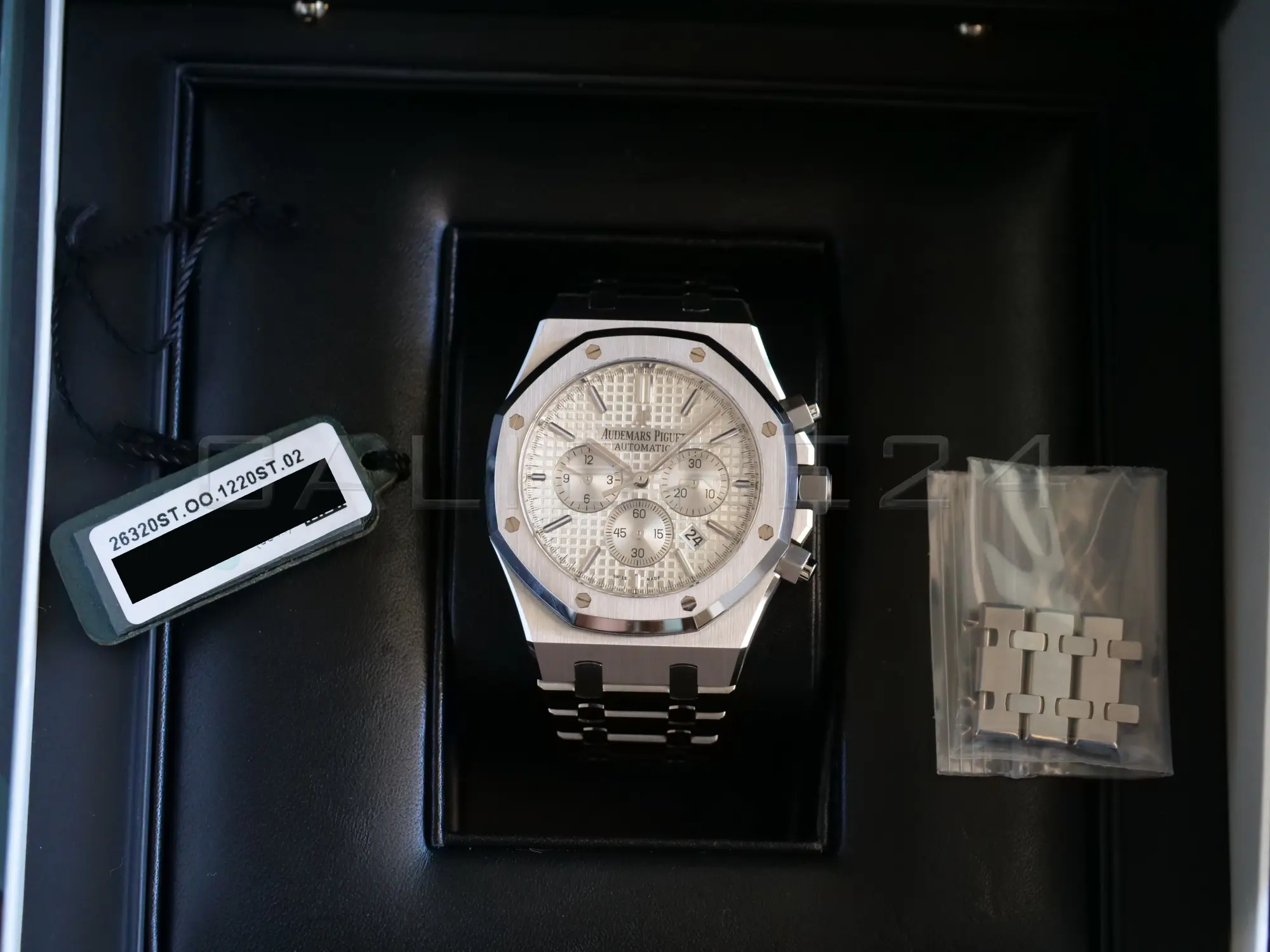 The serial number and the card details are redacted in all the photos of Audemars Piguet Royal Oak Chronograph 26320ST for privacy and security reasons.