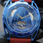 The De Bethune blue was discovered by accident by the brand’s master watchmaker Denis Flageollet, who was attempting to heat treat titanium balance wheels to reduce instability. In the process, Denis found that when heated over 700º Celcius, titanium took on this almost cosmic blue color.