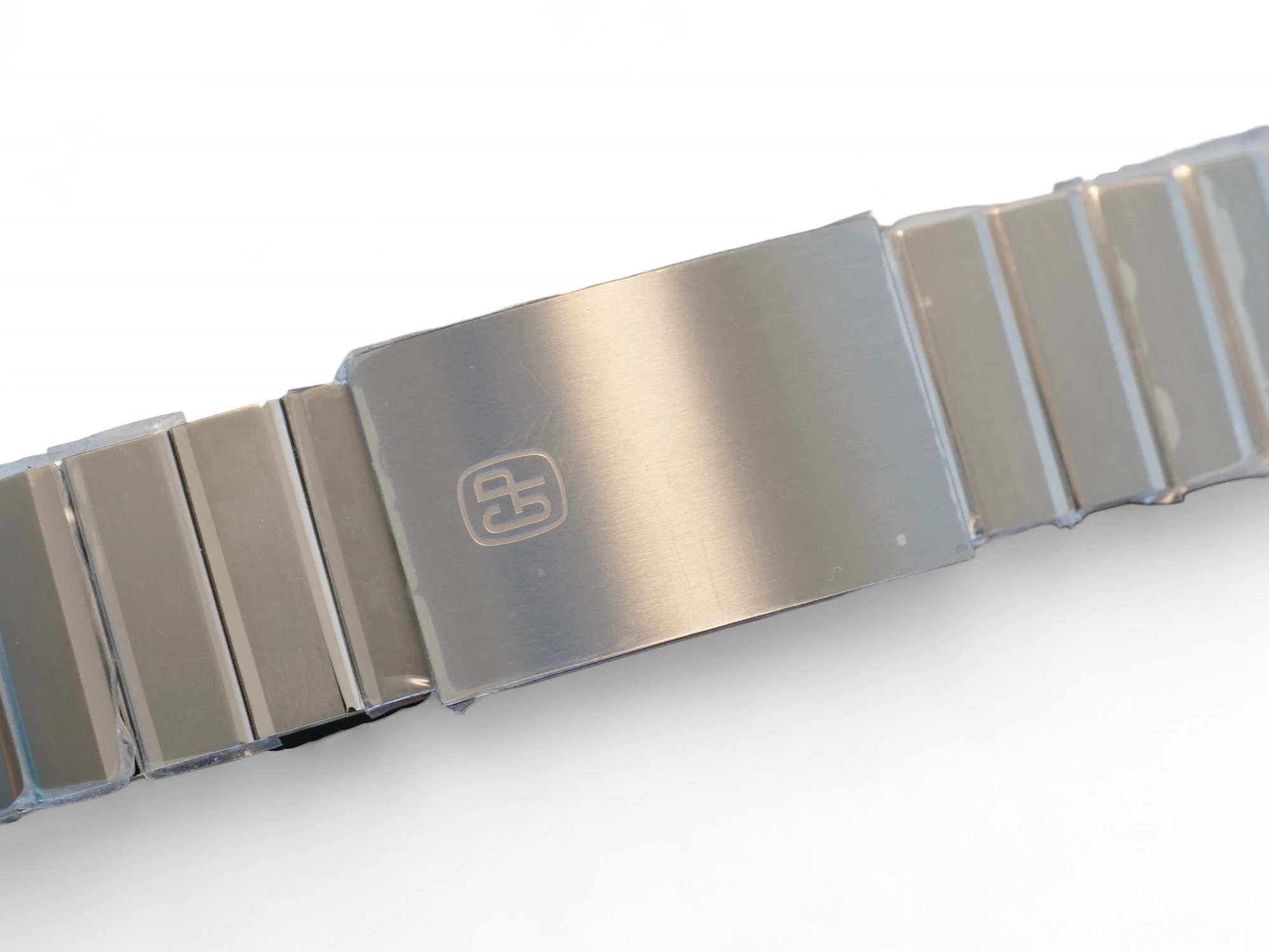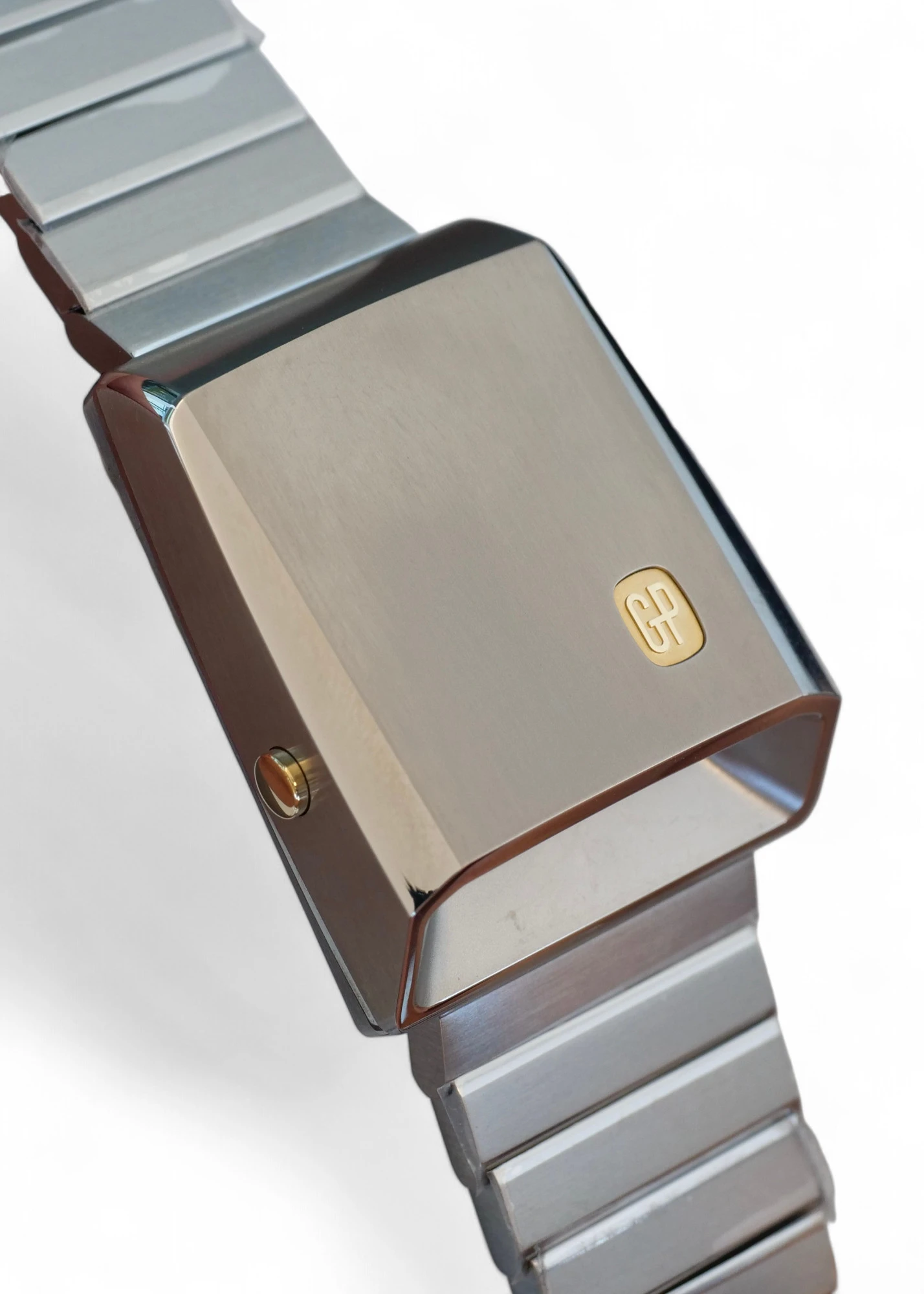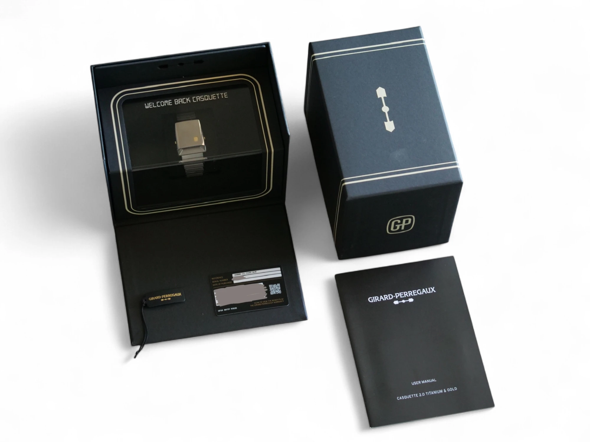 The Girard-Perregaux Casquette 2.0 (Ref. 39800-21-3199-6CM) is a bold reinterpretation of a 1970s icon, blending vintage aesthetics with modern materials and technology. This limited edition features a lightweight titanium case paired with a yellow gold GP logo, and matching pushers. The tubular LED display, a hallmark of the original Casquette, makes a stylish return, delivering a clean, minimalist digital readout that feels both nostalgic and contemporary.