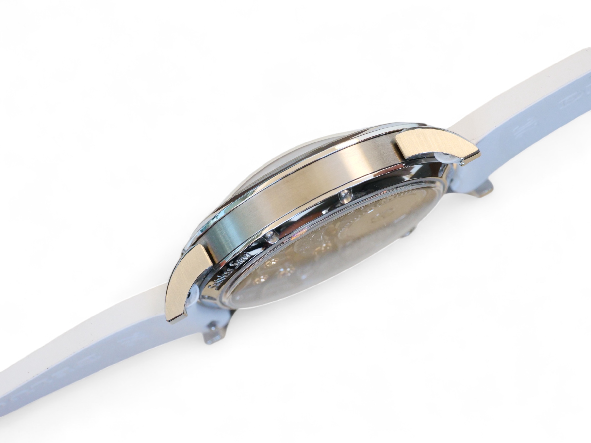 The watch presents in like new and mint condition, please refer to the photos to see the condition of the watch. The watch is offered as full set with factory boxes and papers, including two OEM straps as can be seen in the photos. Please note that the brown OEM strap shows some minor smudge marks as shown in the photos. The white strap in the photos is an aftermarket strap and is included in the scope of delivery.