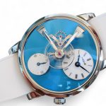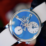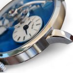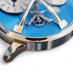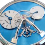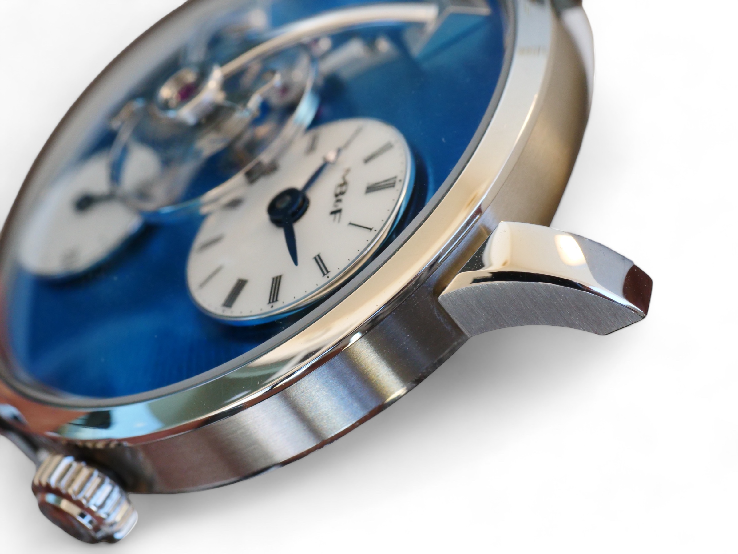 The watch showcases masterfully executed, the center of the show, the flying balance wheel that inherits a double hairspring, and a delightfully encased movement, finished and decorated with the help of master watchmaker Kari Voutilainen. The dial features time, the power reserve, and the iconic, open-worked escapement inside a very wearable 40mm case with a stunning domed crystal exhibiting the three-dimentionality of the dial. The sunburst dial in blue in a joy in the light to behold as it showcases a play of reflections and shadows.