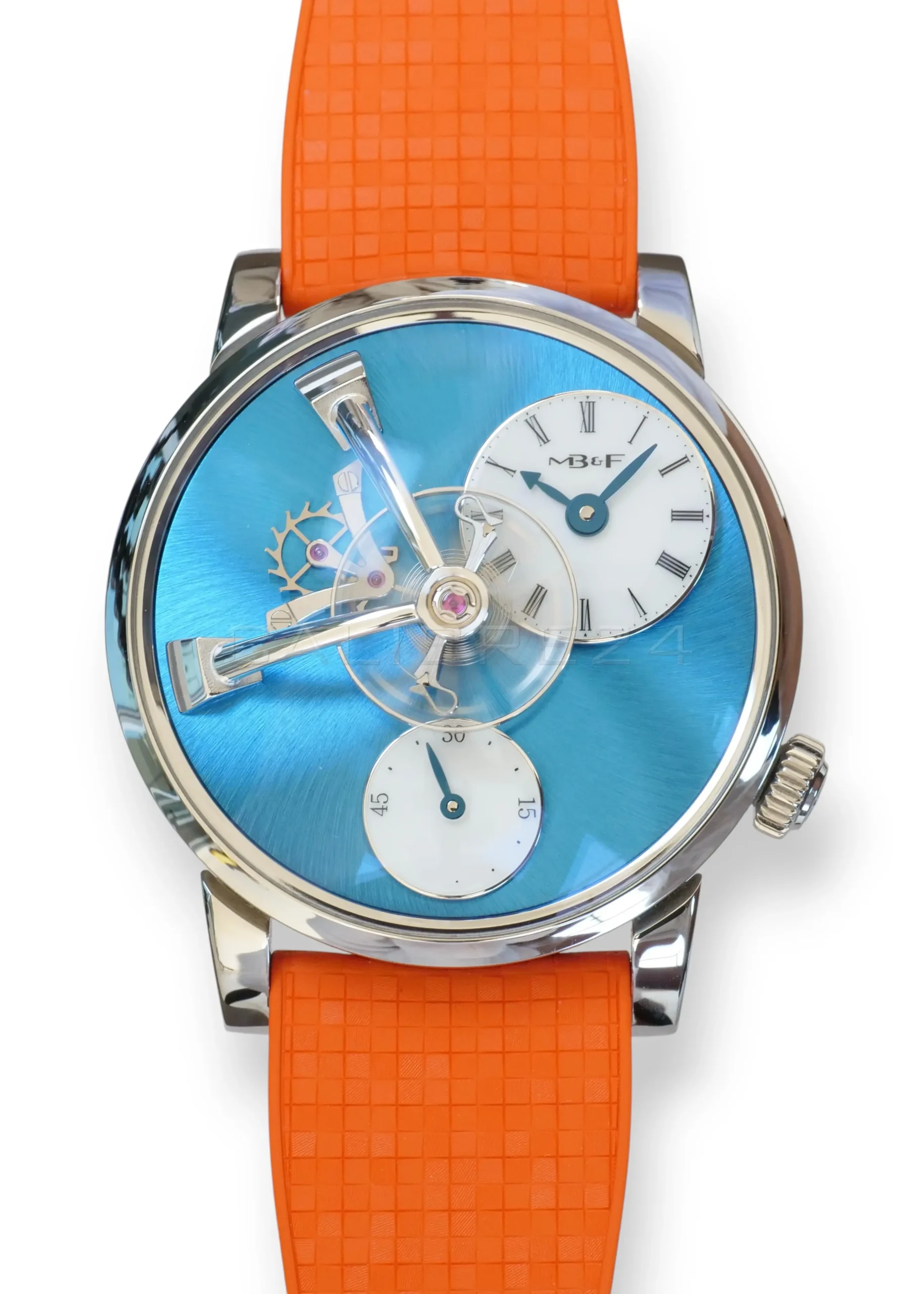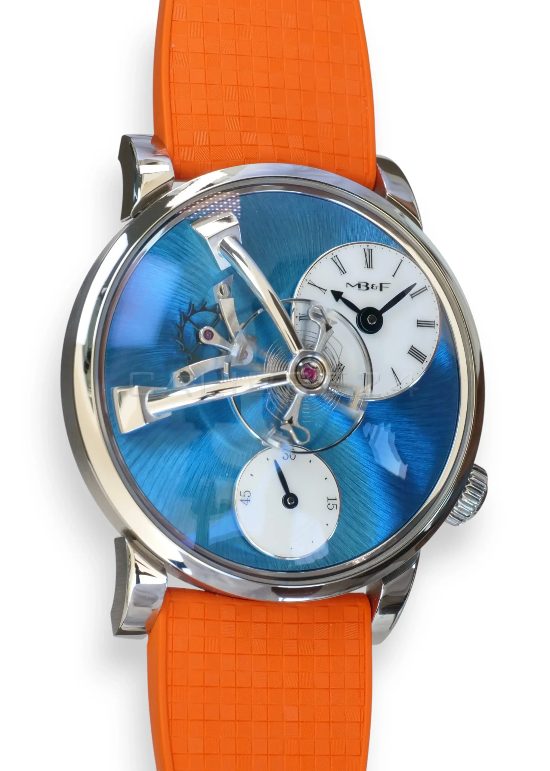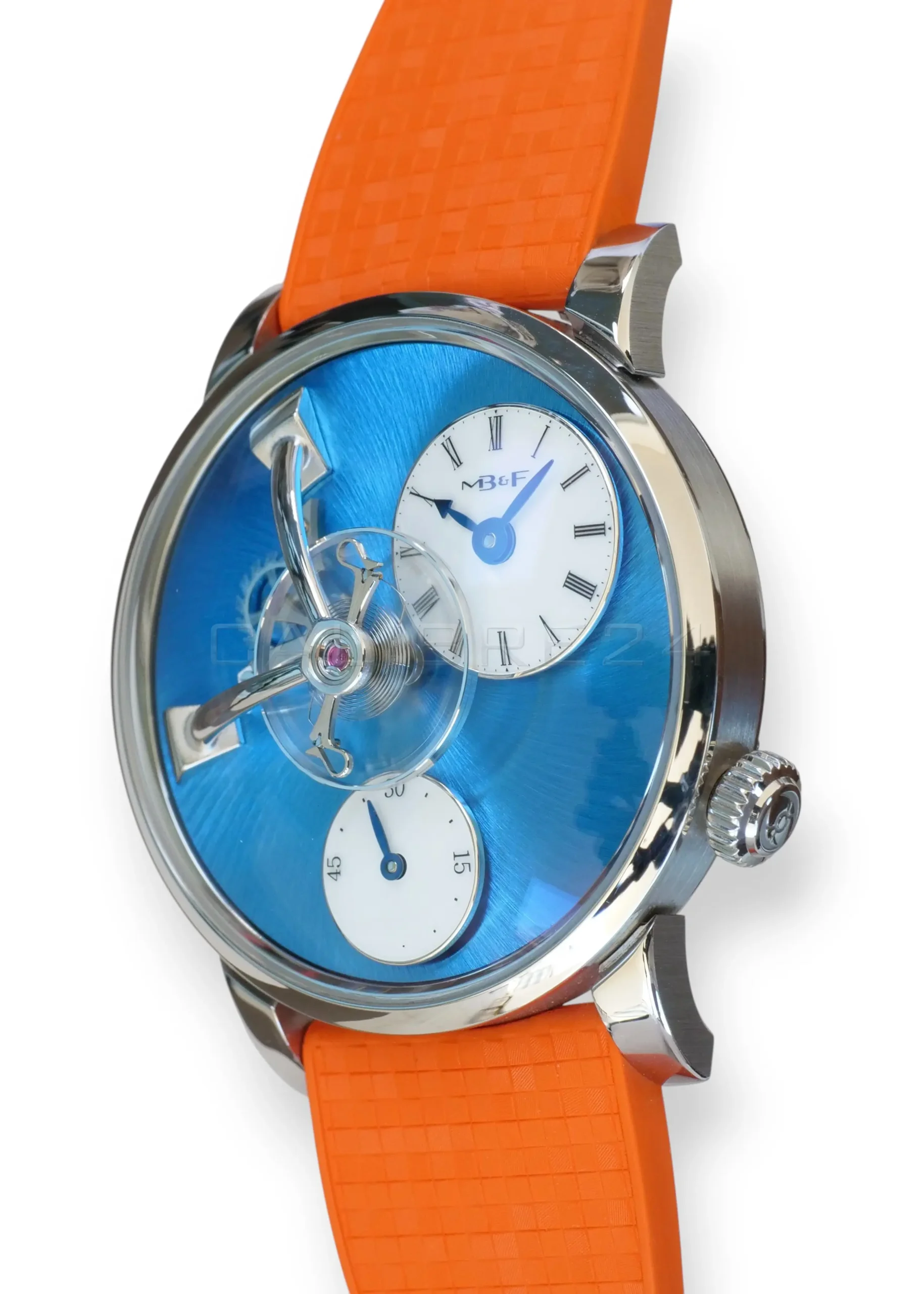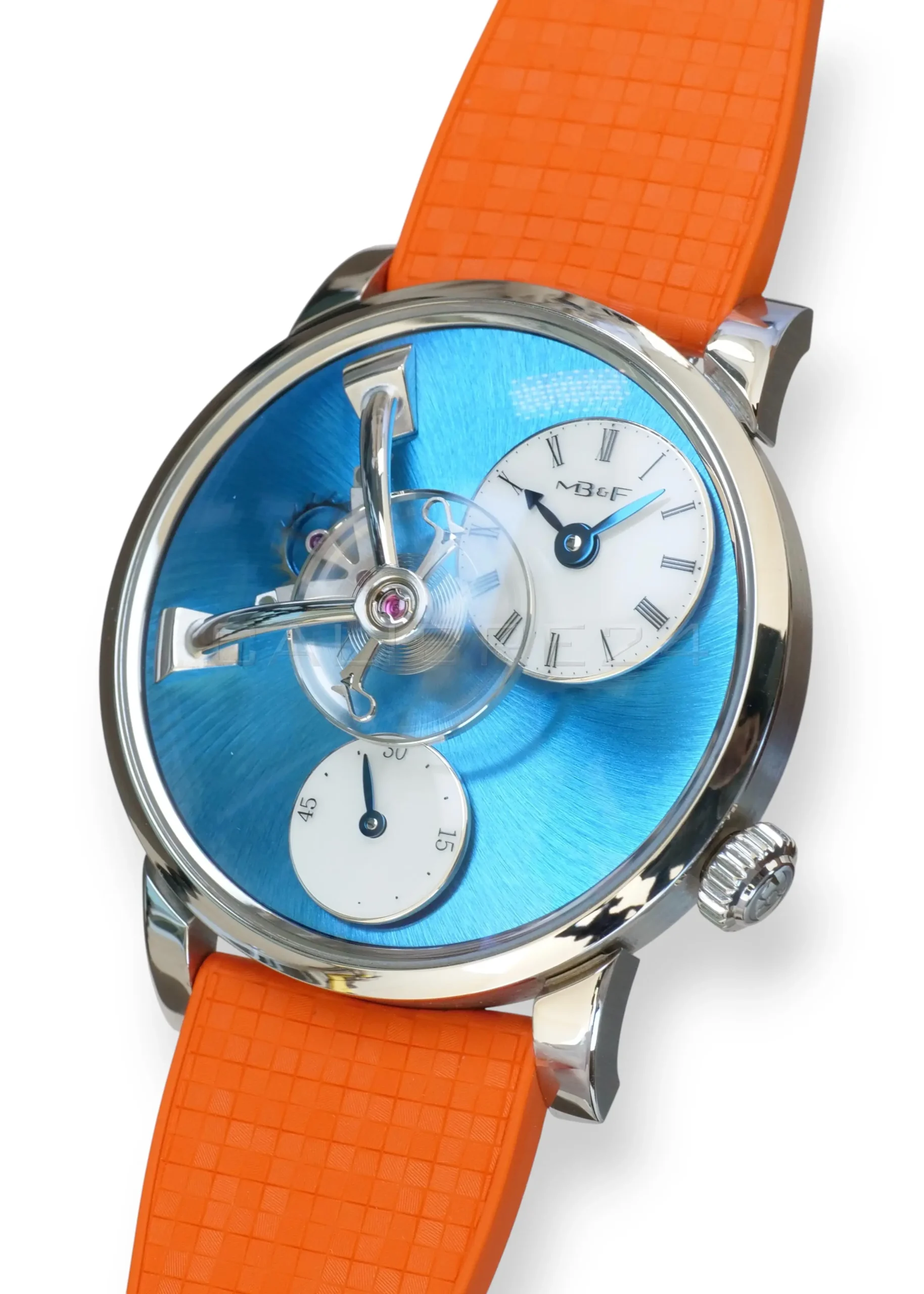 The LM101 is MB&F distilled to its essence: a celebration of traditional watchmaking reinterpreted through futuristic design. At its heart floats the suspended balance wheel, a kinetic sculpture that dominates the dial, reminding us that time is not just measured—it is lived. The vivid blue dial radiates depth and sophistication, while the daring orange strap injects a burst of modern energy, making this piece both avant‑garde and wearable.