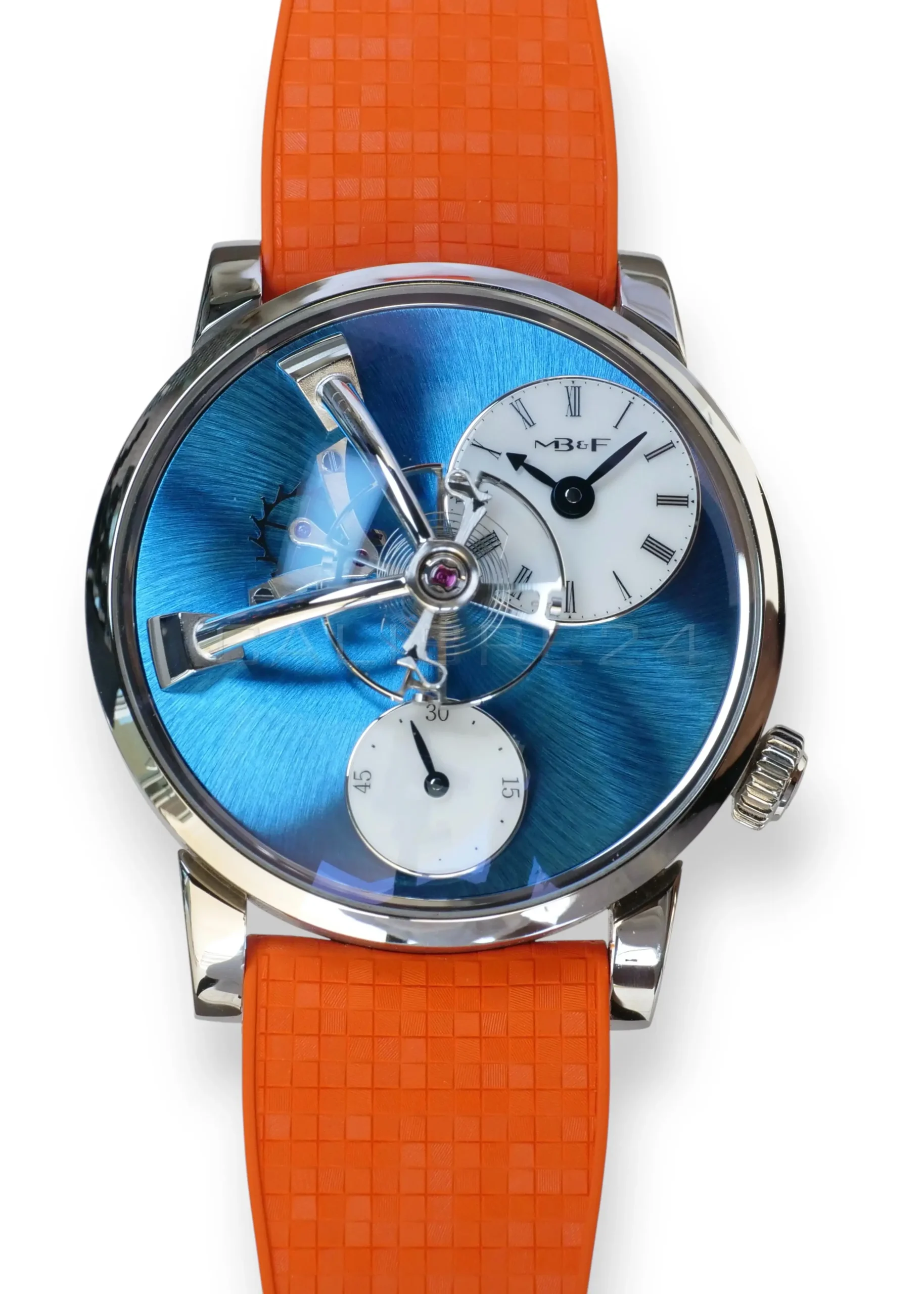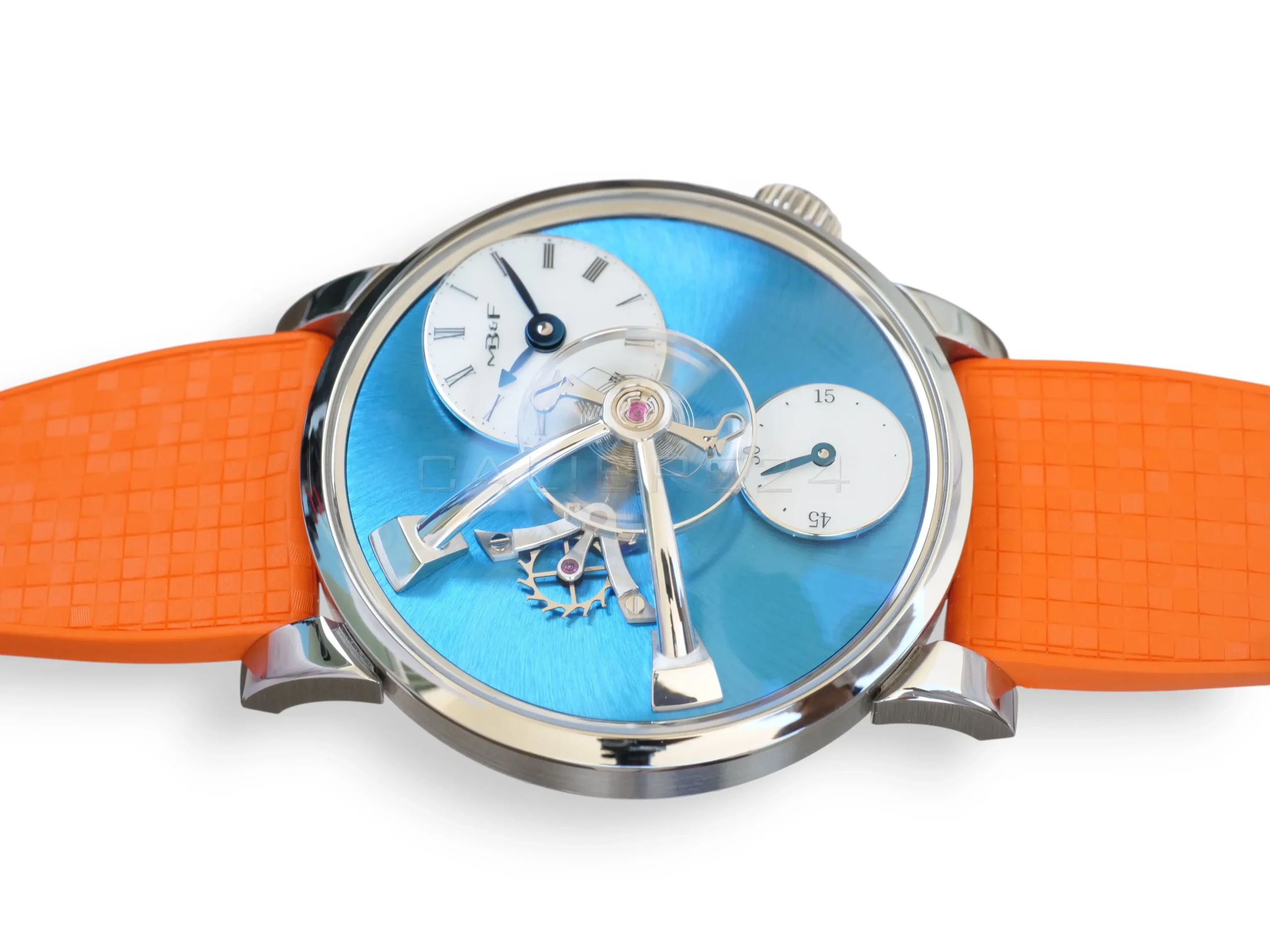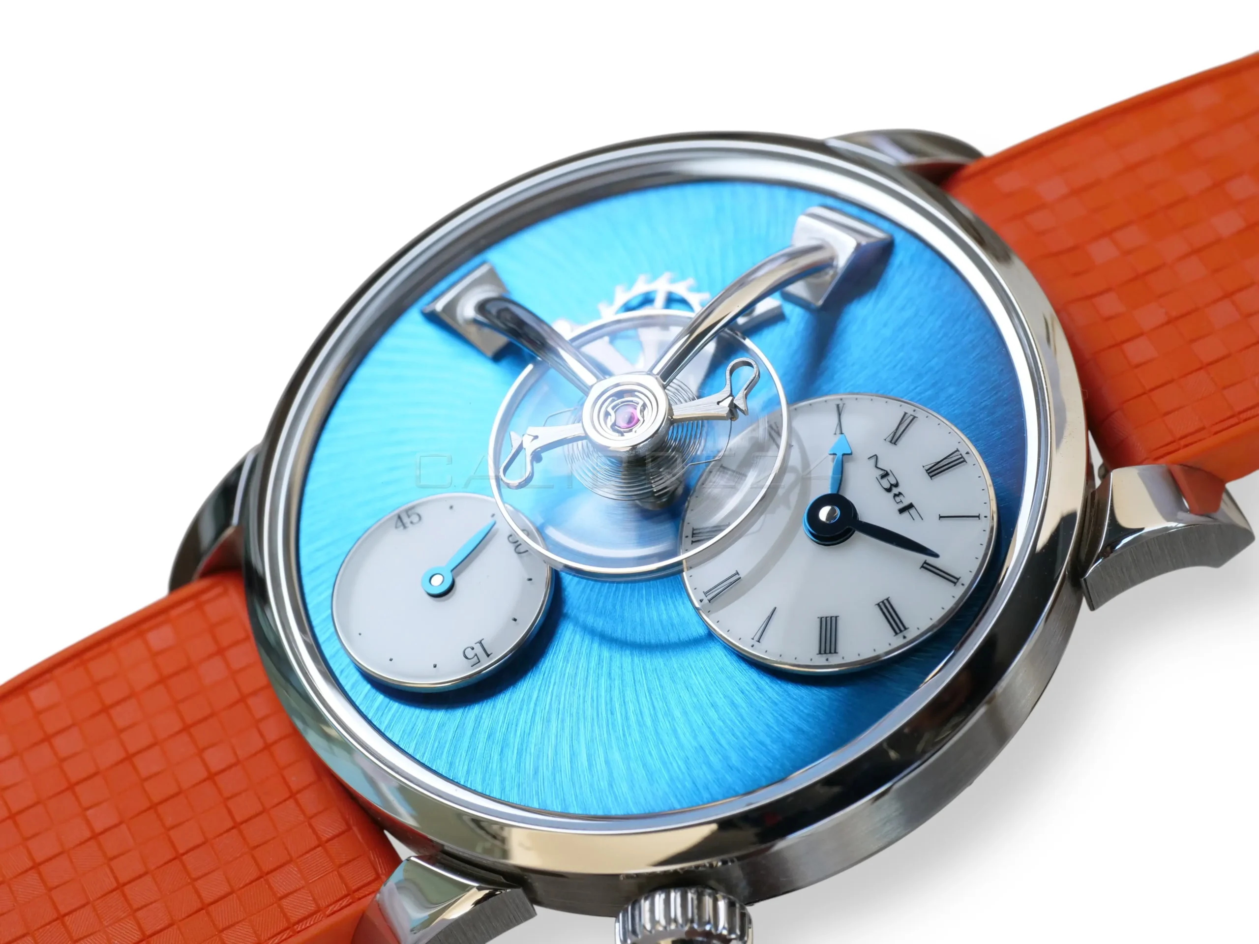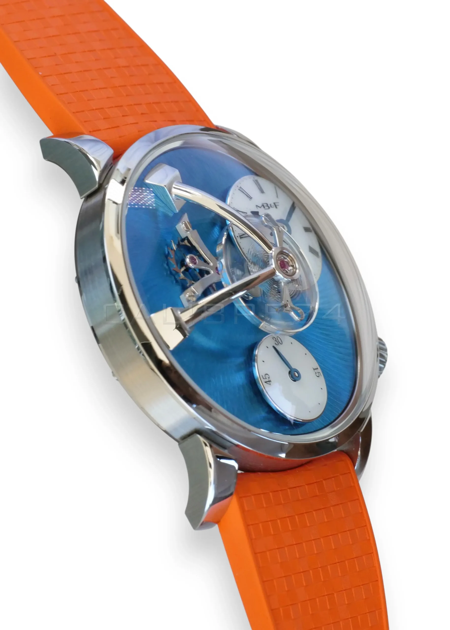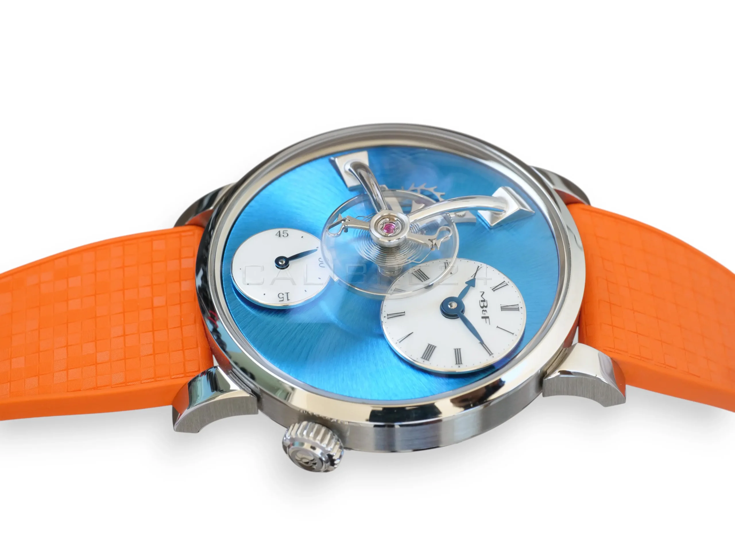 The LM101 is MB&F distilled to its essence: a celebration of traditional watchmaking reinterpreted through futuristic design. At its heart floats the suspended balance wheel, a kinetic sculpture that dominates the dial, reminding us that time is not just measured—it is lived. The vivid blue dial radiates depth and sophistication, while the daring orange strap injects a burst of modern energy, making this piece both avant‑garde and wearable.
