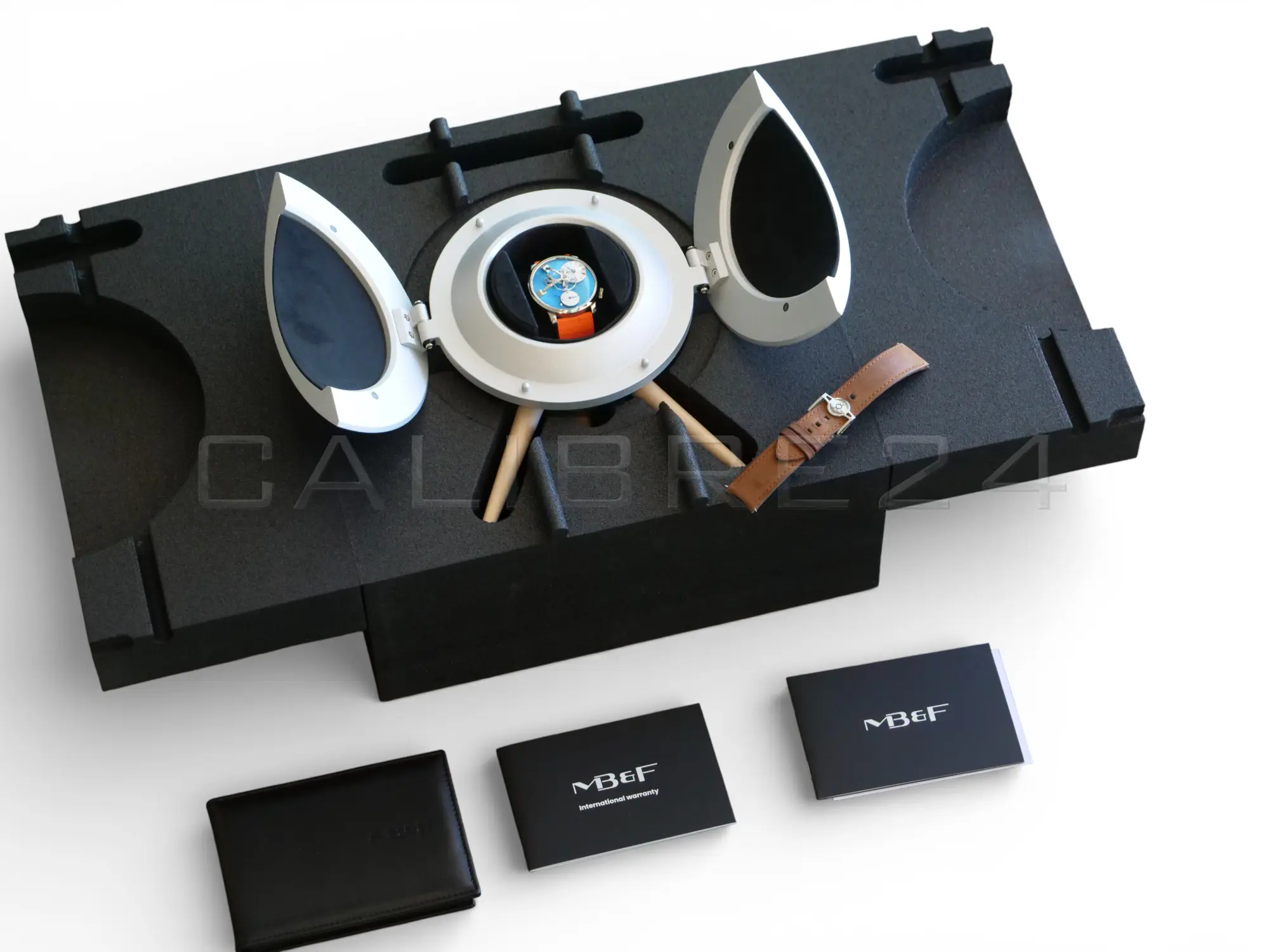 This MB&F Legacy Machine LM101 presents in Excellent & like-new condition, please refer to the photos to see the condition of the watch. The watch is offered as full set with factory boxes and papers dated 2024. The photos are taken on an aftermarket strap, but the original MB&F leather strap along with the double deployant clasp is included in the set, as can be seen in the photos. The timepiece is still under manufacturer warranty, at the time of listing.