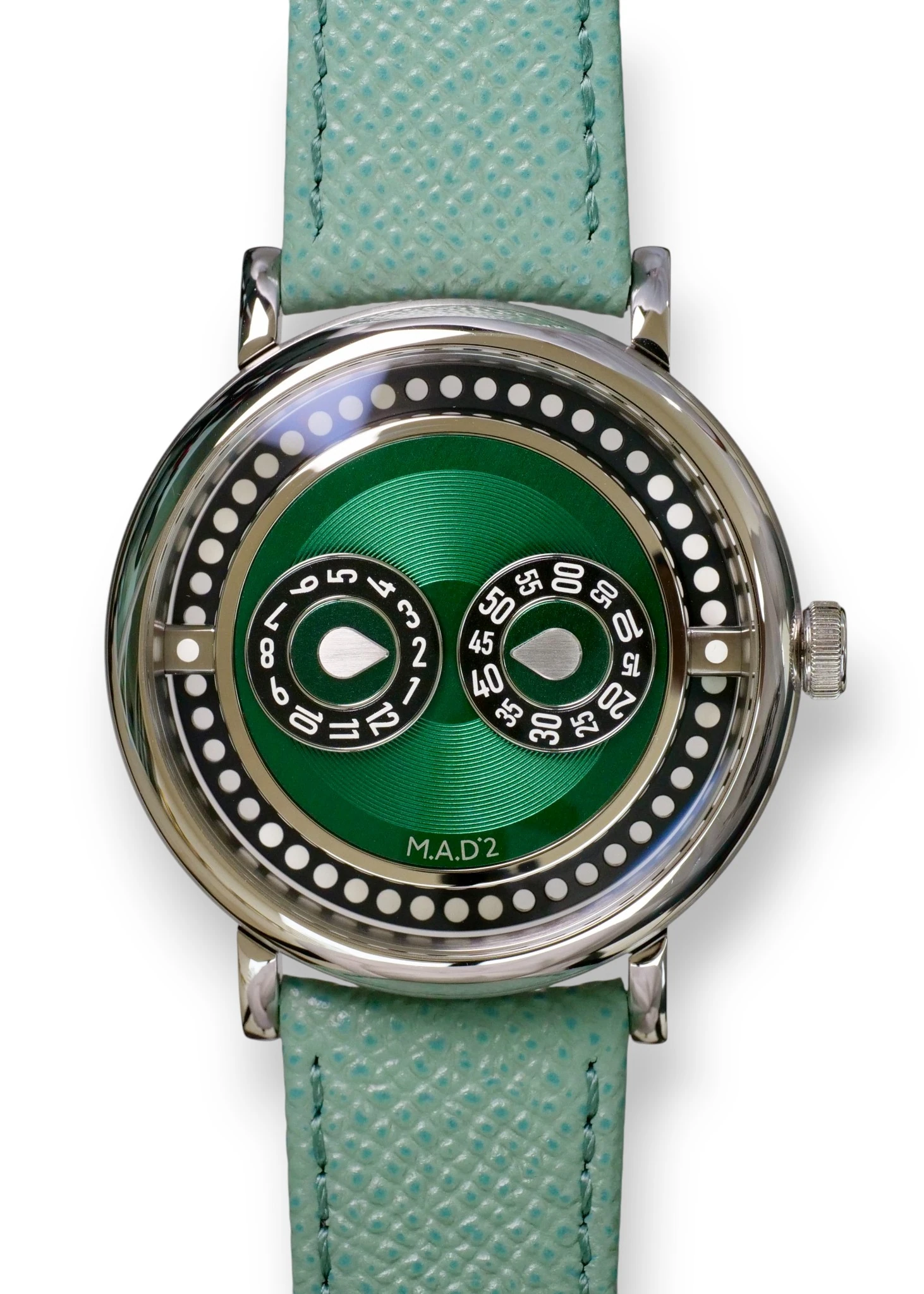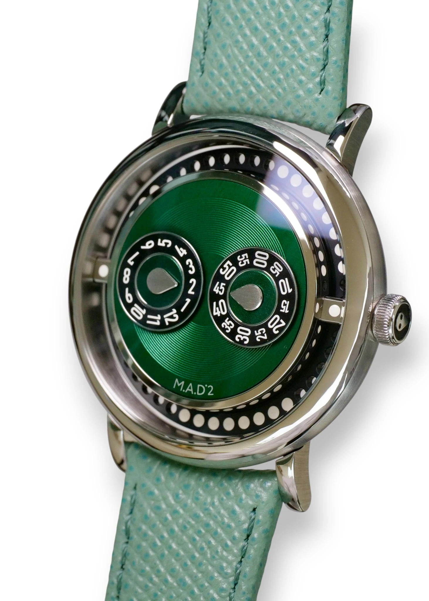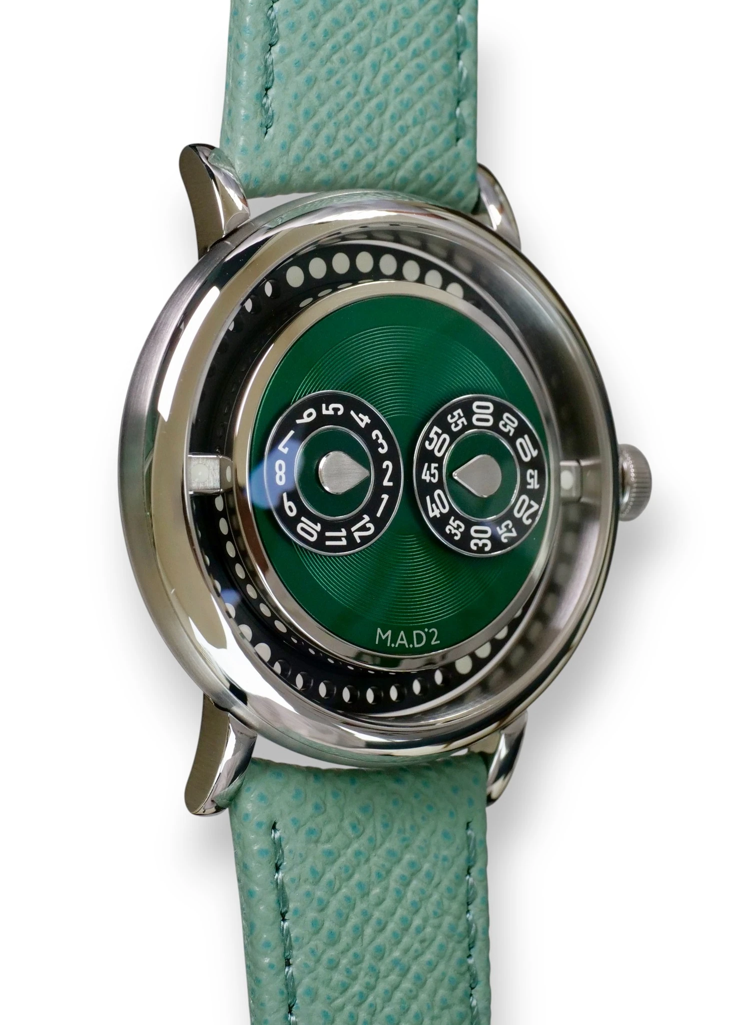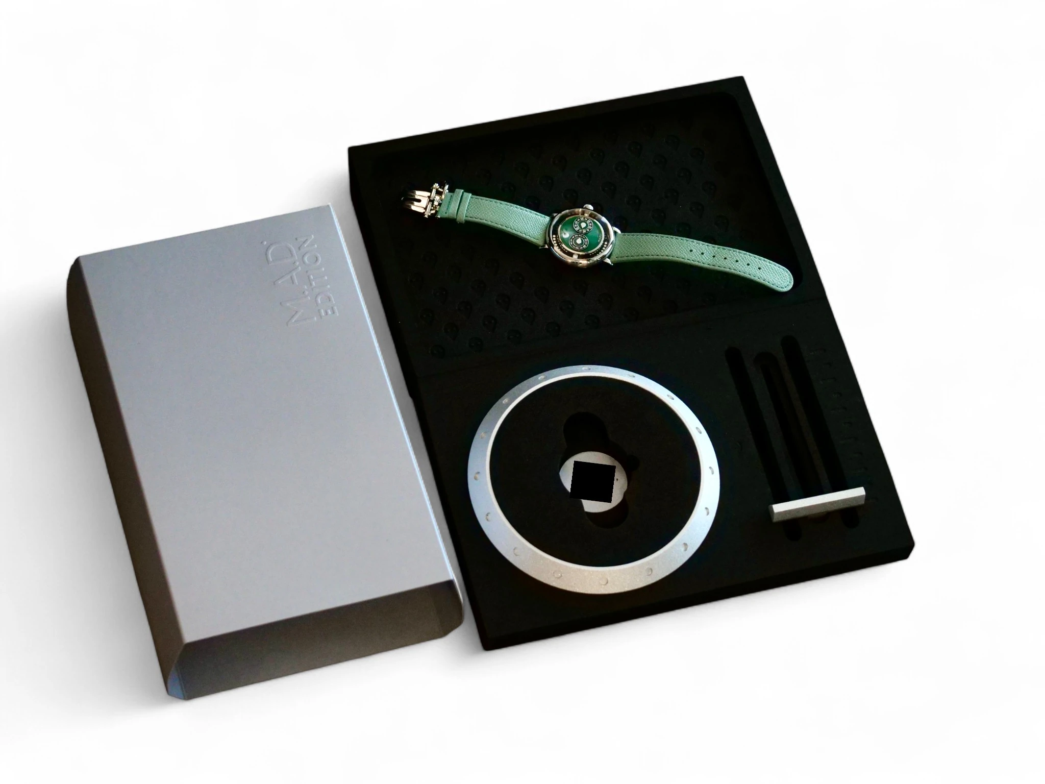 The M.A.D.2 Green is a striking realization of the M.A.D. Editions vision, merging playful engineering with contemporary aesthetics. Crafted by Eric Giroud and overseen by MB and F, its pebble-shaped stainless steel case offers an arresting ergonomic presence on the wrist, while the vivid green dial is unmistakably vibrant yet refined. At its core is a rotor-driven automatic movement, featuring a hidden jumping hour complication that rewards only the attentive owner. The watch thoughtfully balances avant-garde design with legibility and comfort, placing it as a distinct object within modern horology. Its limited availability, accessible only via a collector raffle, enhances its allure among knowledgeable enthusiasts. The M.A.D.2 Green is a nuanced celebration of independent watchmaking, demonstrating innovation at a welcoming price point without compromise on intrigue.MB&F M.A.D. Editions M.A.D.2 Green Dial timepiece, presenting in Mint condition, dated 2025.