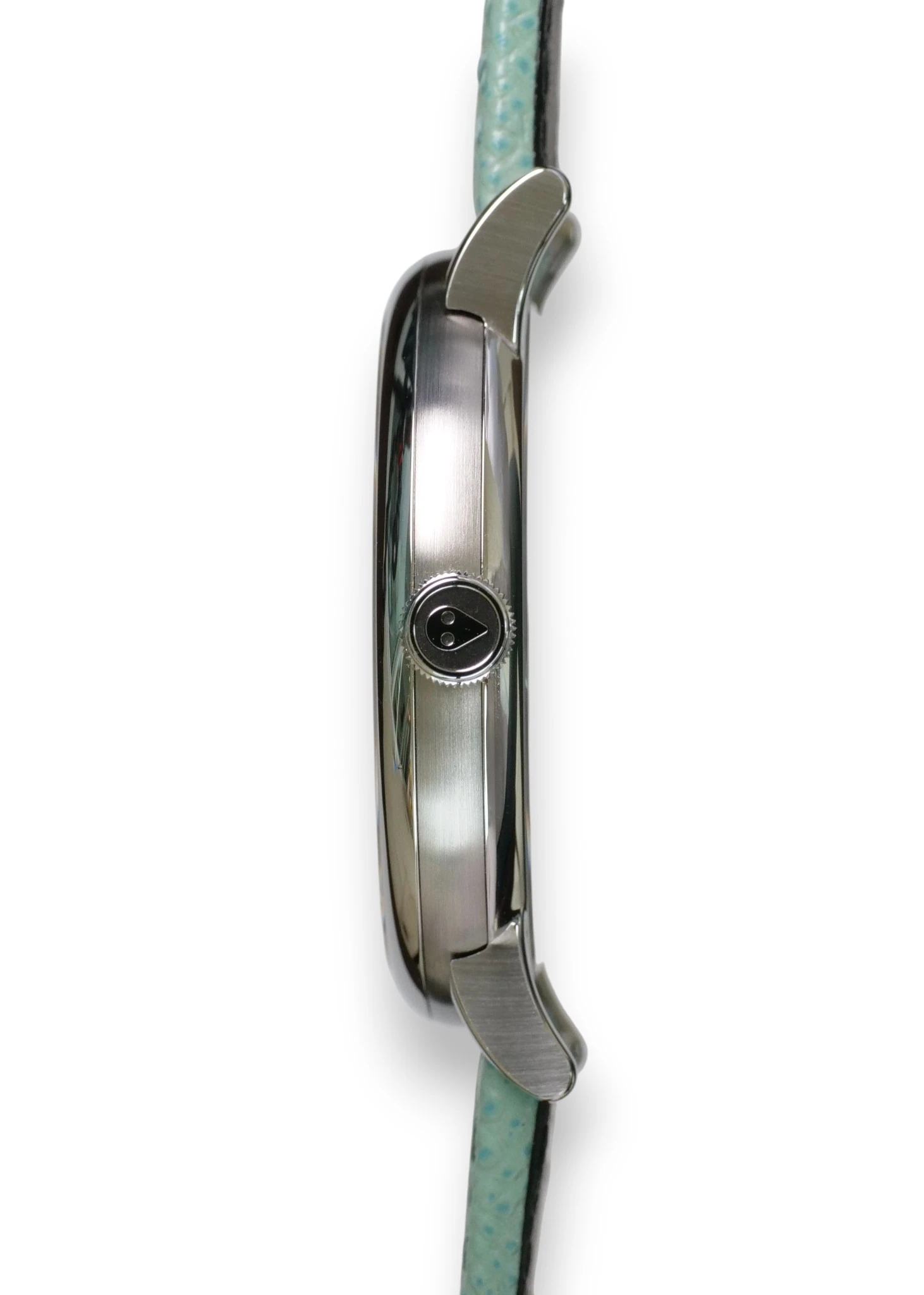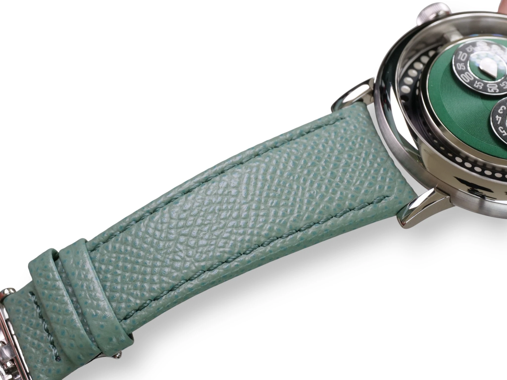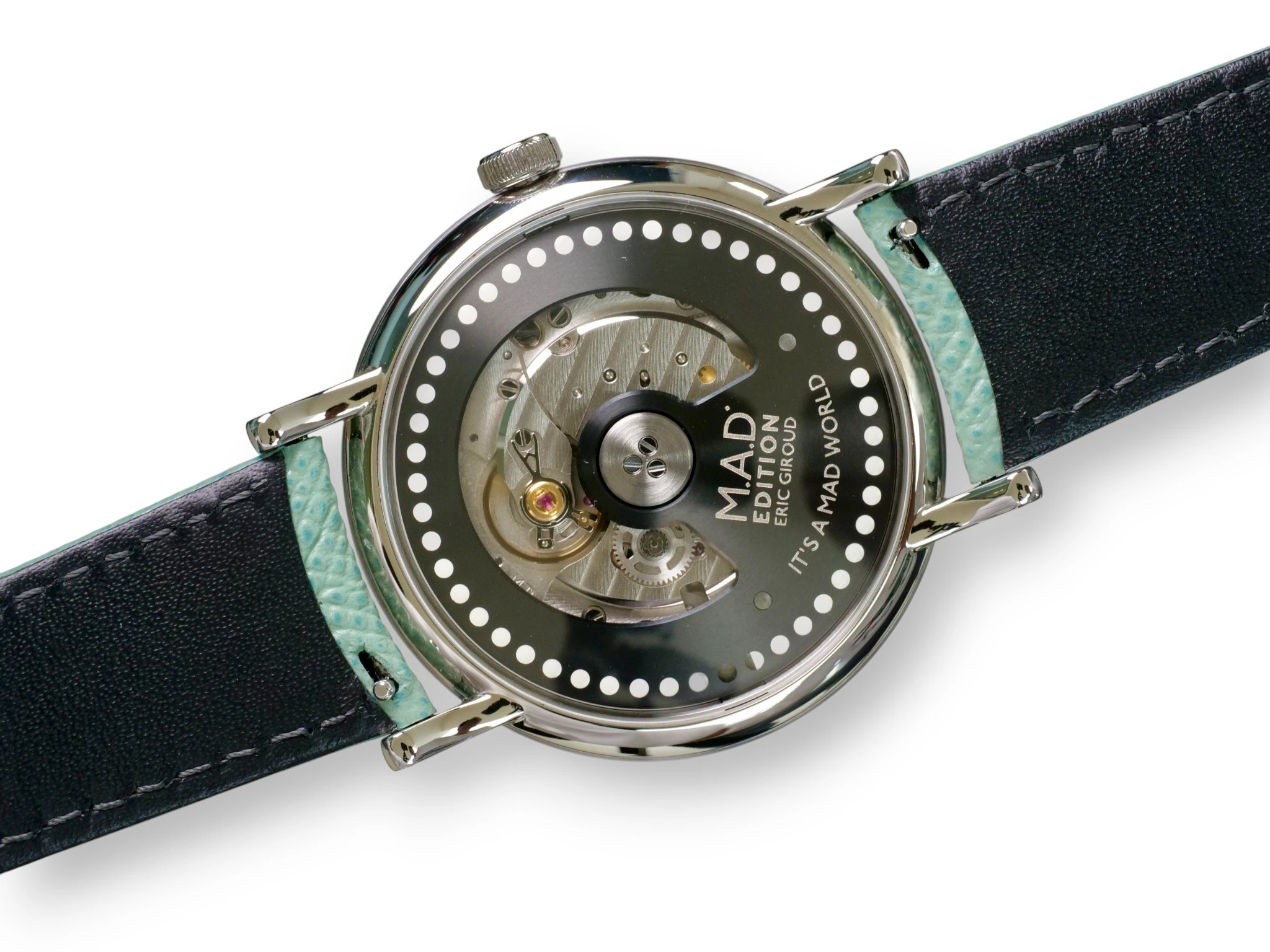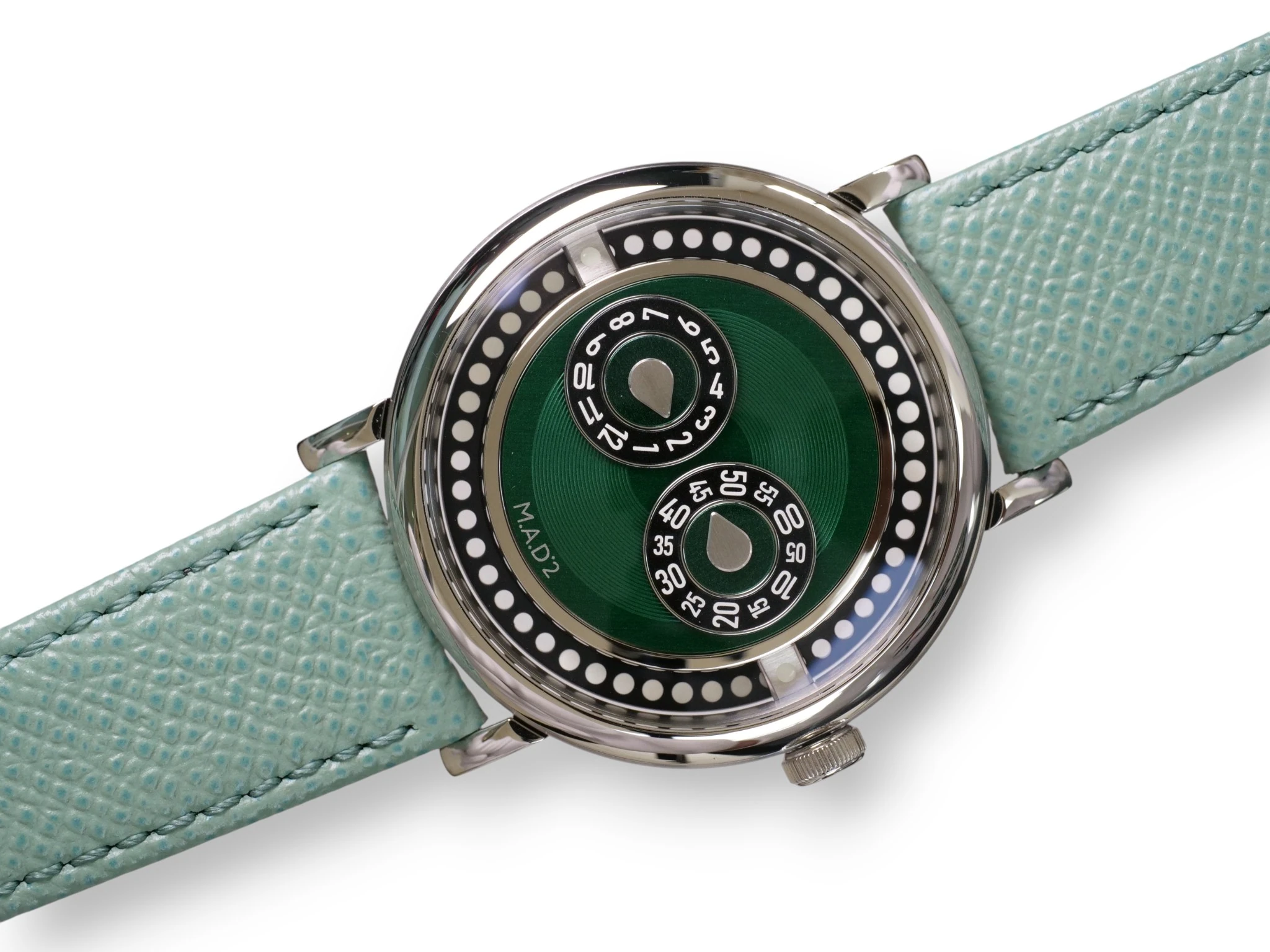 The M.A.D.2 Green is a striking realization of the M.A.D. Editions vision, merging playful engineering with contemporary aesthetics. Crafted by Eric Giroud and overseen by MB and F, its pebble-shaped stainless steel case offers an arresting ergonomic presence on the wrist, while the vivid green dial is unmistakably vibrant yet refined. At its core is a rotor-driven automatic movement, featuring a hidden jumping hour complication that rewards only the attentive owner. The watch thoughtfully balances avant-garde design with legibility and comfort, placing it as a distinct object within modern horology. Its limited availability, accessible only via a collector raffle, enhances its allure among knowledgeable enthusiasts. The M.A.D.2 Green is a nuanced celebration of independent watchmaking, demonstrating innovation at a welcoming price point without compromise on intrigue.MB&F M.A.D. Editions M.A.D.2 Green Dial timepiece, presenting in Mint condition, dated 2025.