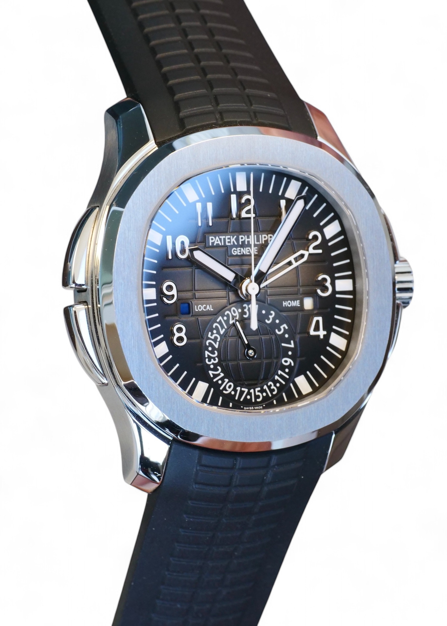 This year, the Patek Philippe Aquanaut Travel Time 5164A was discontinued in stainless steel and was replaced by the white gold model reference 5164G with blue dial, making this stainless steel model a very collectible and sought after timepiece, with the dual time 5164’s now made by Patek only in white gold and rose gold.