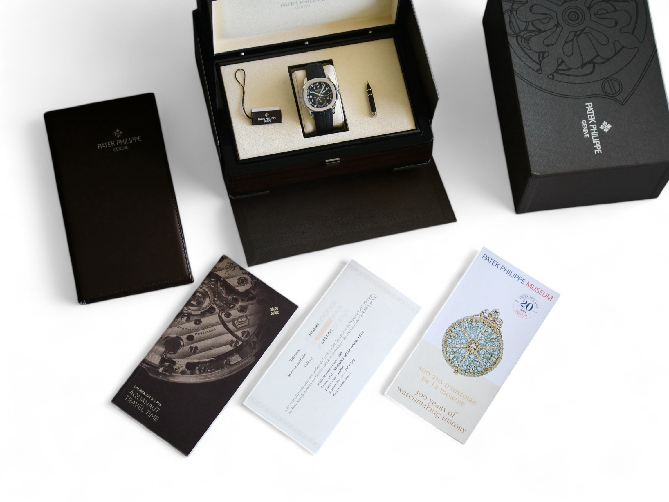 This Patek Philippe Aquanaut Travel Time comes in Mint and unpolished/factory-finish condition and is delivered with the new-style Patek deployant clasp with Patek logo on the inner side. The watch comes complete with factory presentation boxes and papers, Patek pusher/pen and hangtag. The watch is dated Q4 2021 and is one of the last ones produced before Patek discontinued this model in early 2024.