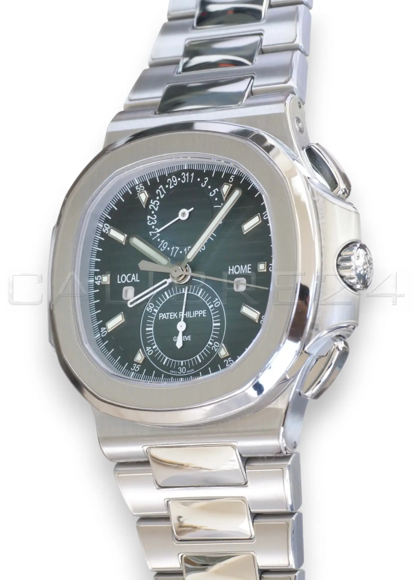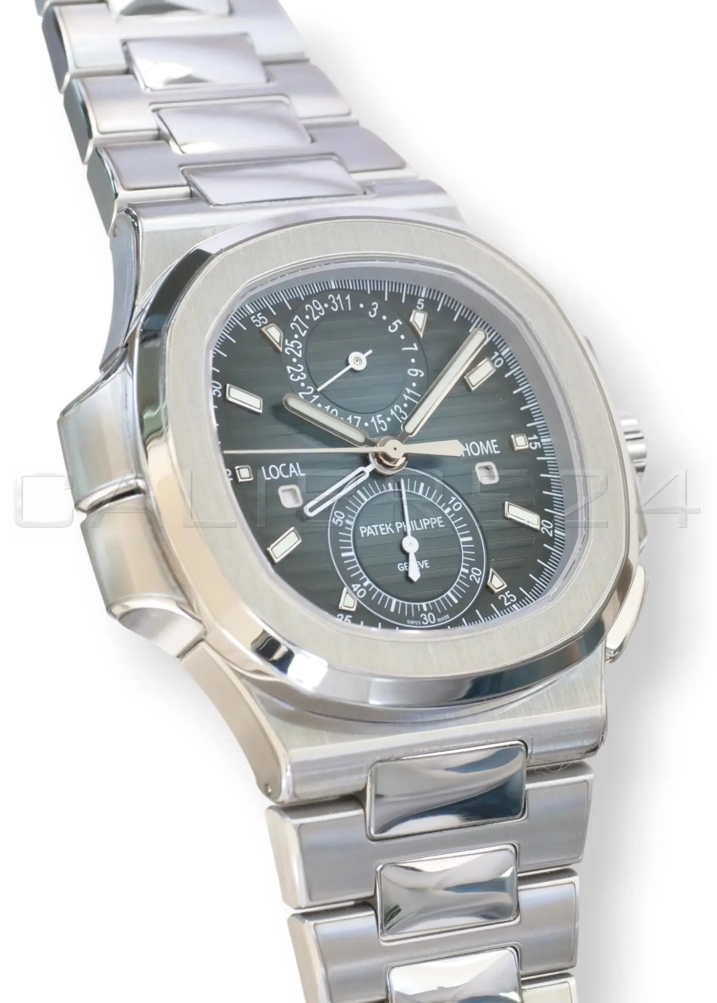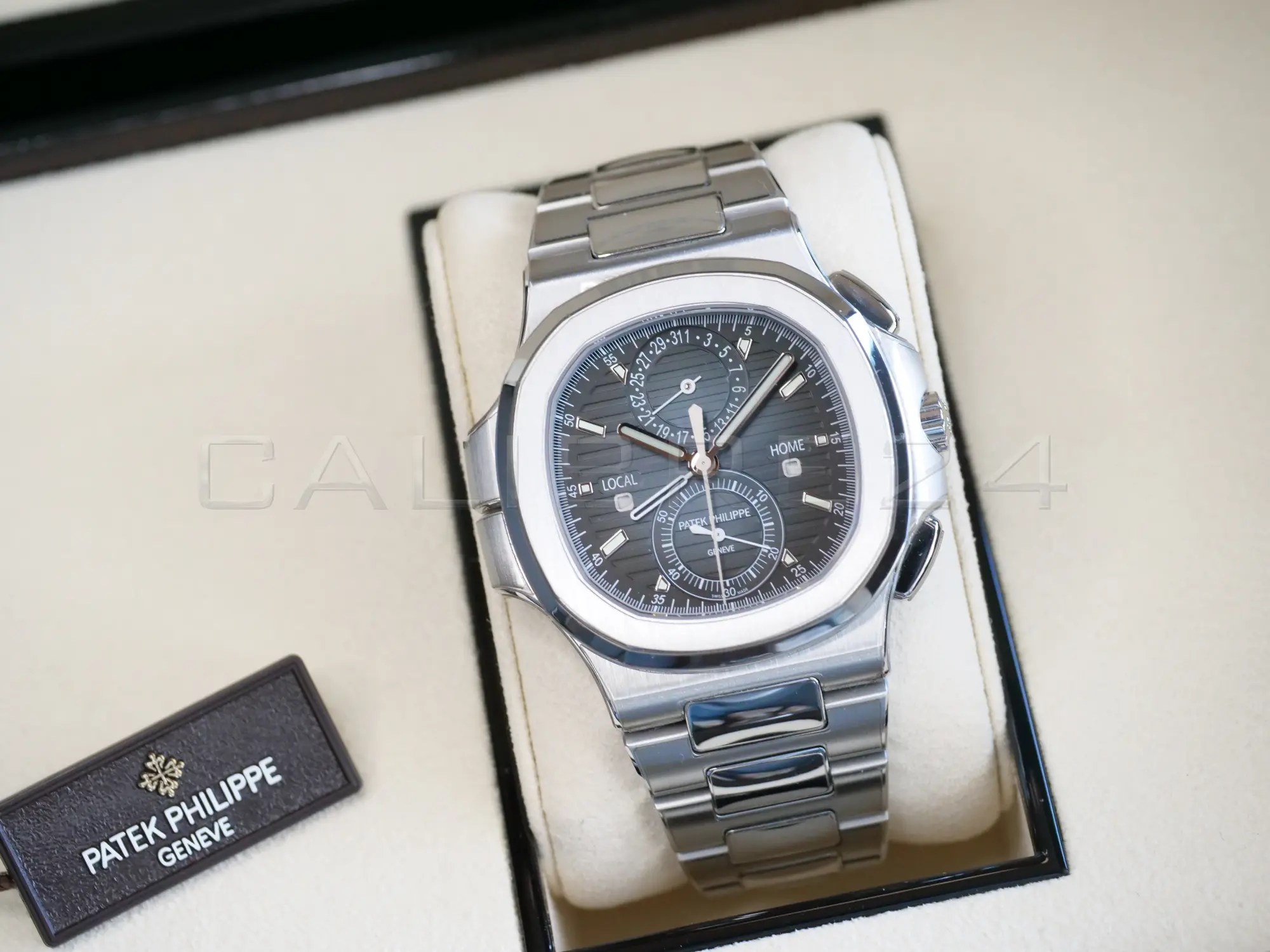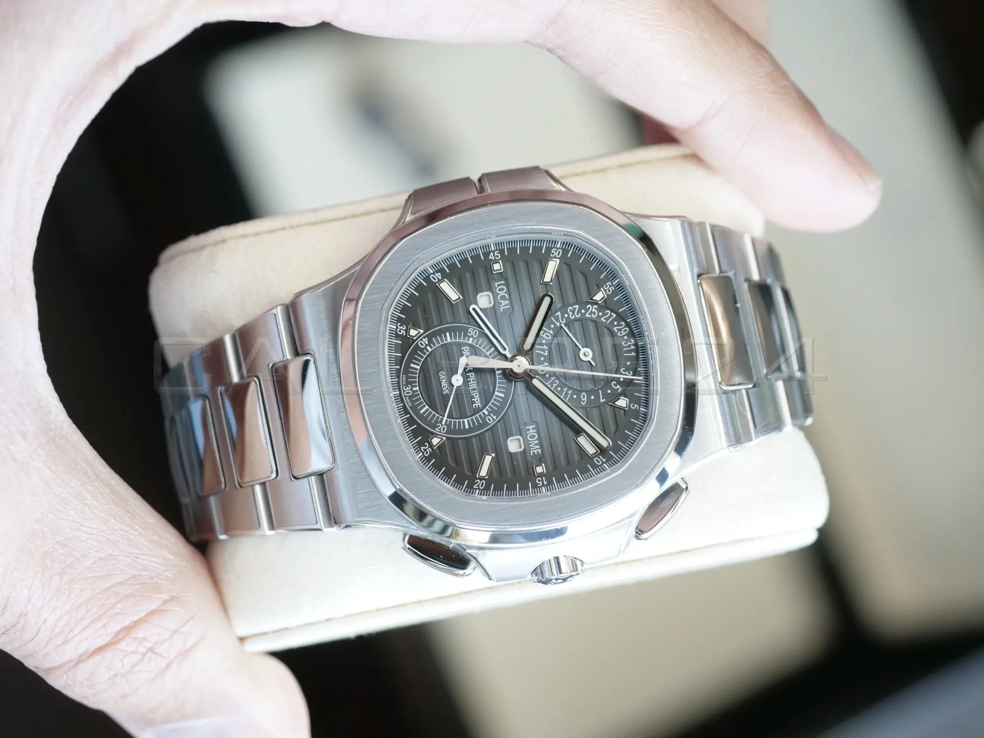 - Dual time zone + chronograph complication – rare combination in the Nautilus line