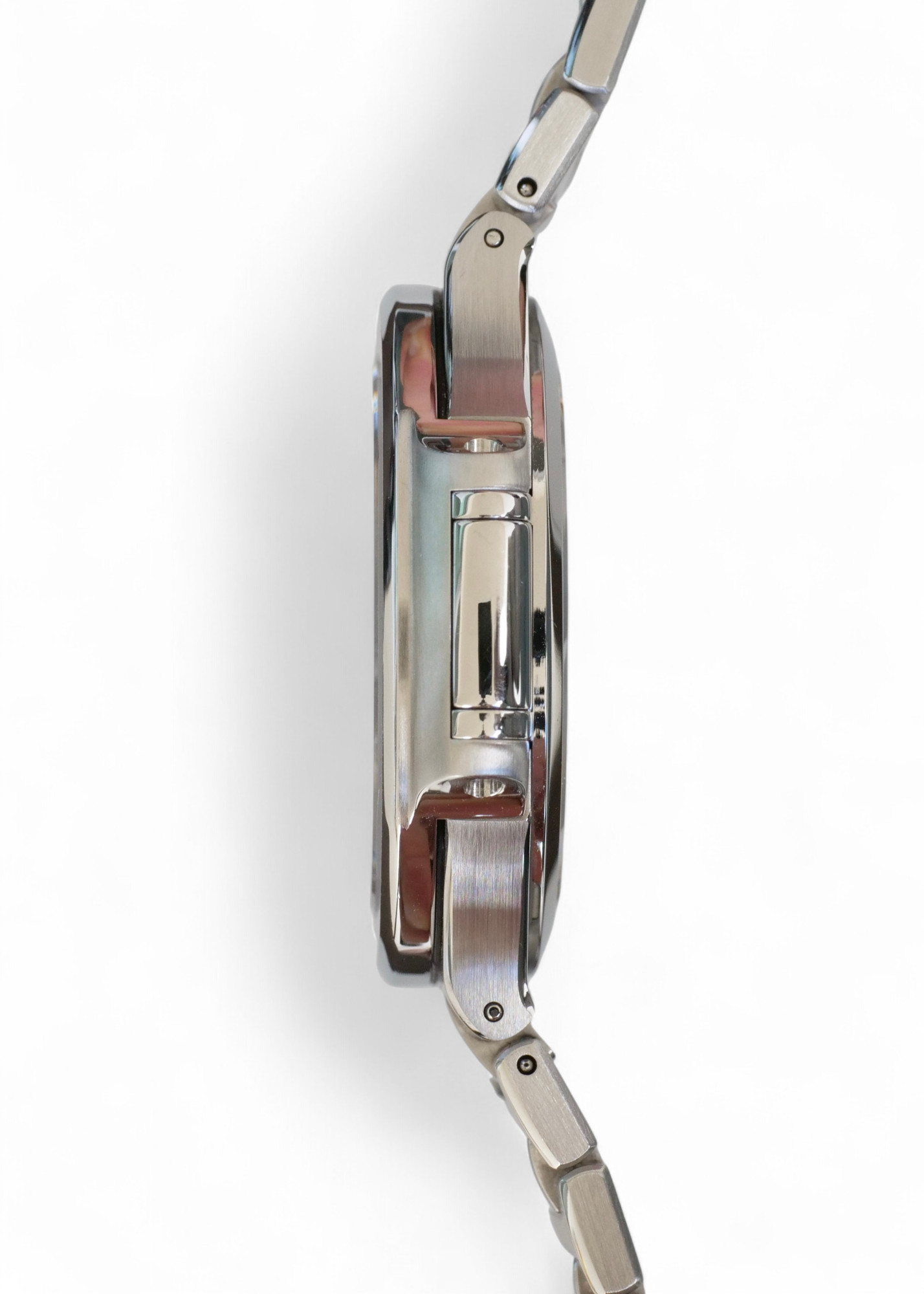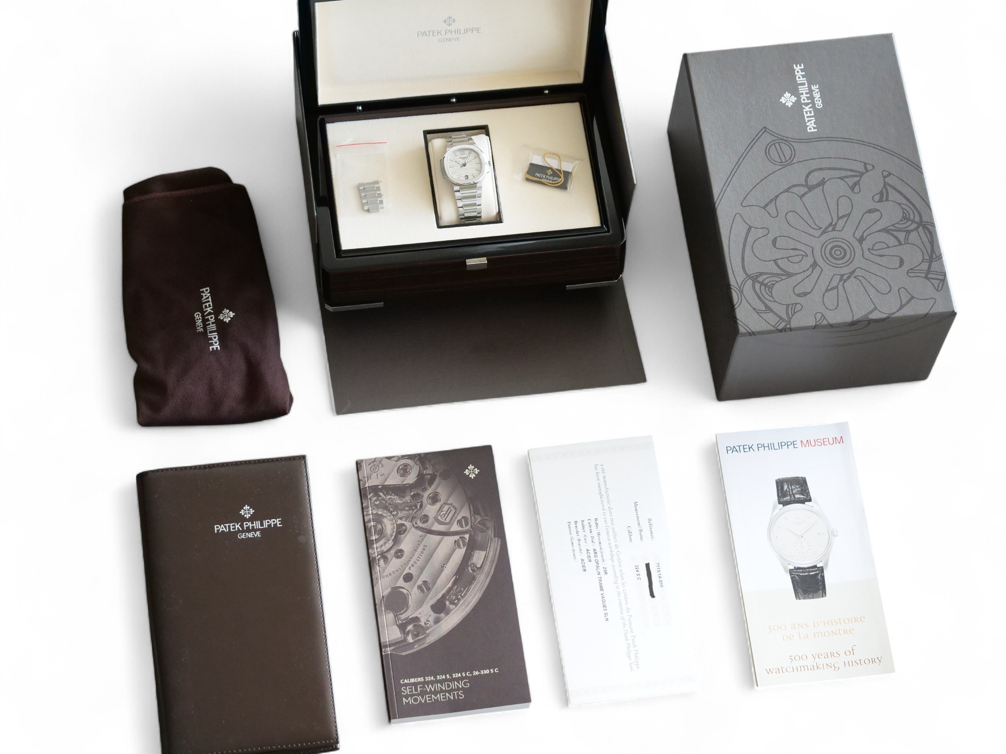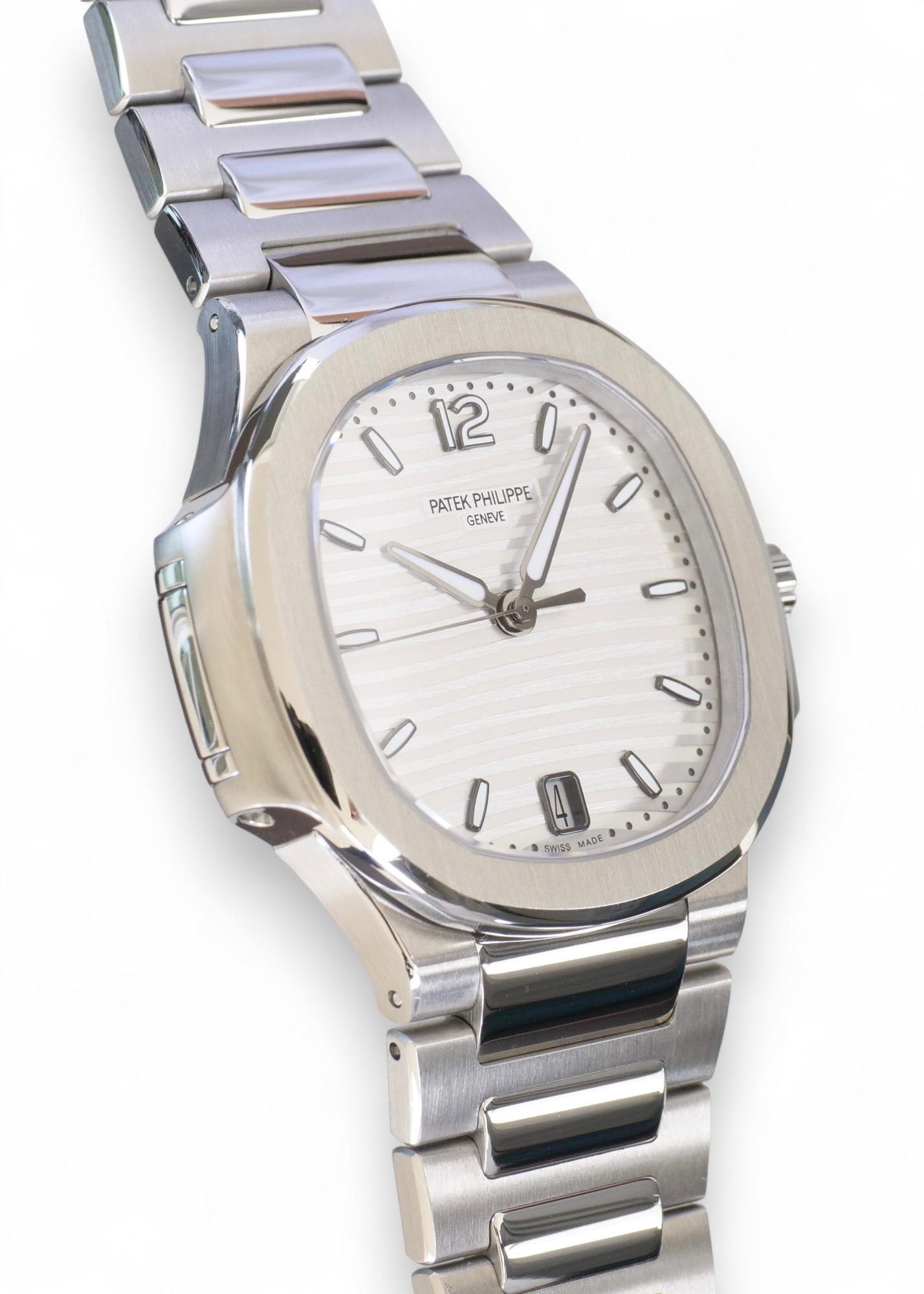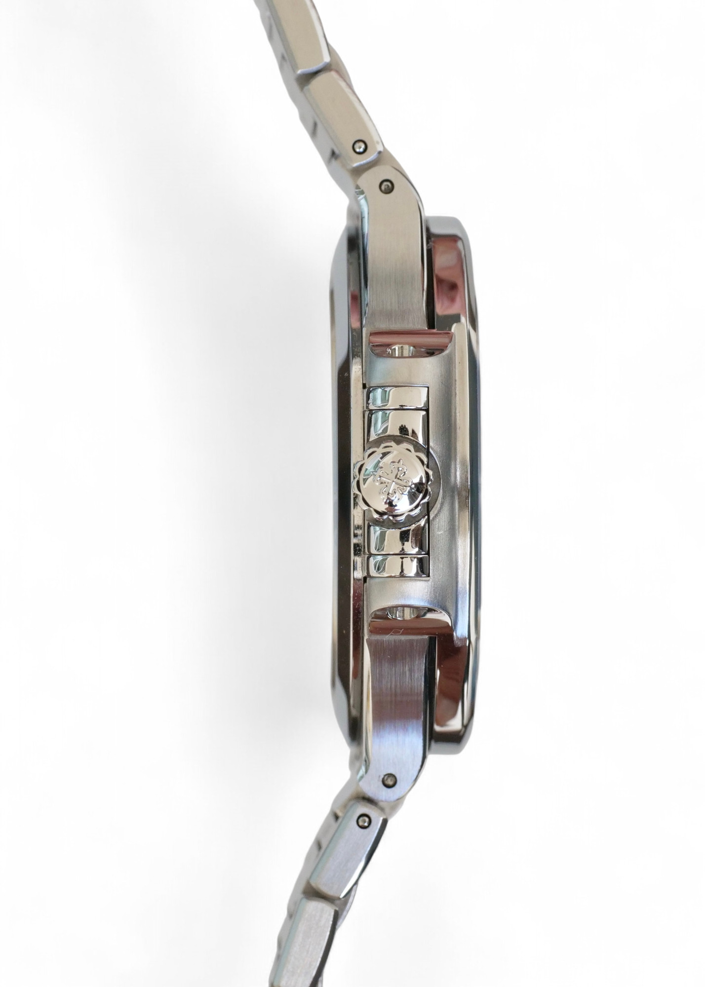 Launched in 2015, the 35.2mm model with the case thickness of only 8.62mm continues the brand’s legacy, featuring a stunning white dial that captures light beautifully and enhances its sophisticated look, a sturdy stainless steel case and bracelet, exuding a sense of durability and understated luxury, and the iconic Nautilus design elements, such as the rounded octagonal bezel and integrated bracelet, make it instantly recognizable.