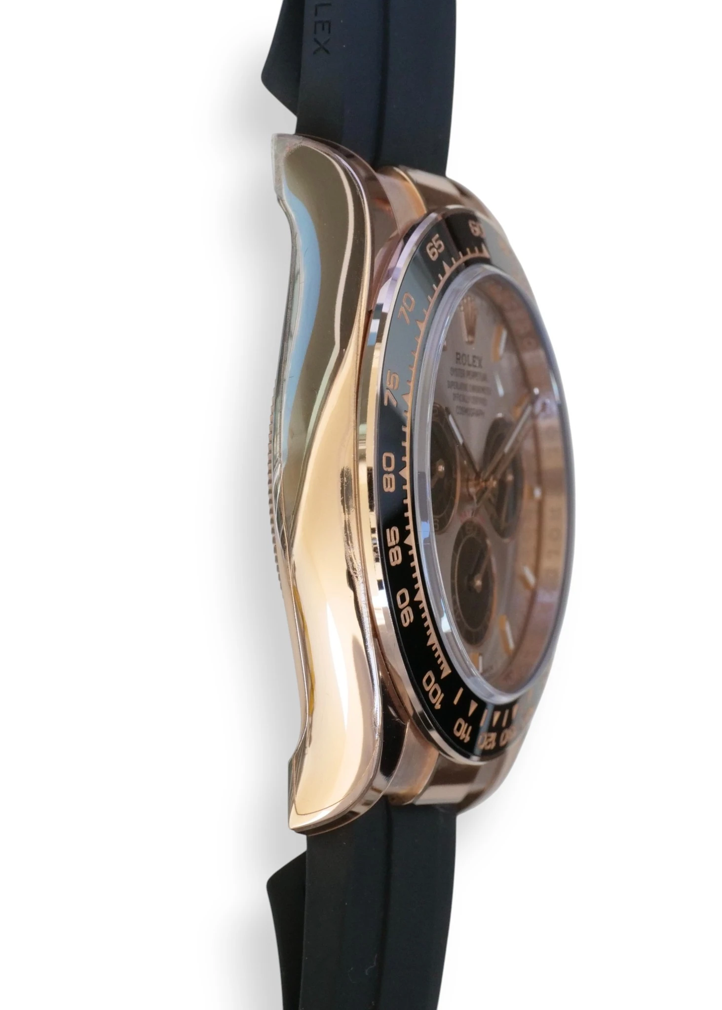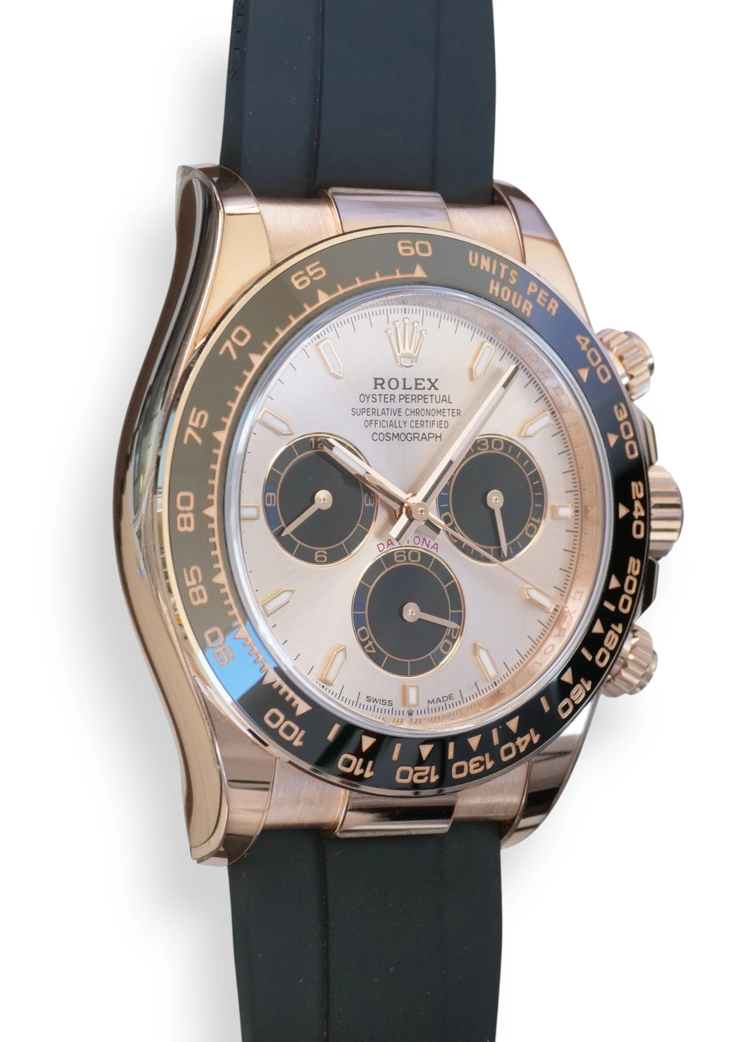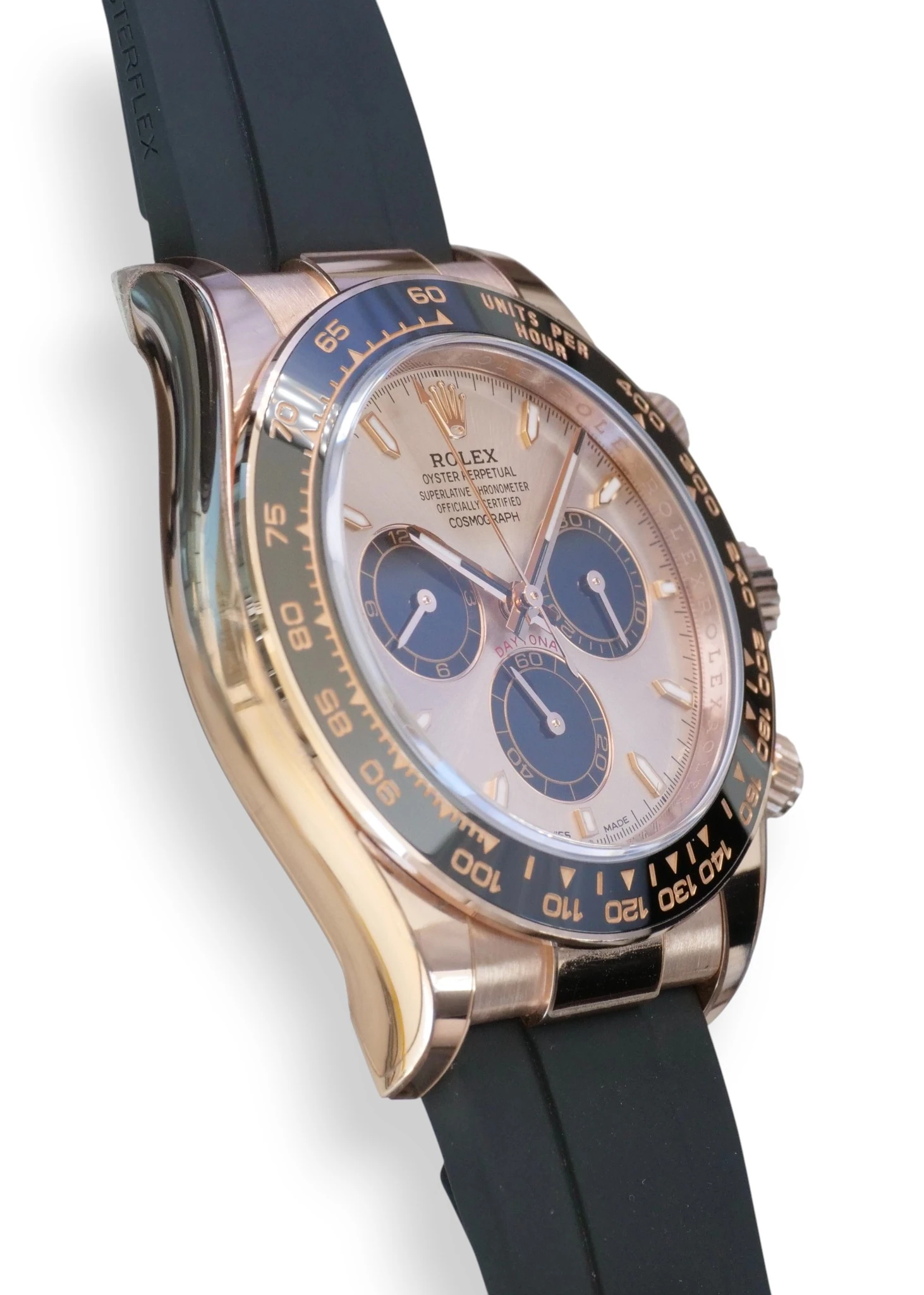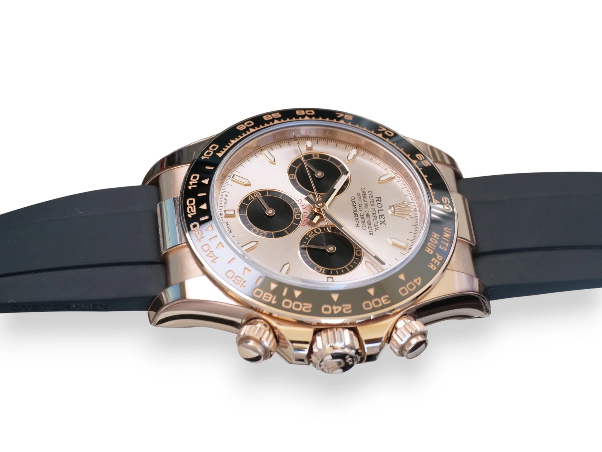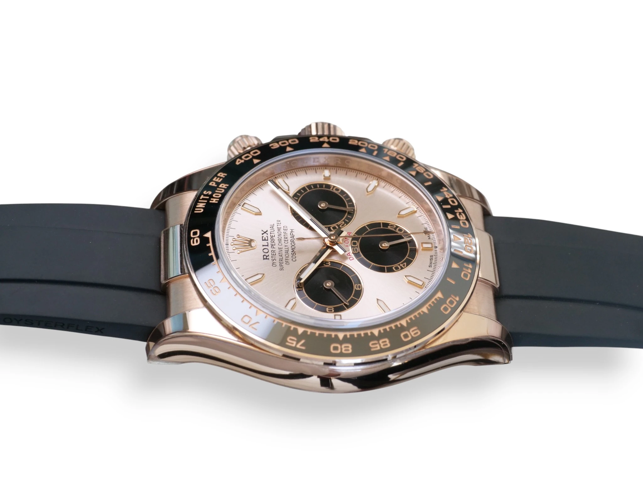 Rolex Cosmograph Daytona, in Sundust and Bright Black dial, 18ct Everose gold case with an Oysterflex bracelet, model reference 126515LN; one of the most sought after and desirable watches in the Daytona range, on the market.