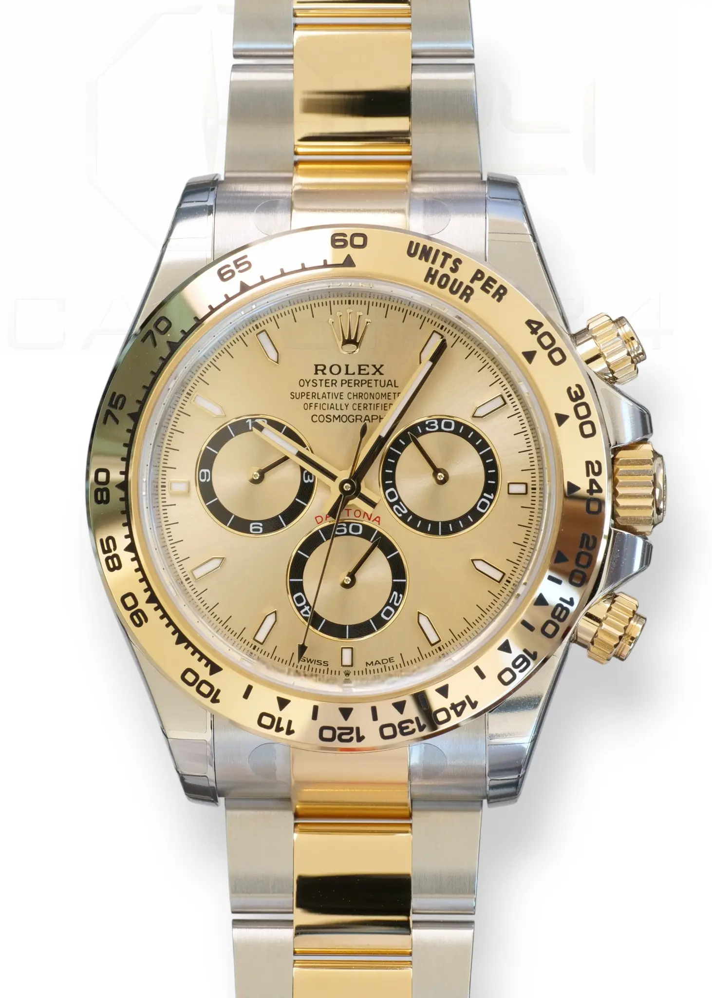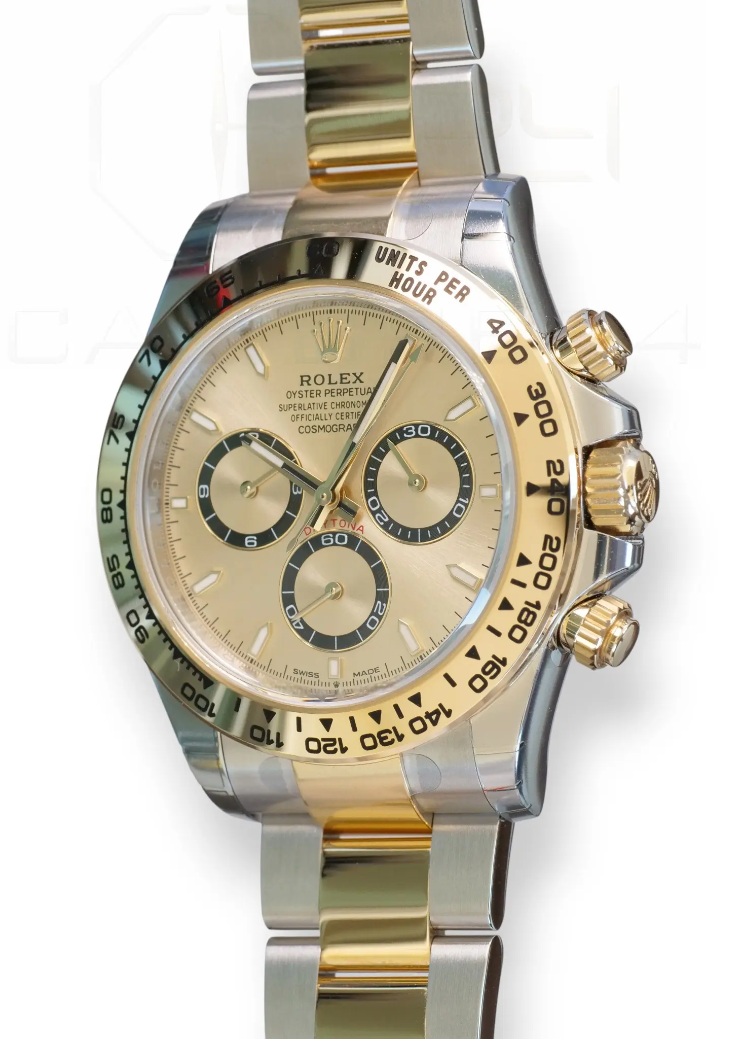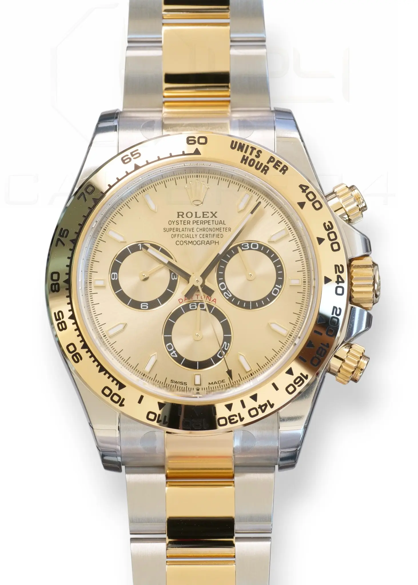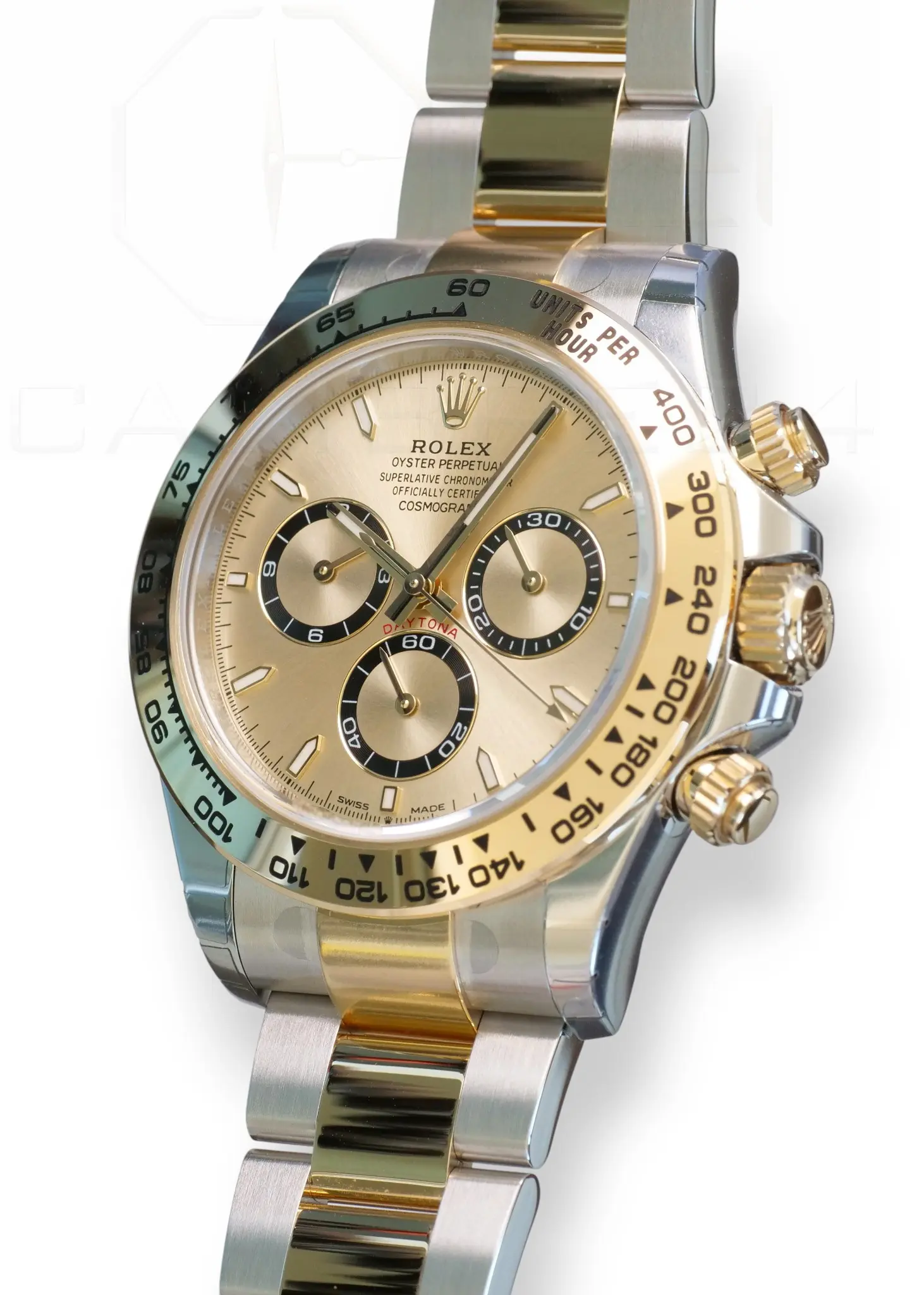 Rolex Cosmograph Daytona two-tone 126503 Champagne Dial, the latest model, with an 18ct yellow gold bezel and an upgraded movement with 72 hours of power reserve.