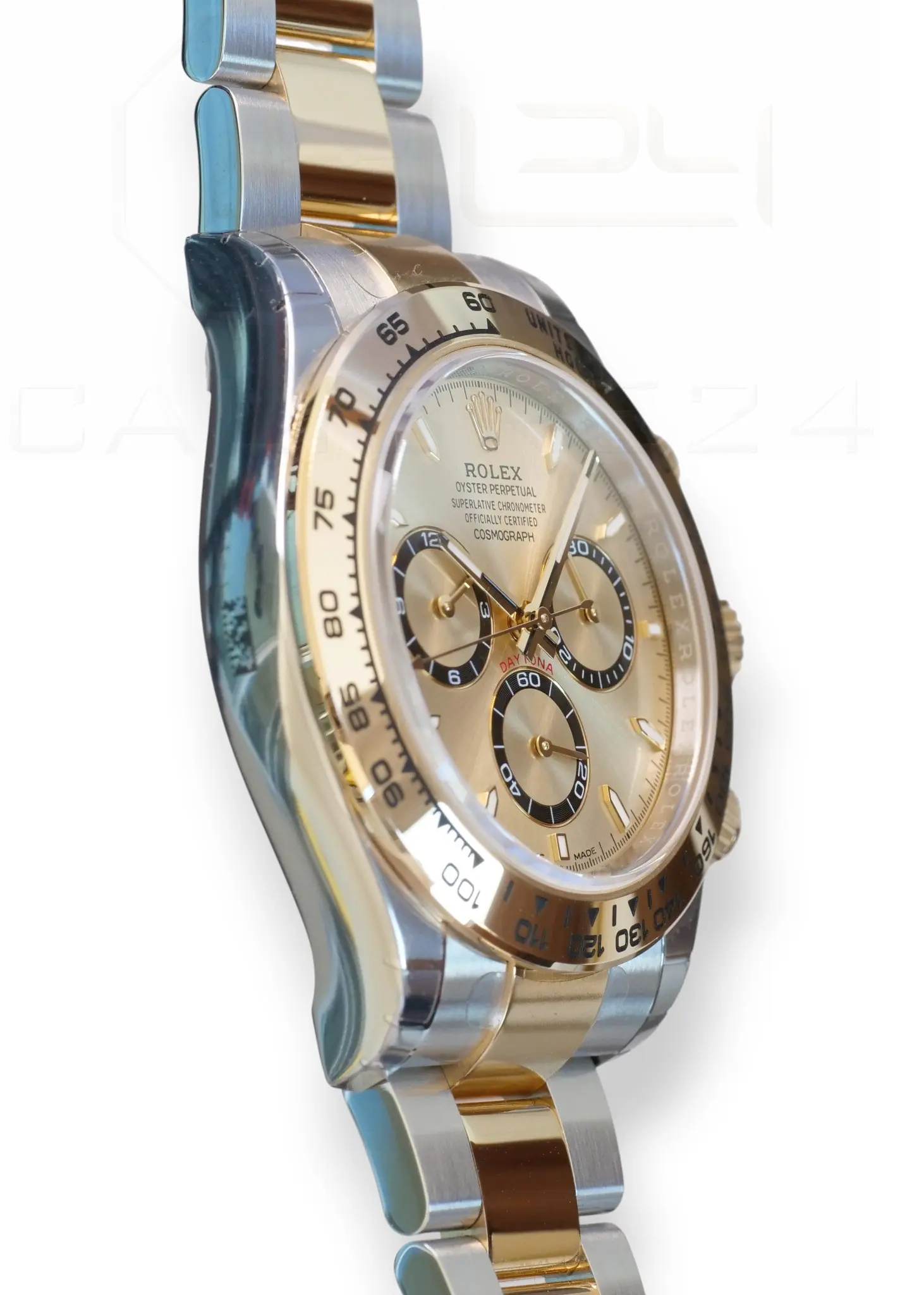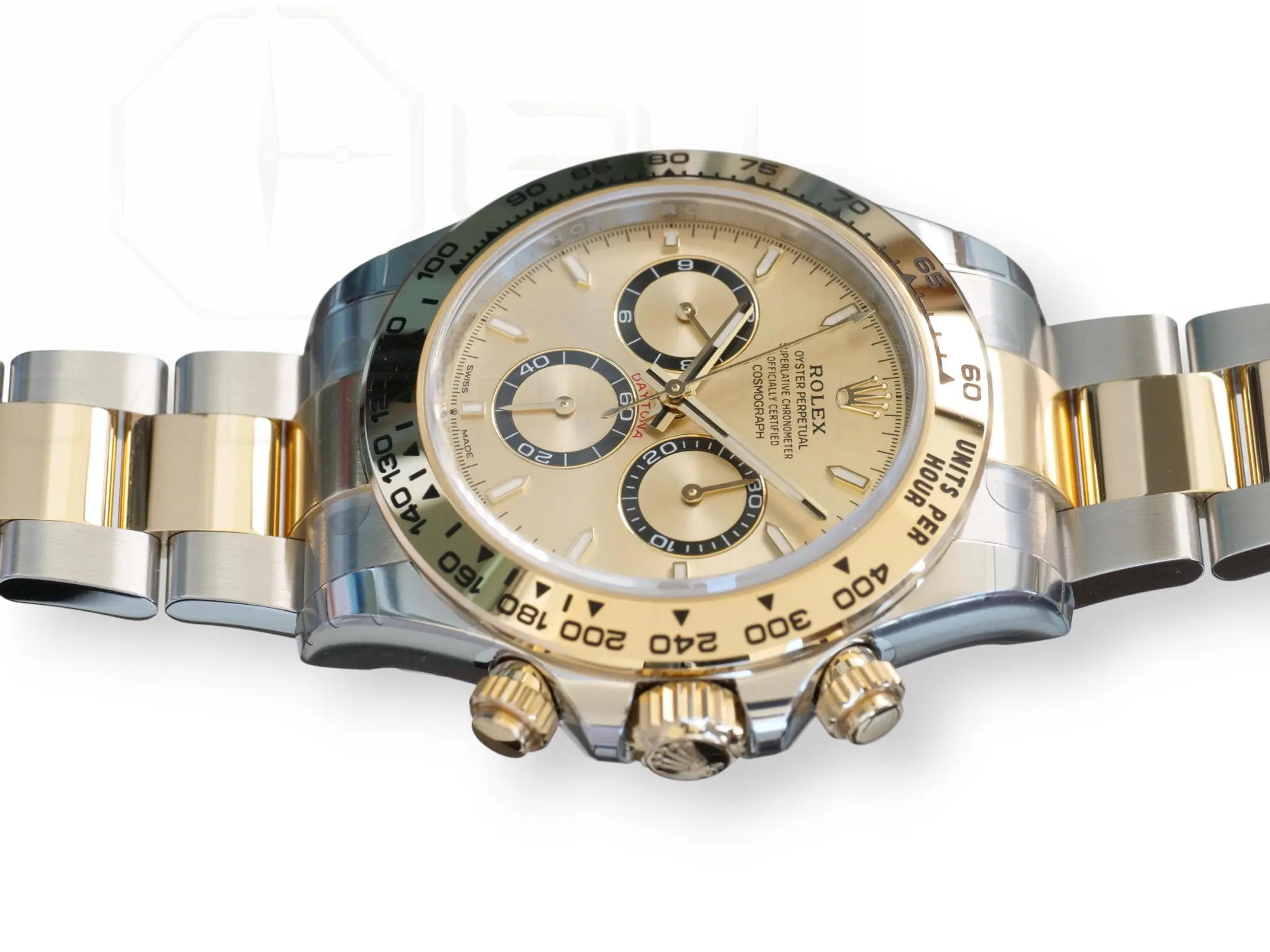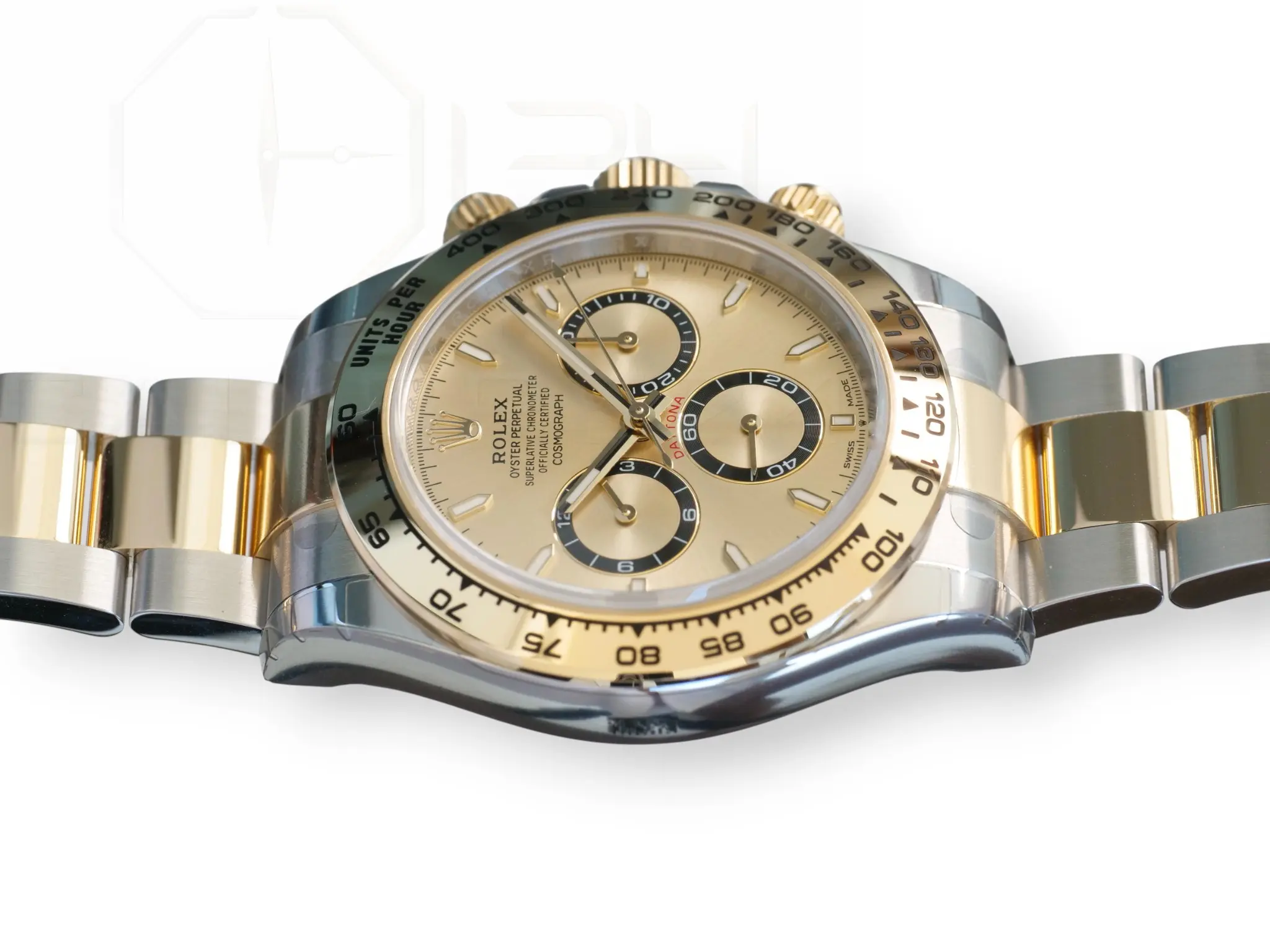 Please note that we don’t use catalog photos rather all the photos on this listing are taken from the actual Rolex Cosmograph Daytona two-tone 126503 Champagne Dial timepiece for sale and are our intellectual property across all our platforms. The photos showcase the very timepiece that is available for sale i.e. what you see is exactly what you will receive, shall you wish to purchase this timepiece.