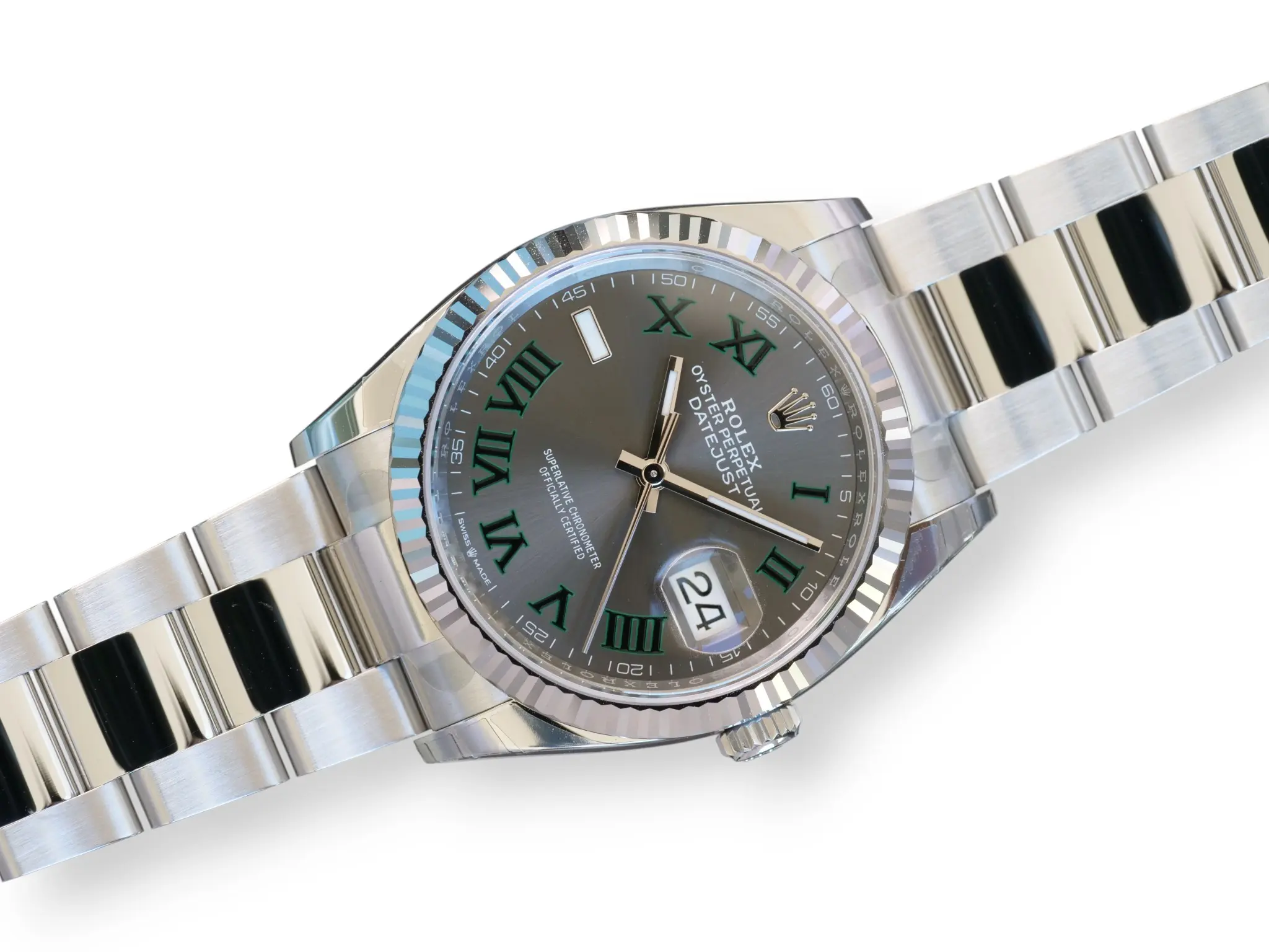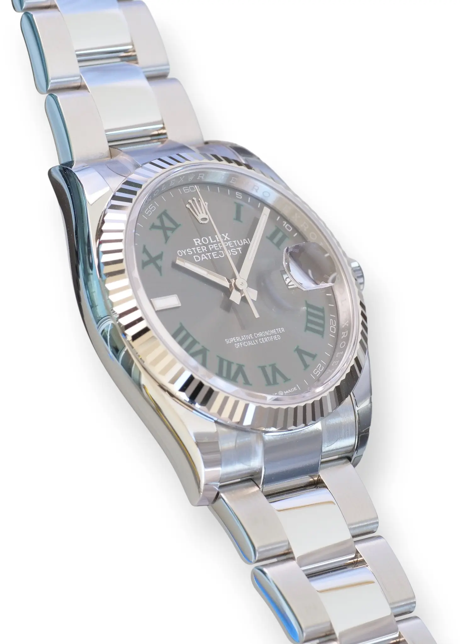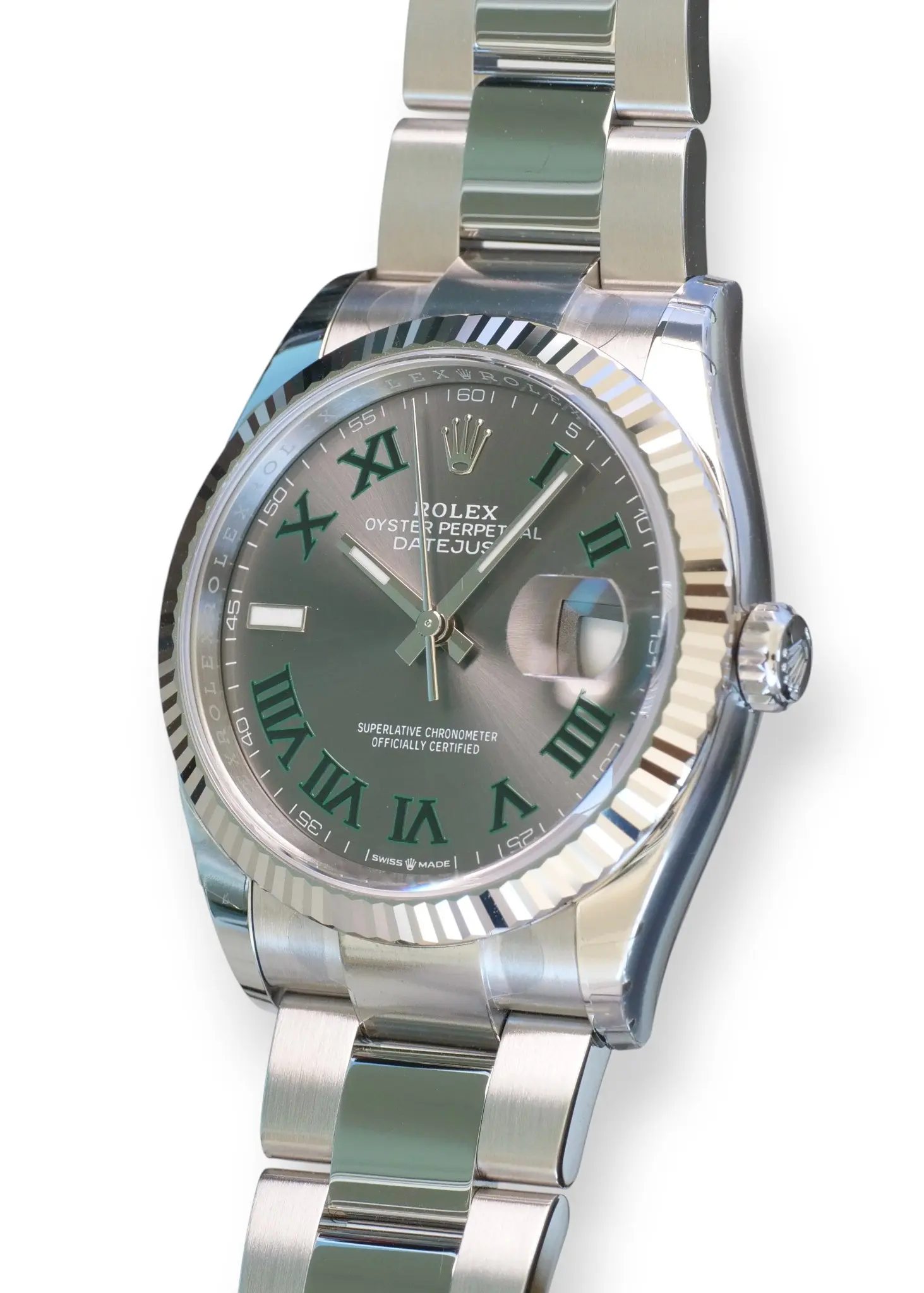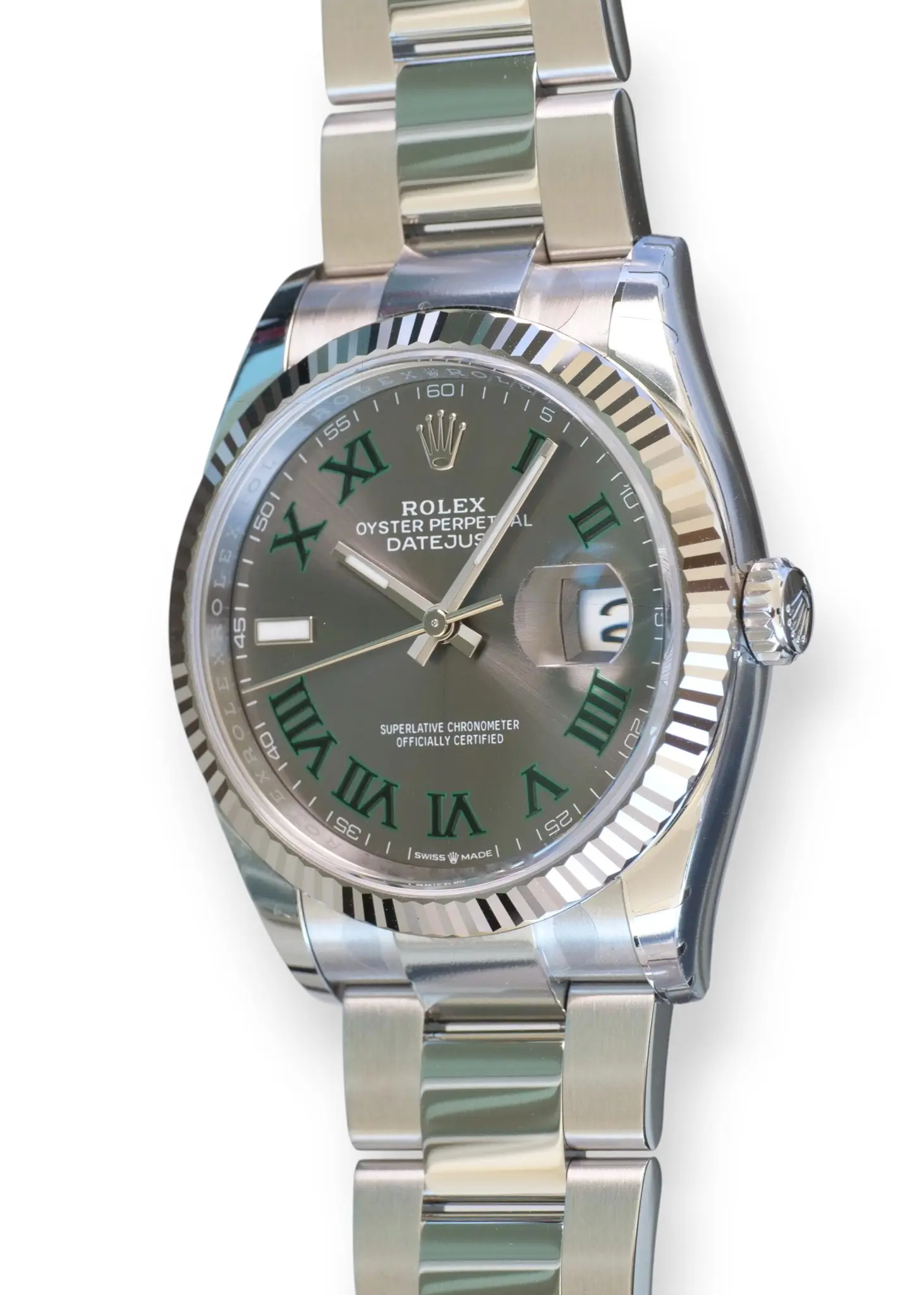 ROLEX Datejust 36 Wimbledon Dial, Model 126234 with iconic 18ct Fluted bezel, and the popular Oyster bracelet.