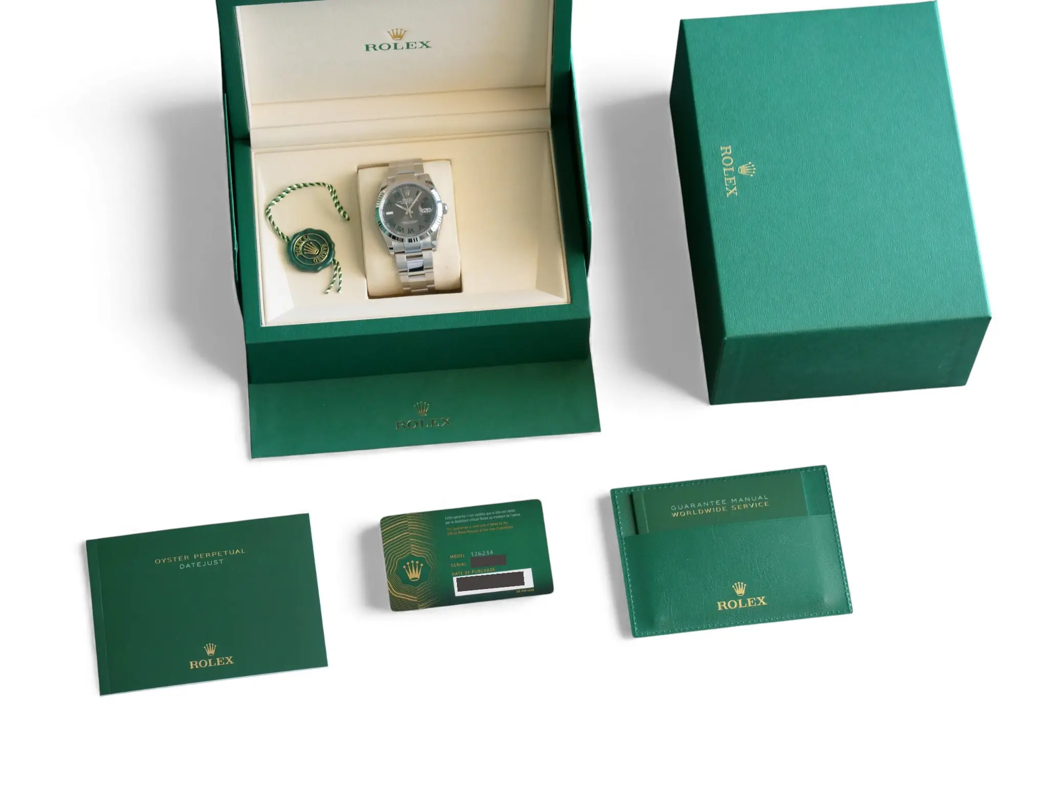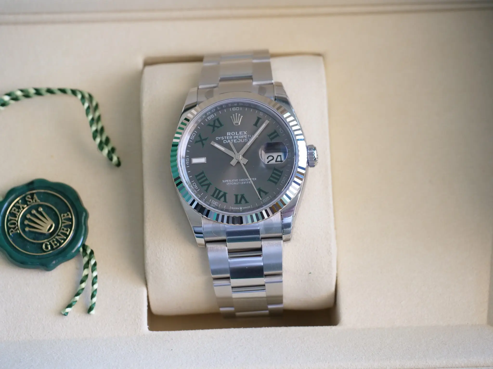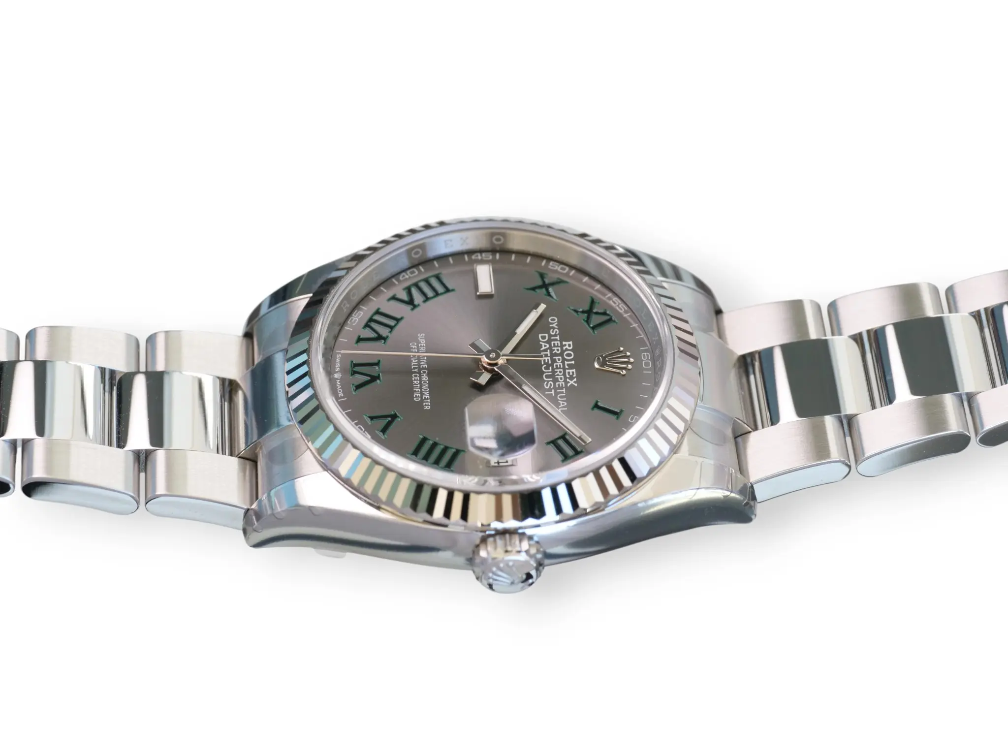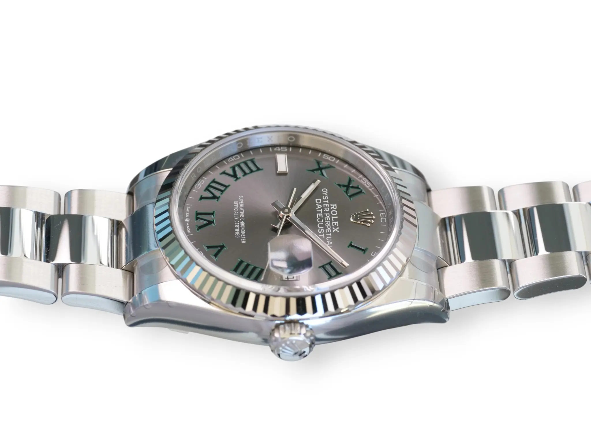 ROLEX Datejust 36 Wimbledon Dial, Model 126234 with iconic 18ct Fluted bezel, and the popular Oyster bracelet.