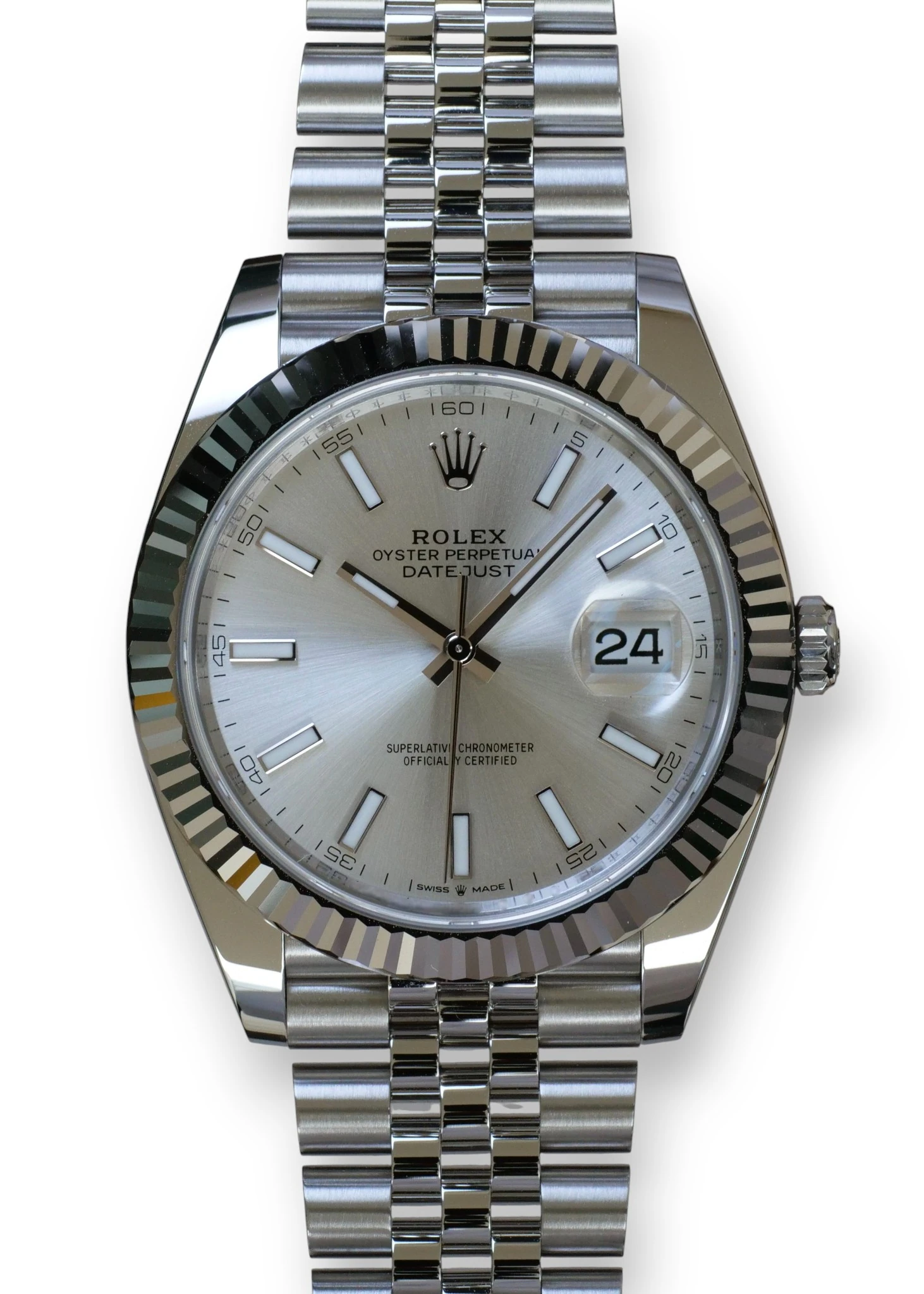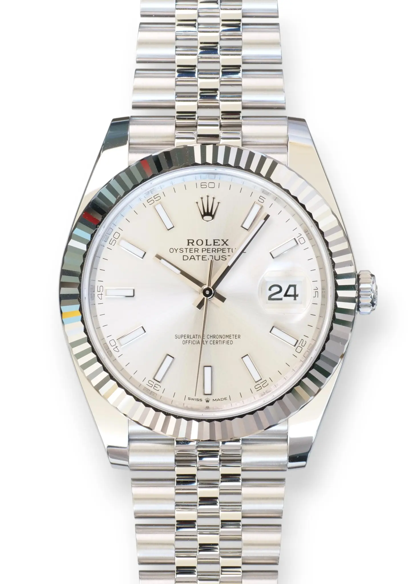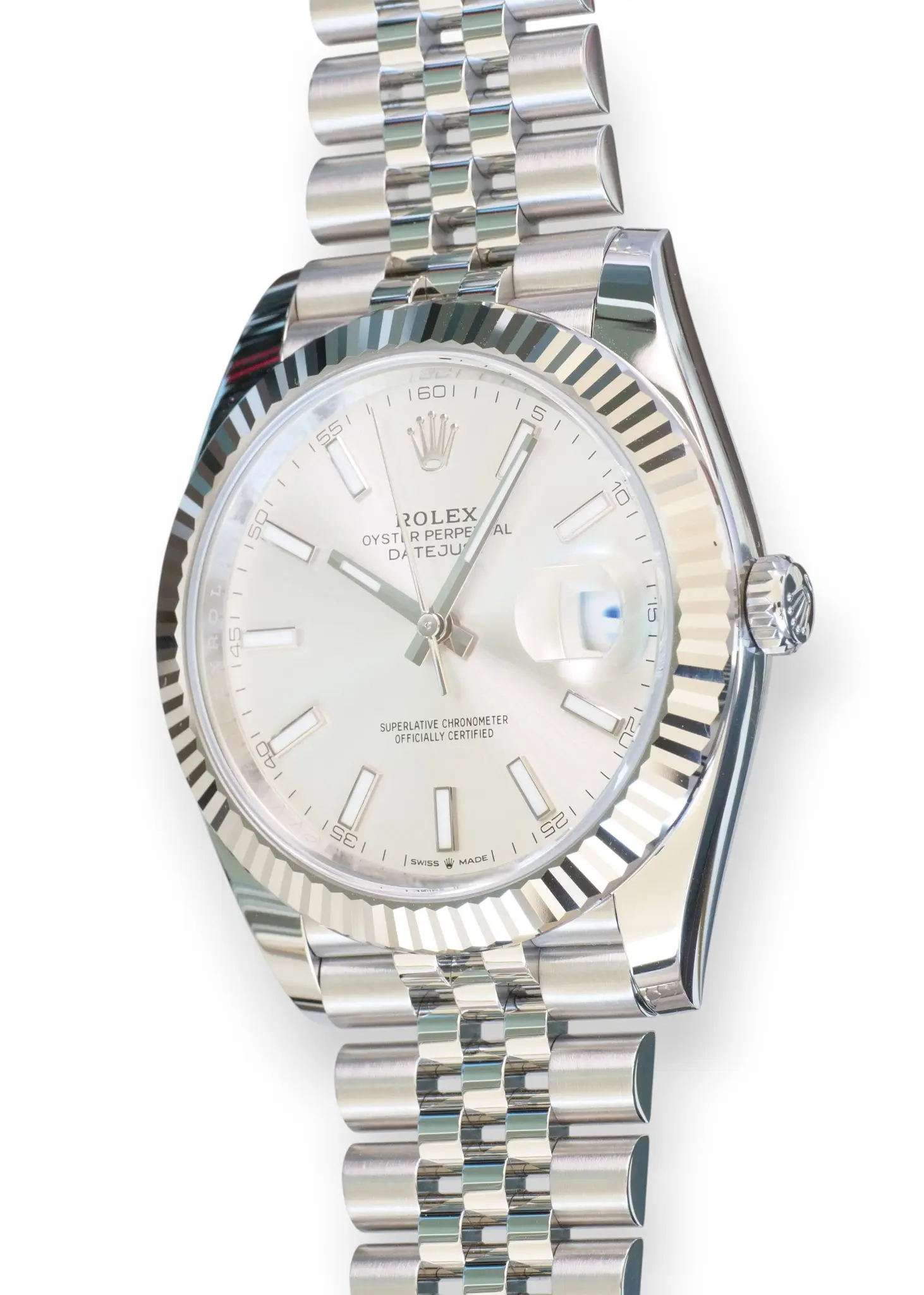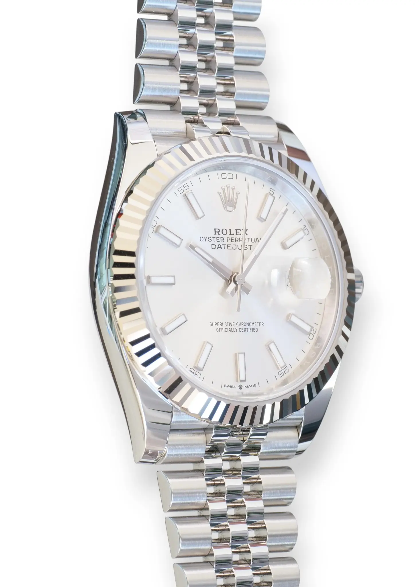 Rolex Datejust 41 Silver dial in a very beautiful and the most sought-after configuration of 18ct white gold fluted bezel and a Jubilee bracelet.