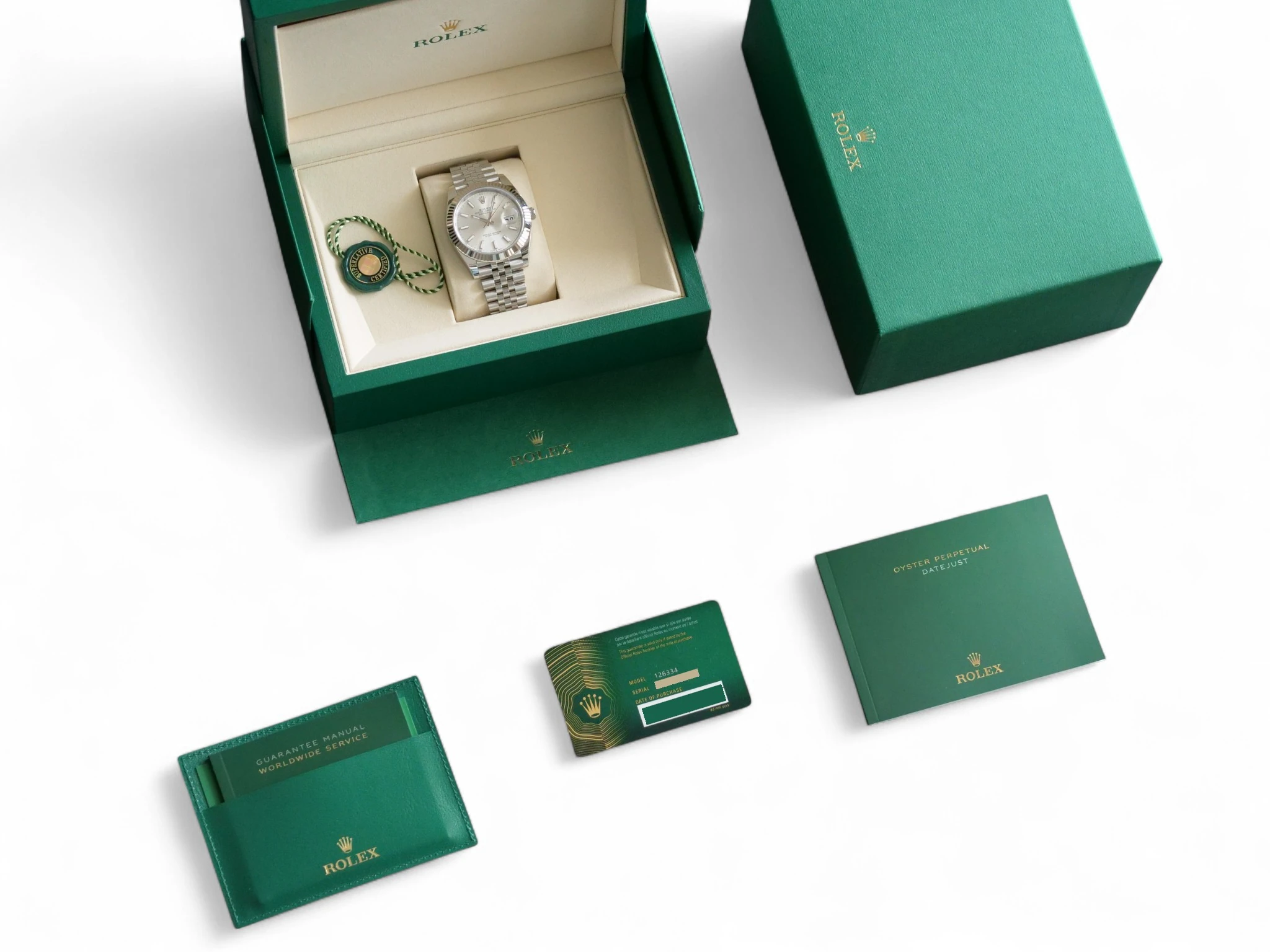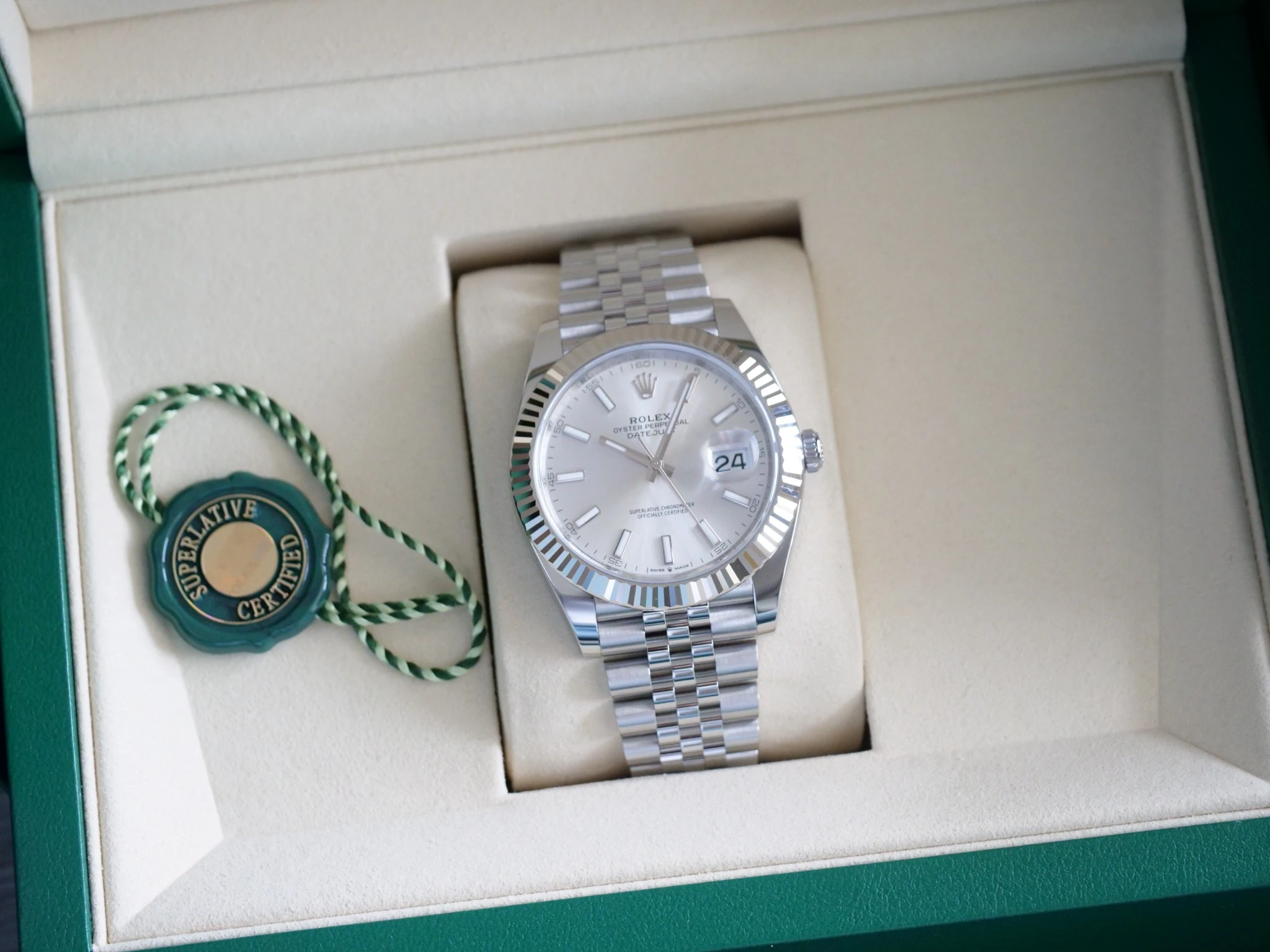 All photos are from the actual Rolex Datejust 41 126334 watch for sale including the photo with delivery contents and form part of the description. The photos are indicative of the condition of the watch, and the items that come included in the box.