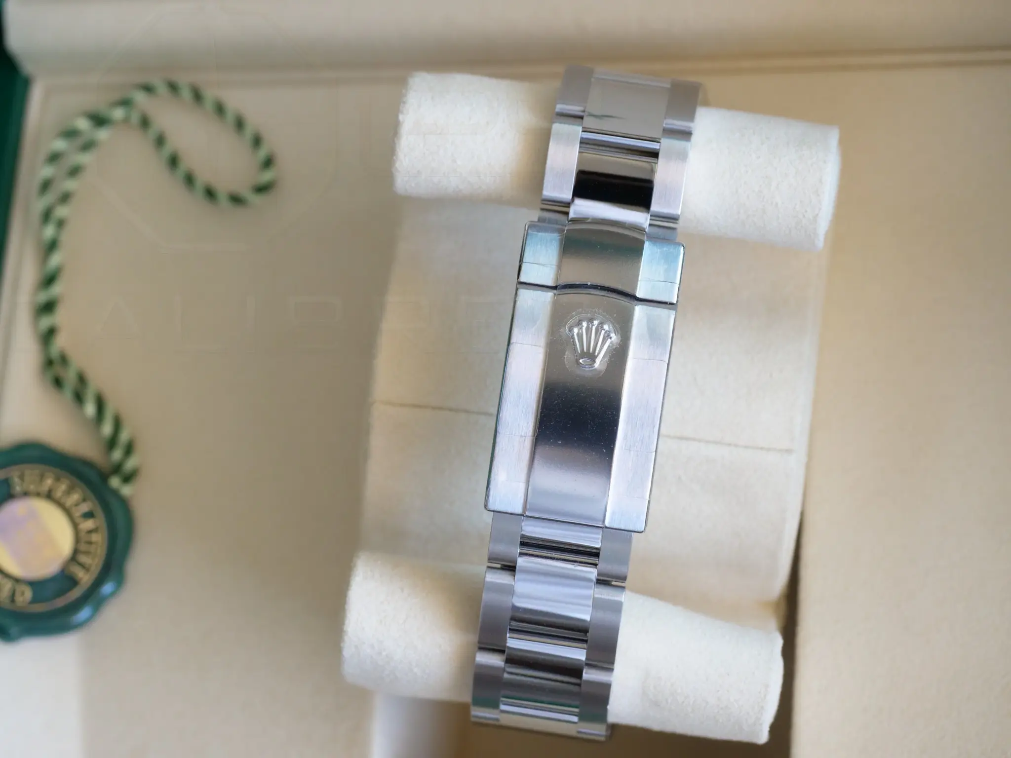 The watch presents in Brand New, Unworn and Unsized condition with some factory stickers still intact on the case and the clasp as can be seen in the photos. The watch is further a fresh 2026 stock with balance of Rolex warranty until 2031. The watch is offered complete as a Full set with factory presentation boxes and papers, including green Rolex tag. Please refer to attached photos to view the delivery contents.