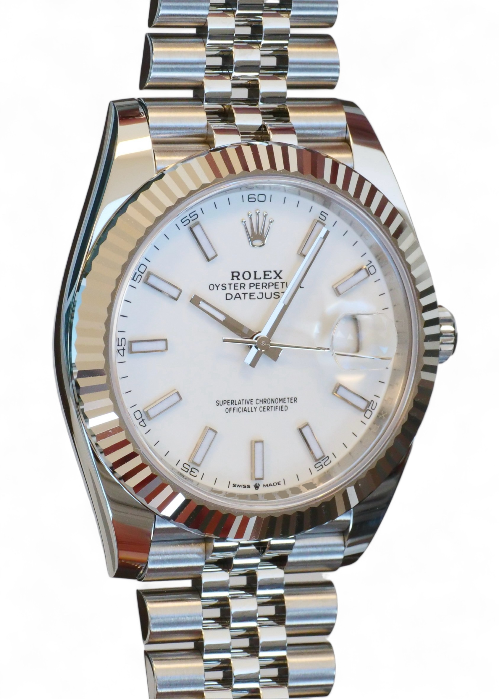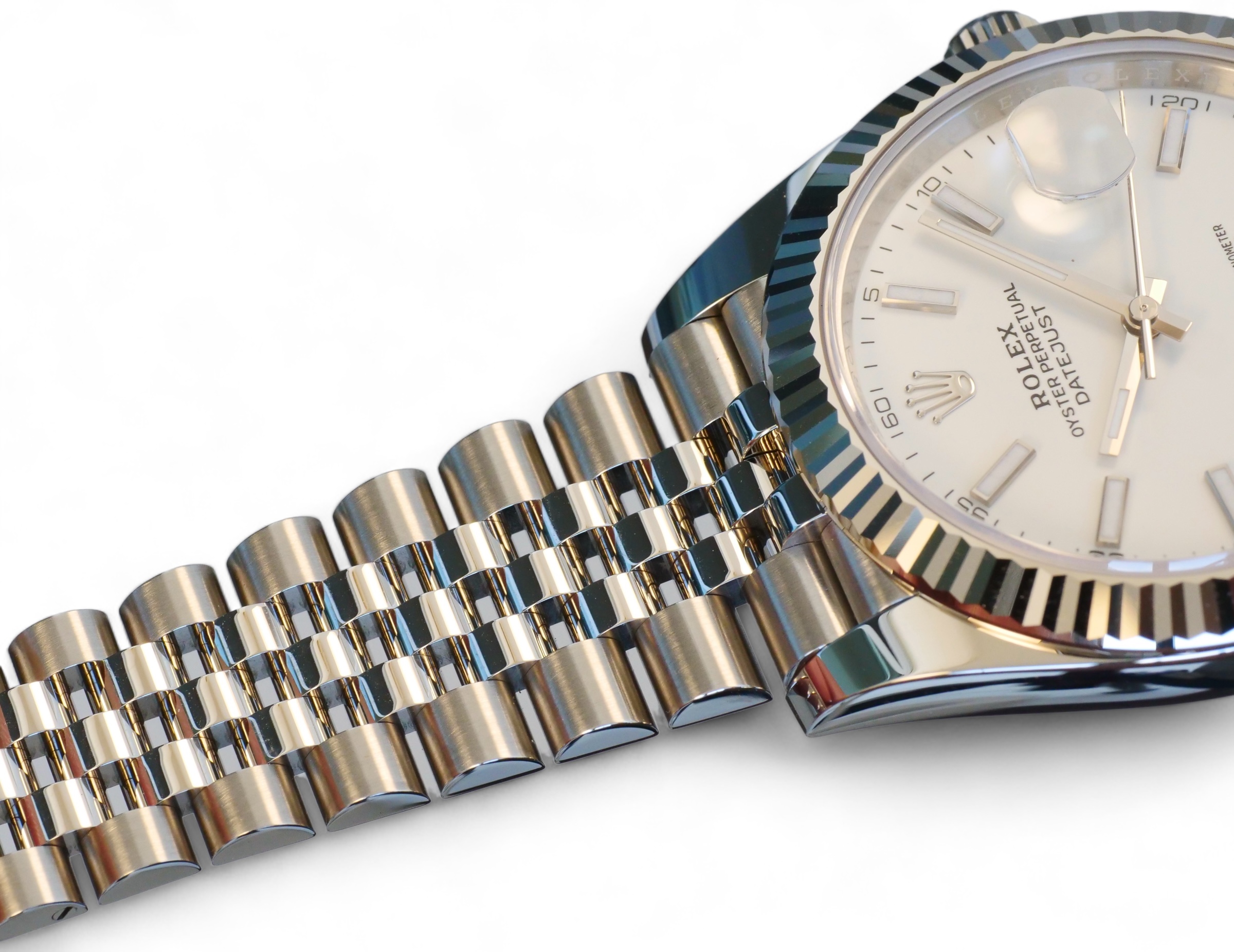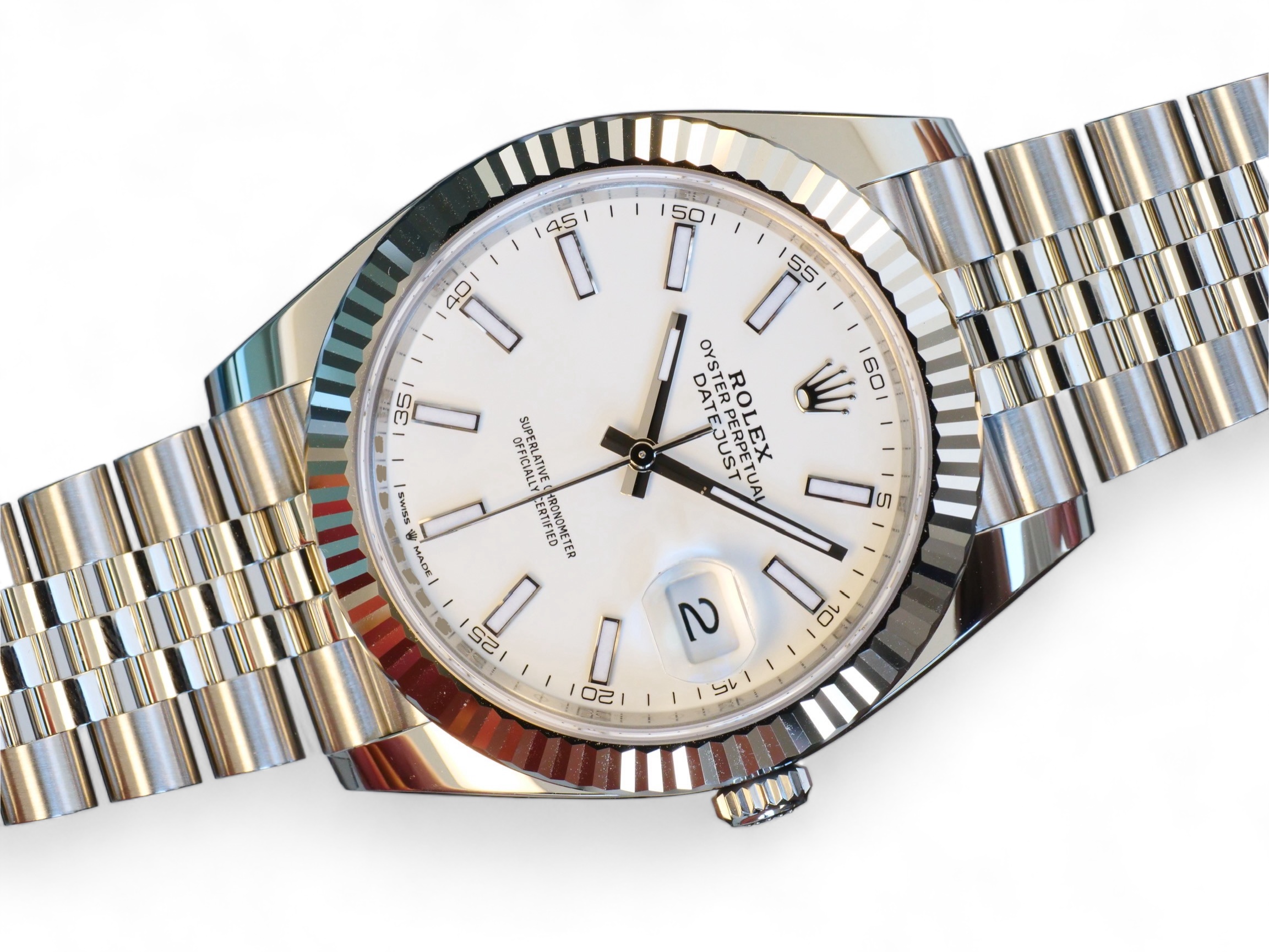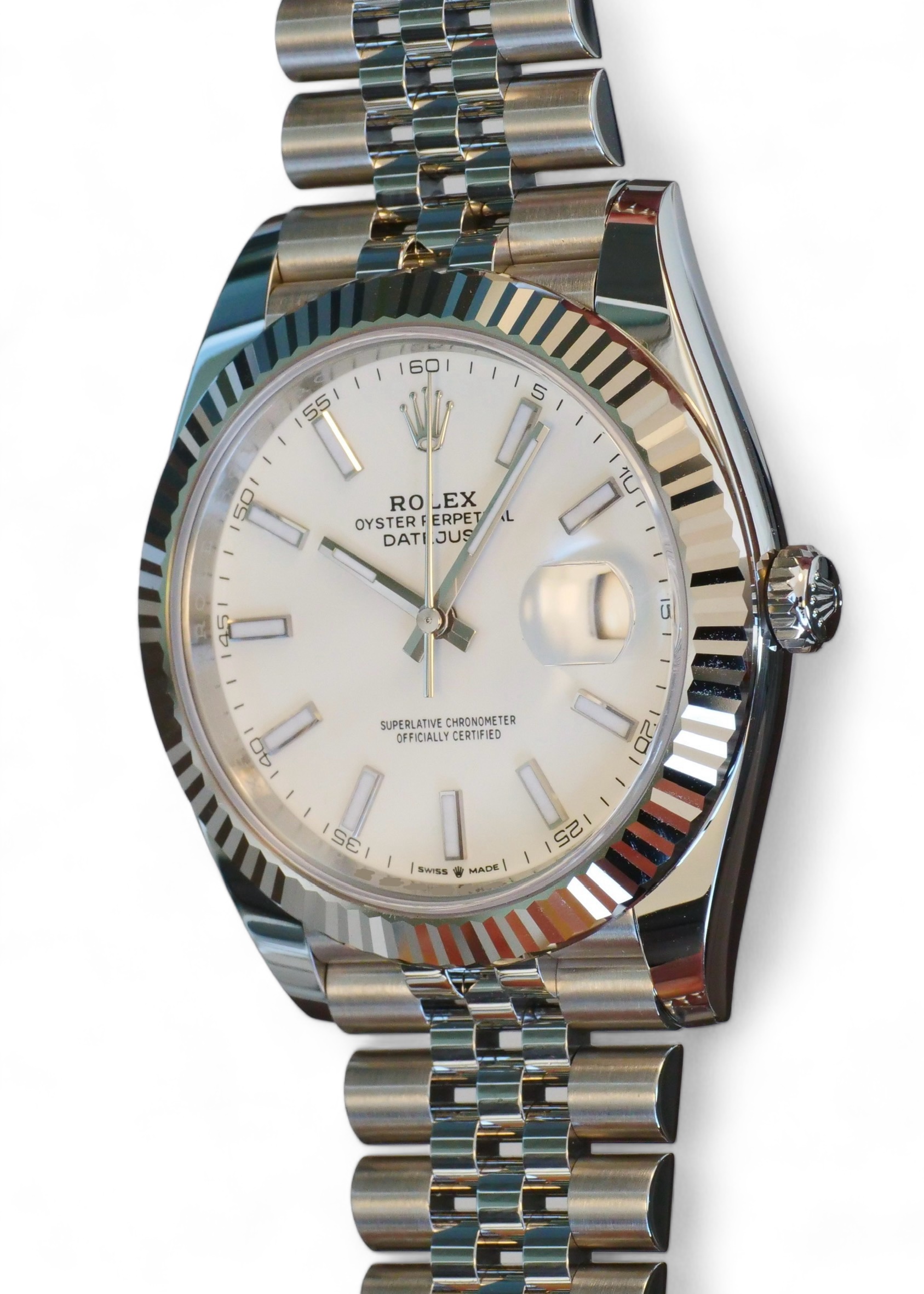 On offer for sale is an all-time classic, a timeless and beautiful example of Rolex Datejust 41 in White dial, 18ct Fluted bezel and Jubilee bracelet.