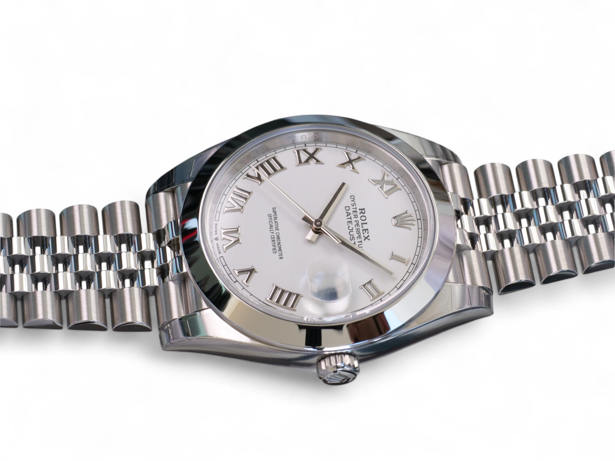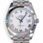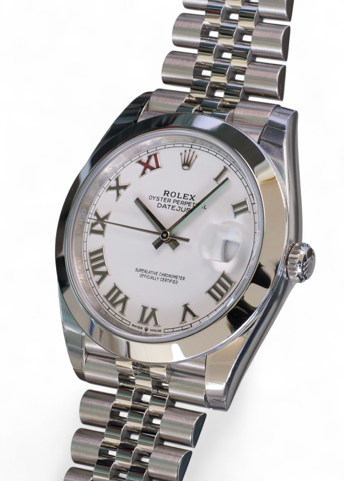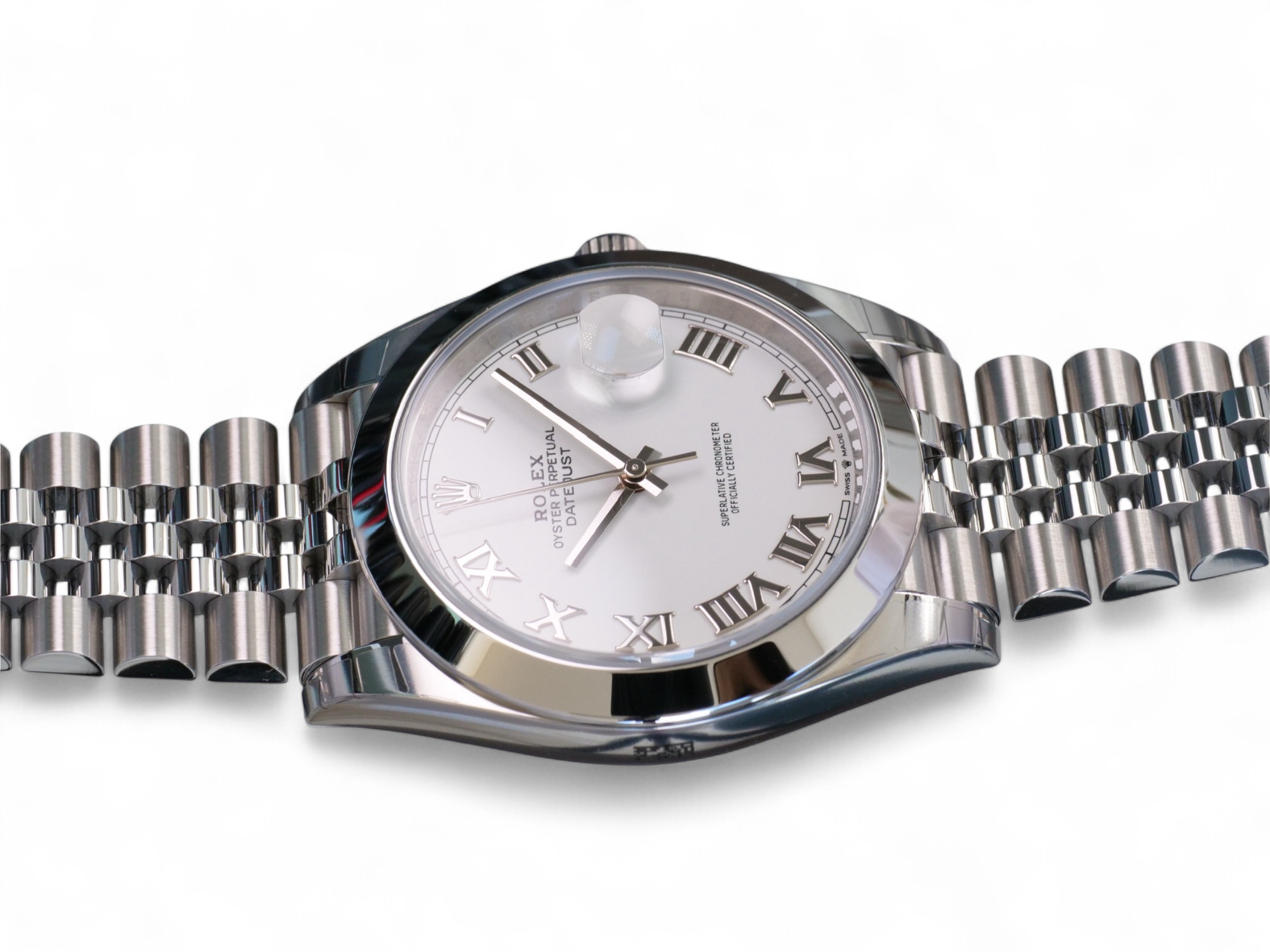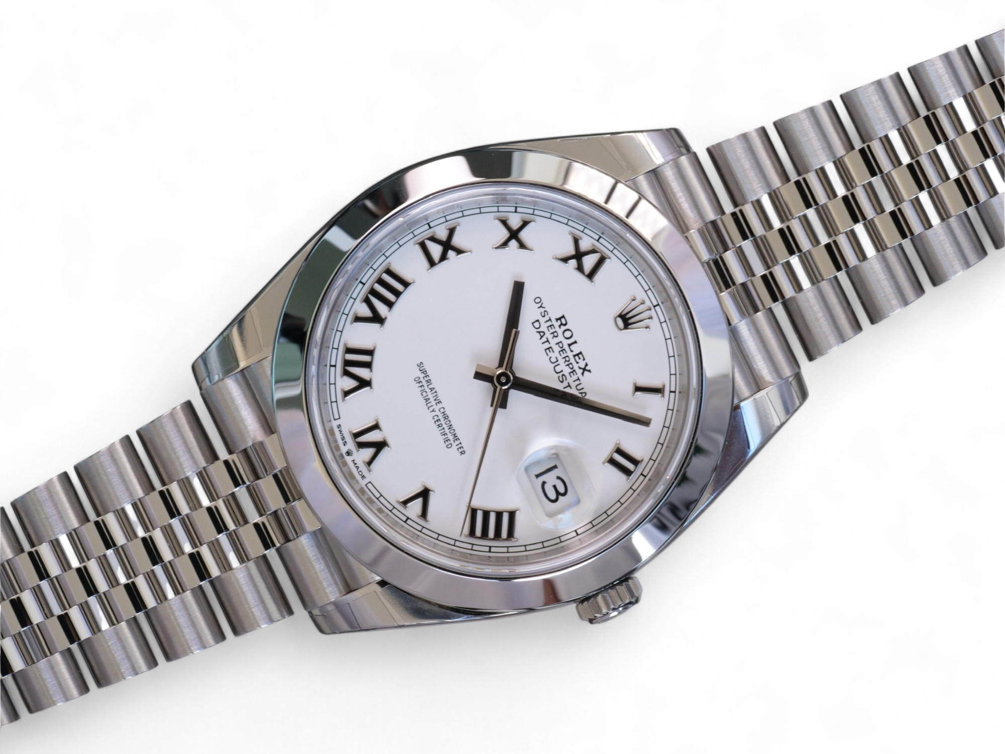 Rolex Datejust 41 Model 126300, a very beautiful and an all-time classic configuration of White Roman dial, Smooth bezel and Jubilee bracelet.