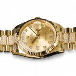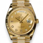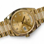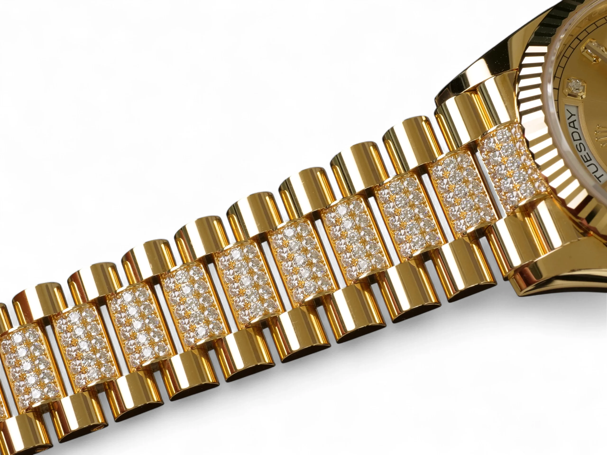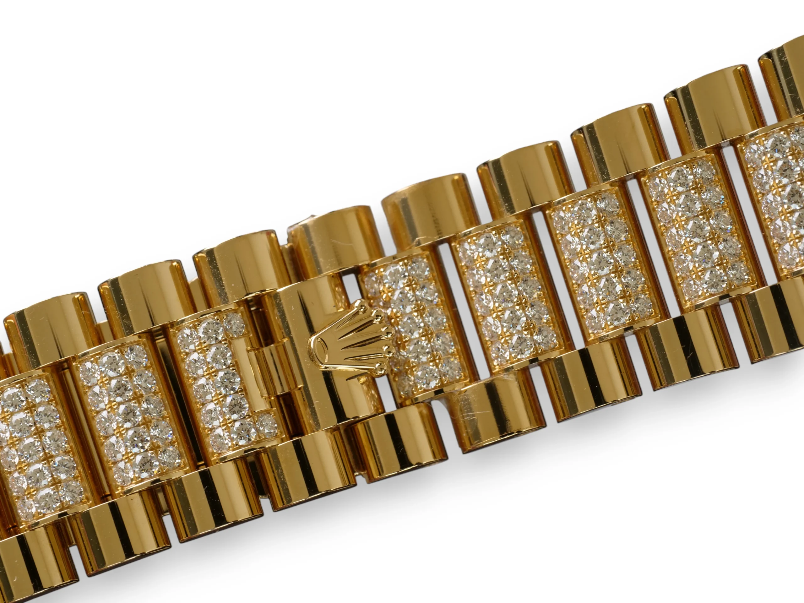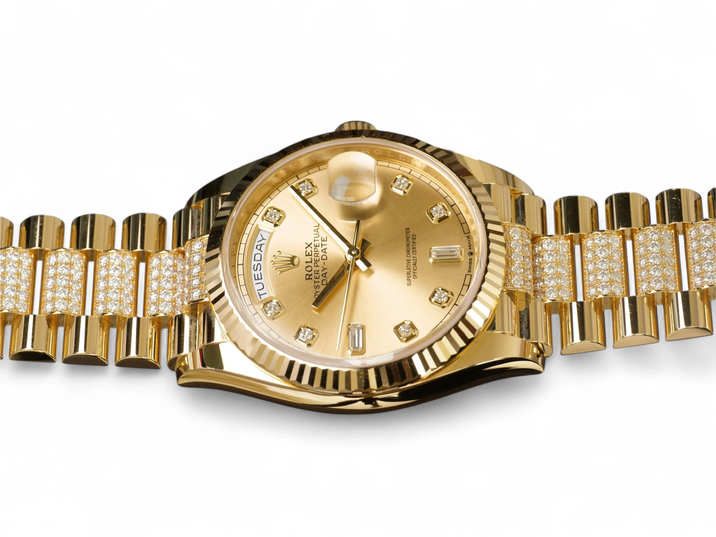 Rolex Day-Date 36 in 18ct Yellow gold, model 128238, an incredible example in a very rare and now discontinued configuration of 18-ct fluted bezel, diamond-set dial and a breath-taking diamond-set President bracelet.
