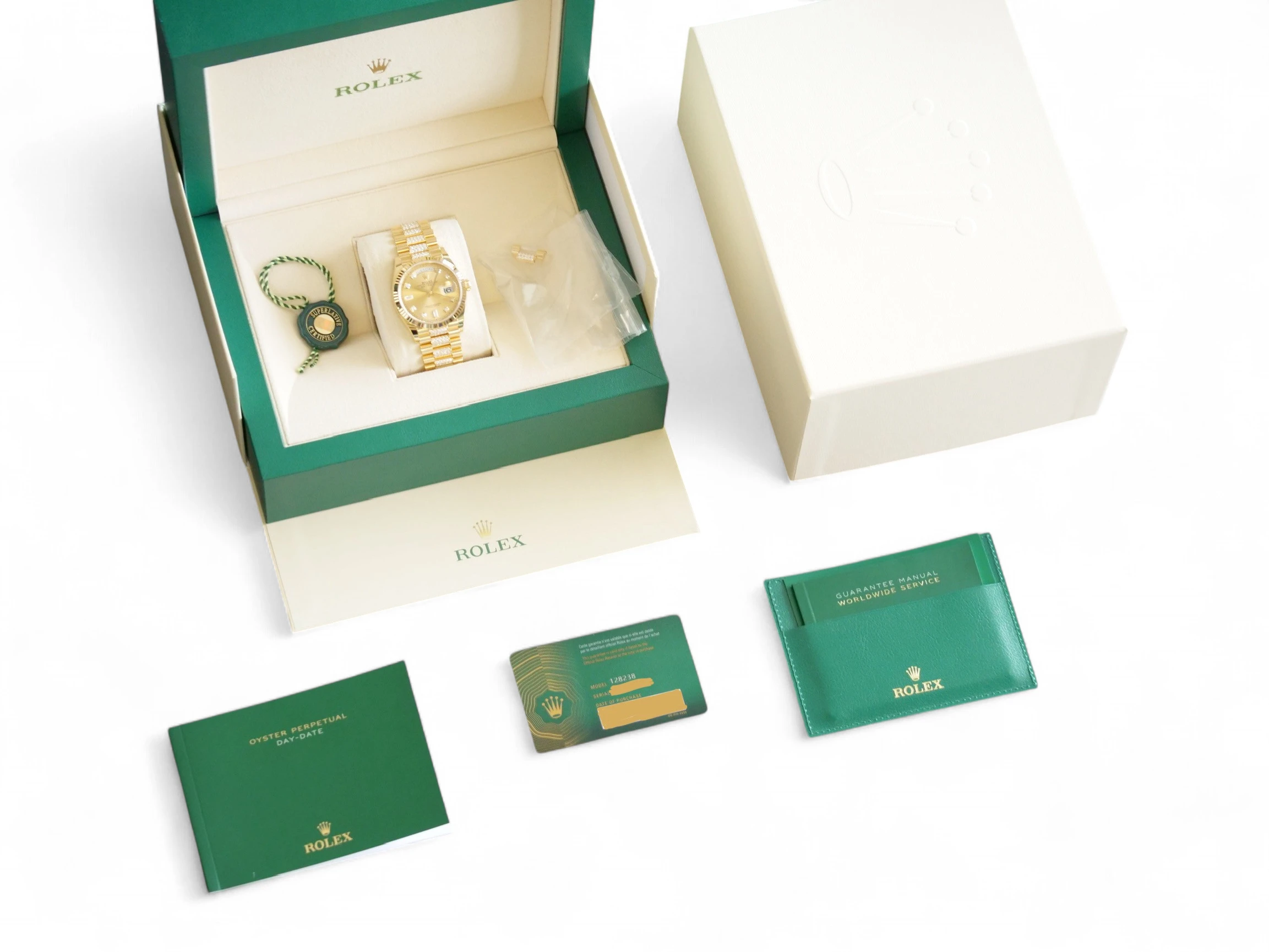 All photos on this listing are from the actual Rolex Day-Date 36 128238 Champagne Diamond-set Dial & Bracelet timepiece for sale and are our intellectual property across all platforms. The serial number and the card details are redacted in all the photos for privacy and security reasons.