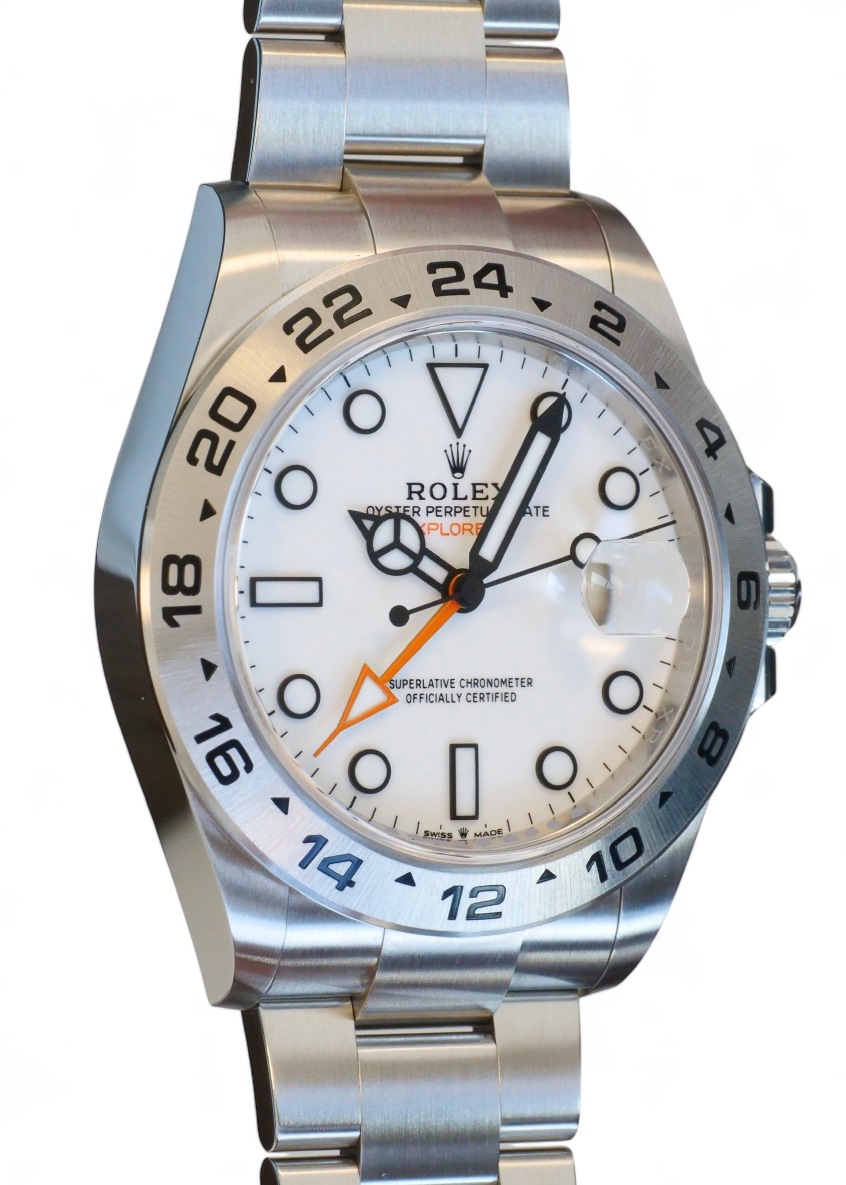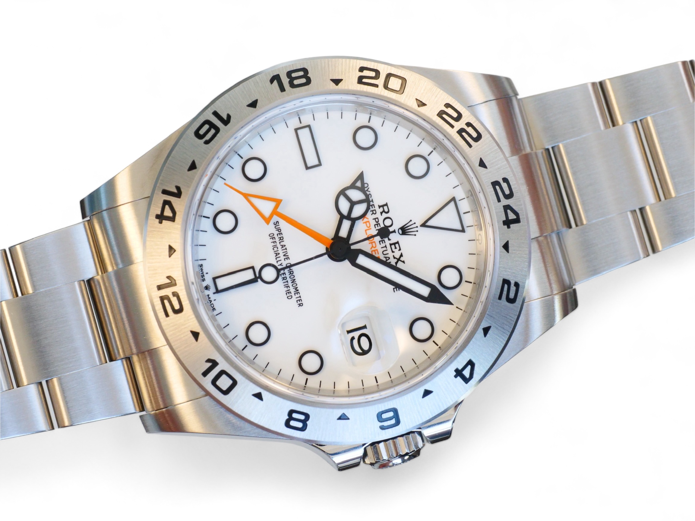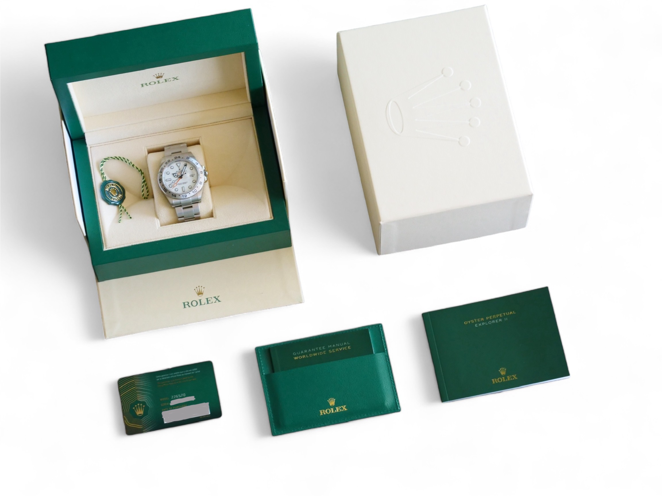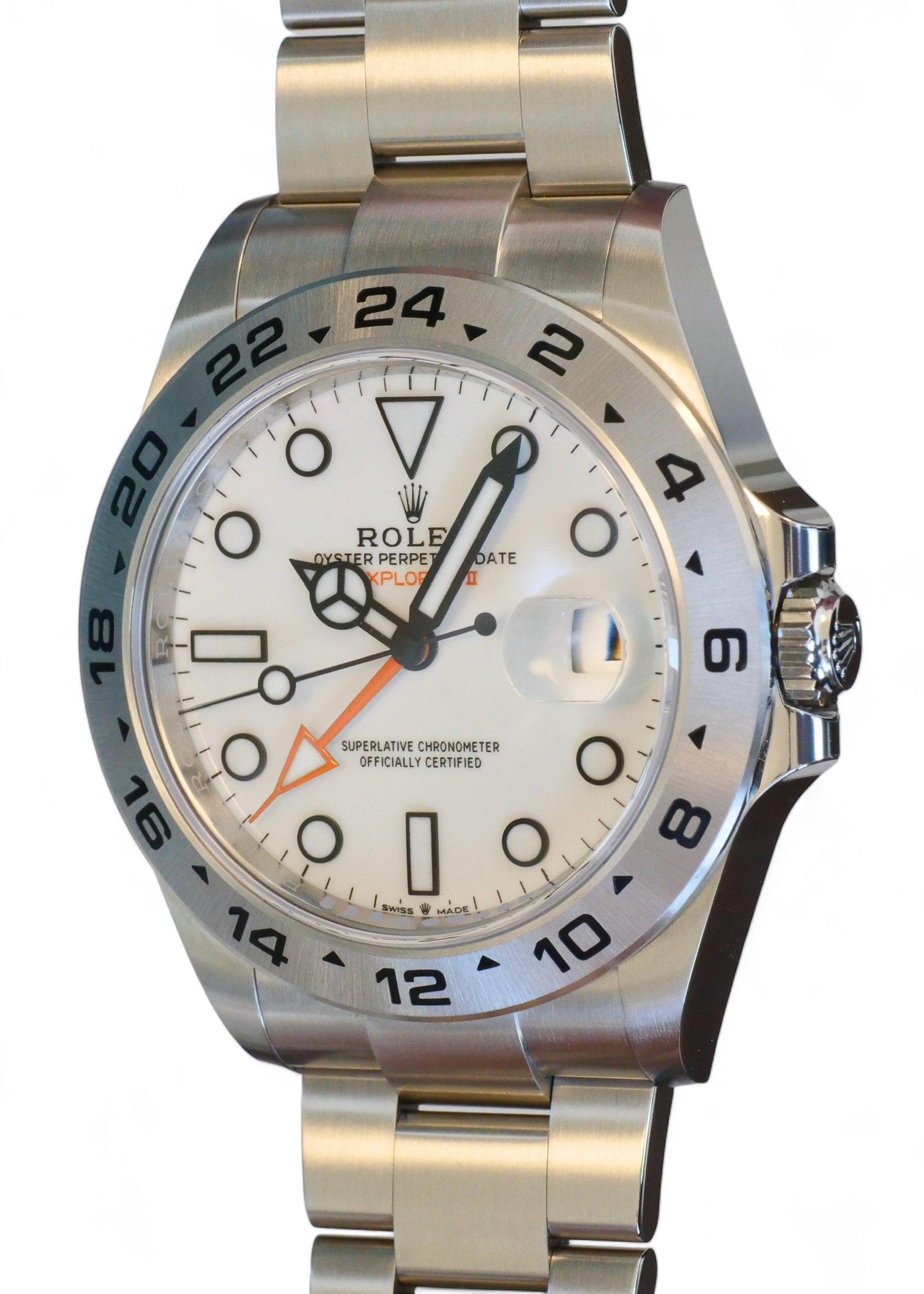 On offer for sale is a beautiful, the latest generation, 50th anniversary model Rolex Explorer II, in a very sought after Polar dial with the iconic black and white accents and the very special orange GMT hand, model reference 226570, offering 70 hours of power reserve.