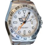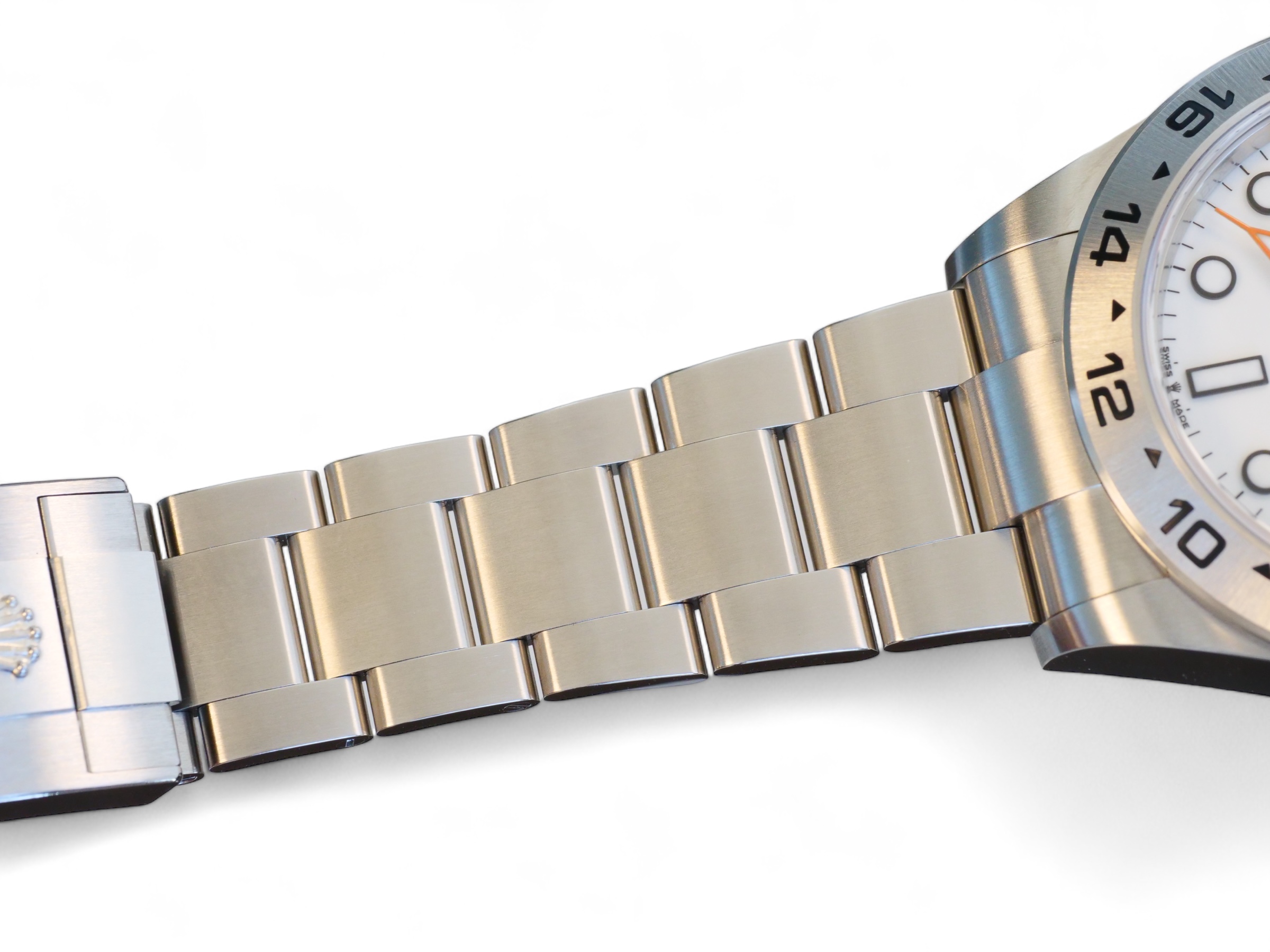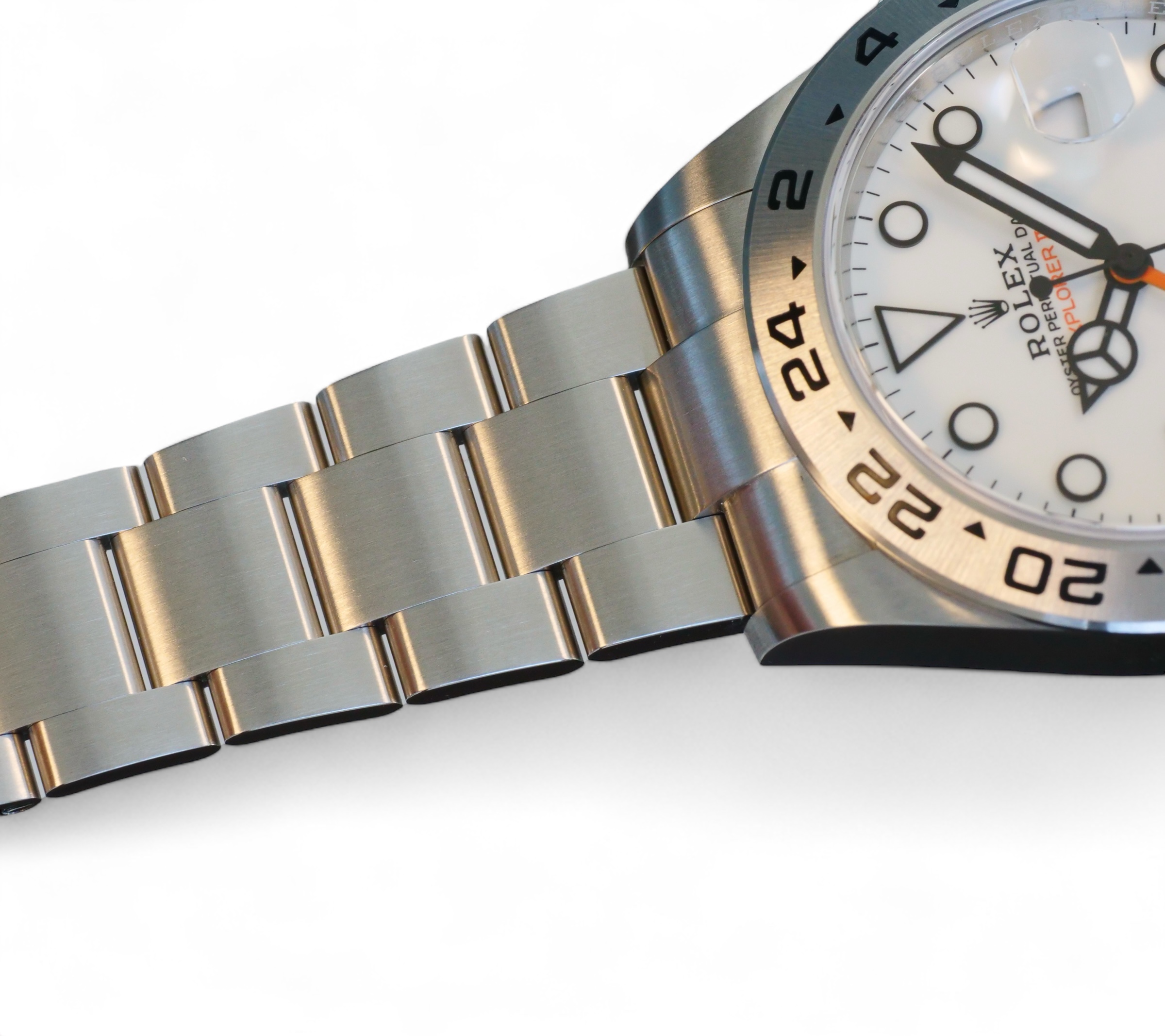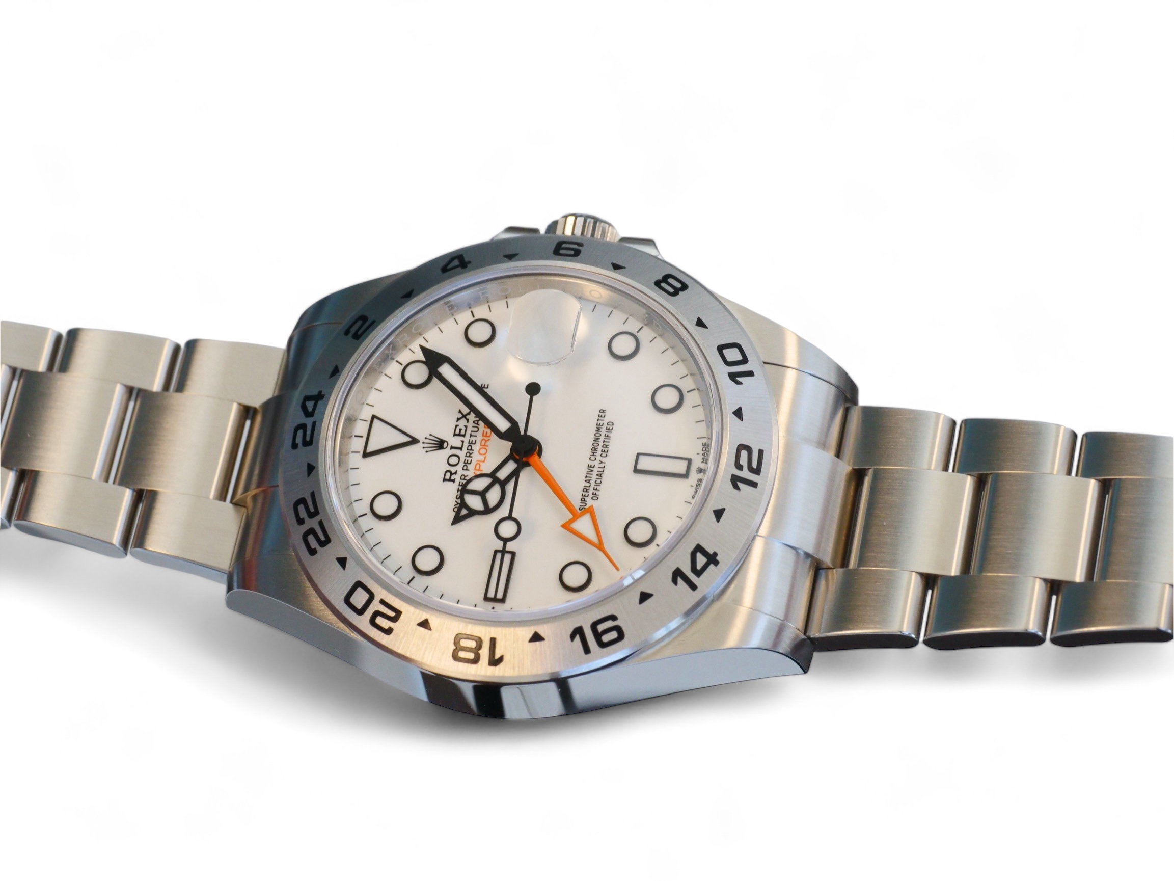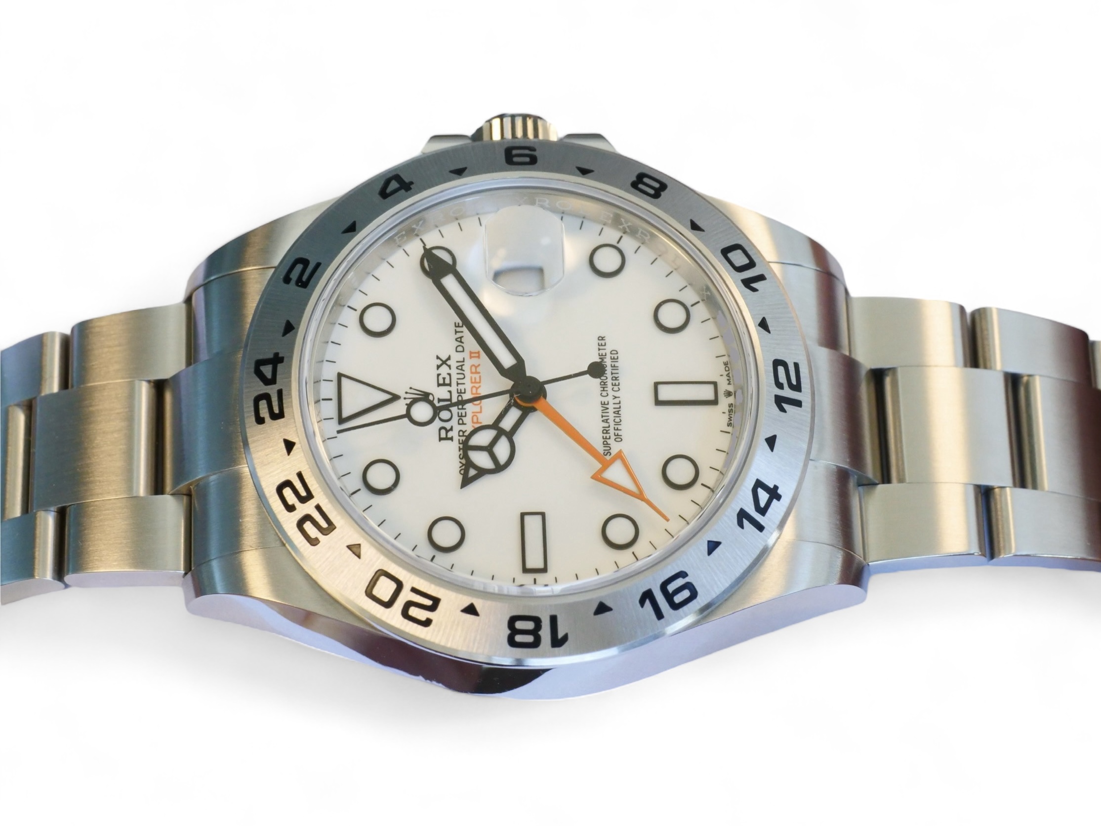 On offer for sale is a beautiful, the latest generation, 50th anniversary model Rolex Explorer II, in a very sought after Polar dial with the iconic black and white accents and the very special orange GMT hand, model reference 226570, offering 70 hours of power reserve.
