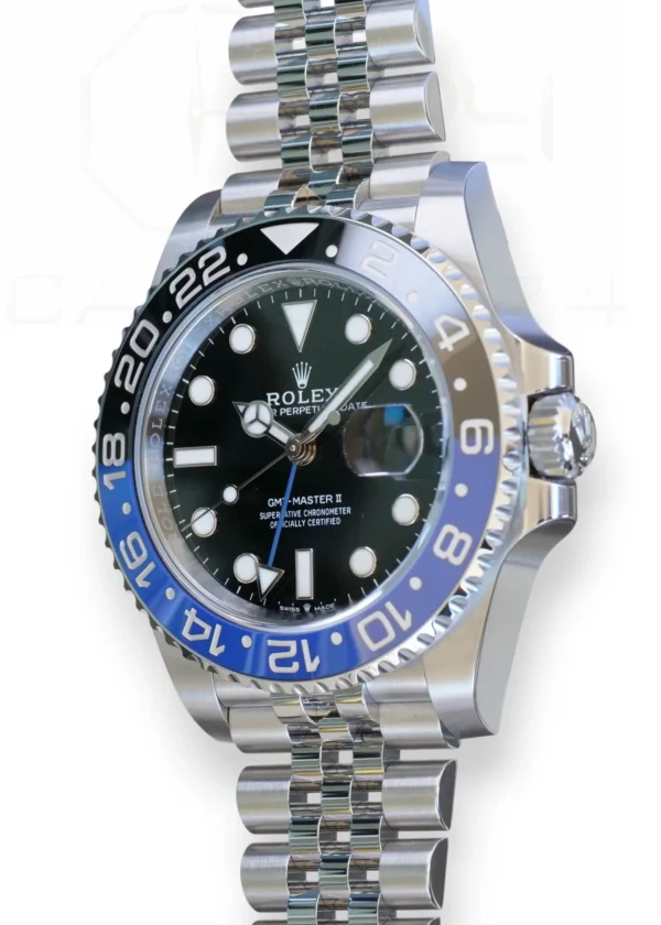 One of the most sought after and desired Rolex watches, the Rolex GMT Master II Batman Model 126710BLNR, on an iconic Oyster bracelet and a very popular black and blue ceramic bezel, and a blue GMT hand, model reference 126710BLNR.