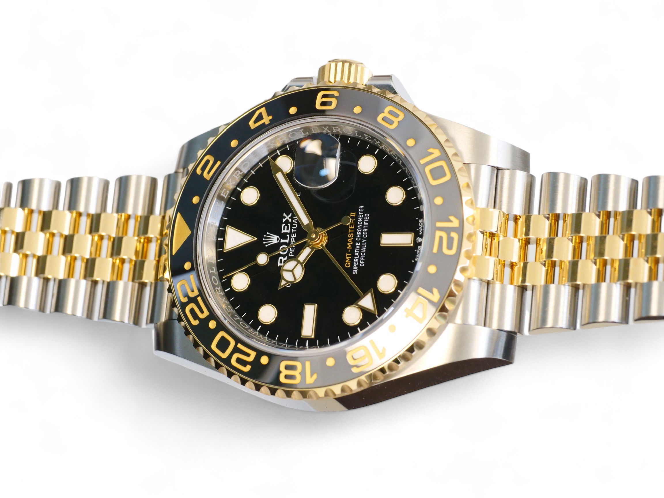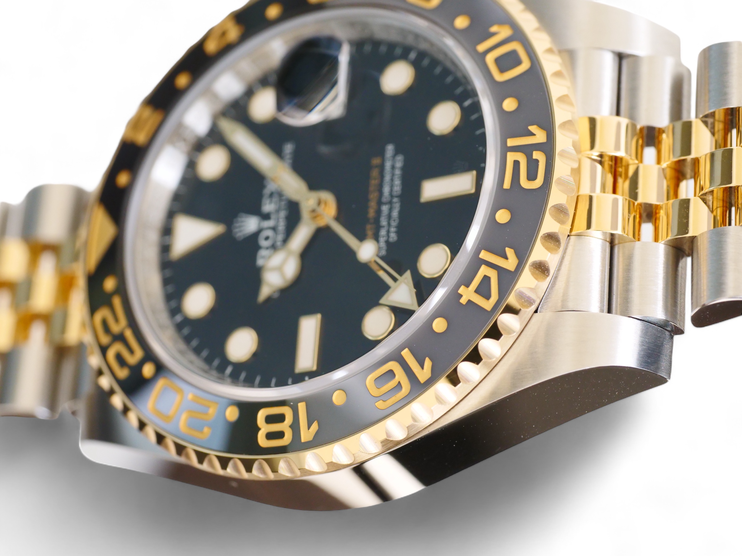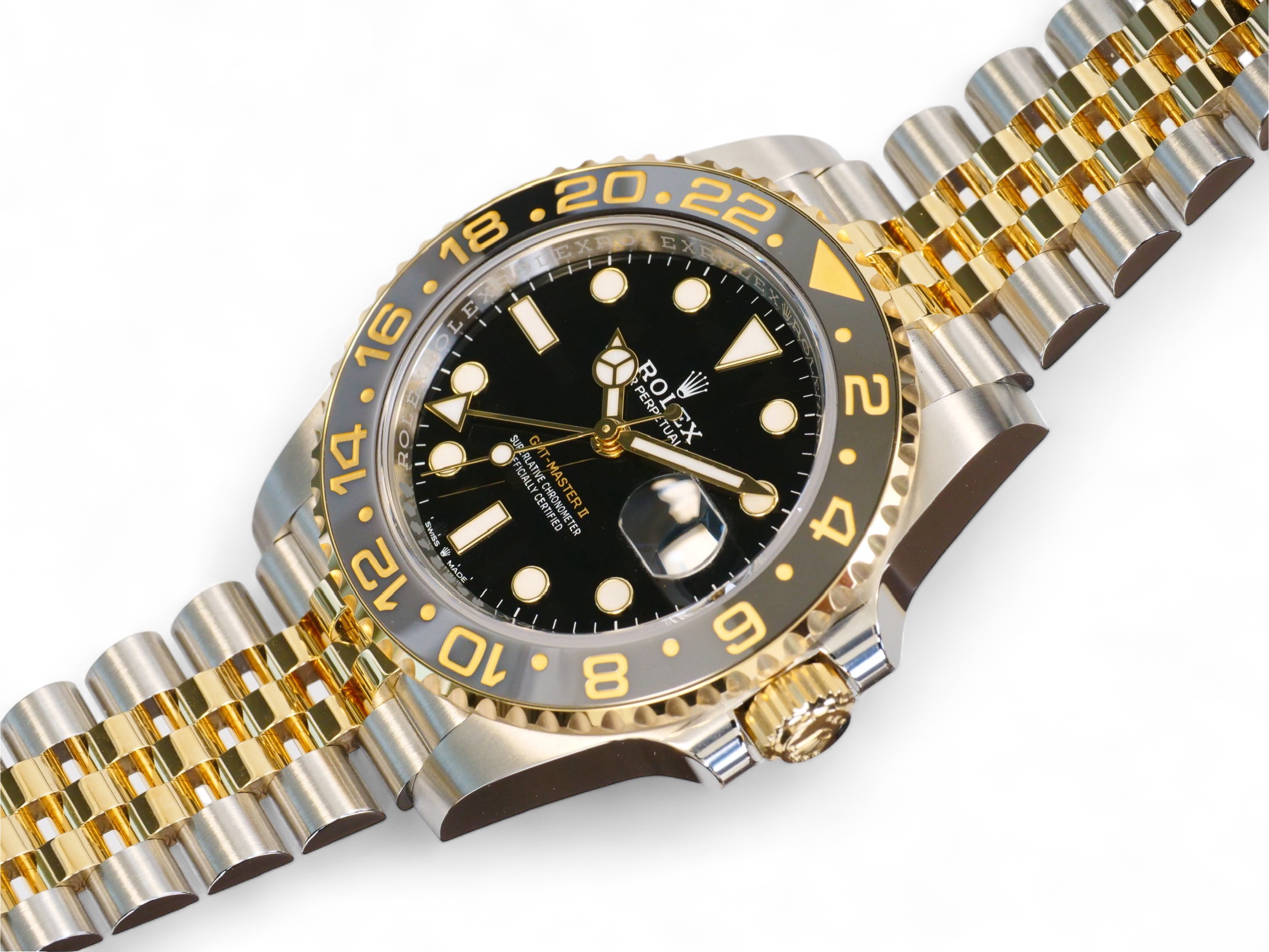 On offer for sale is one of the most sought after Rolex GMT Master in two tone with black and grey bezel model 126713GRNR.