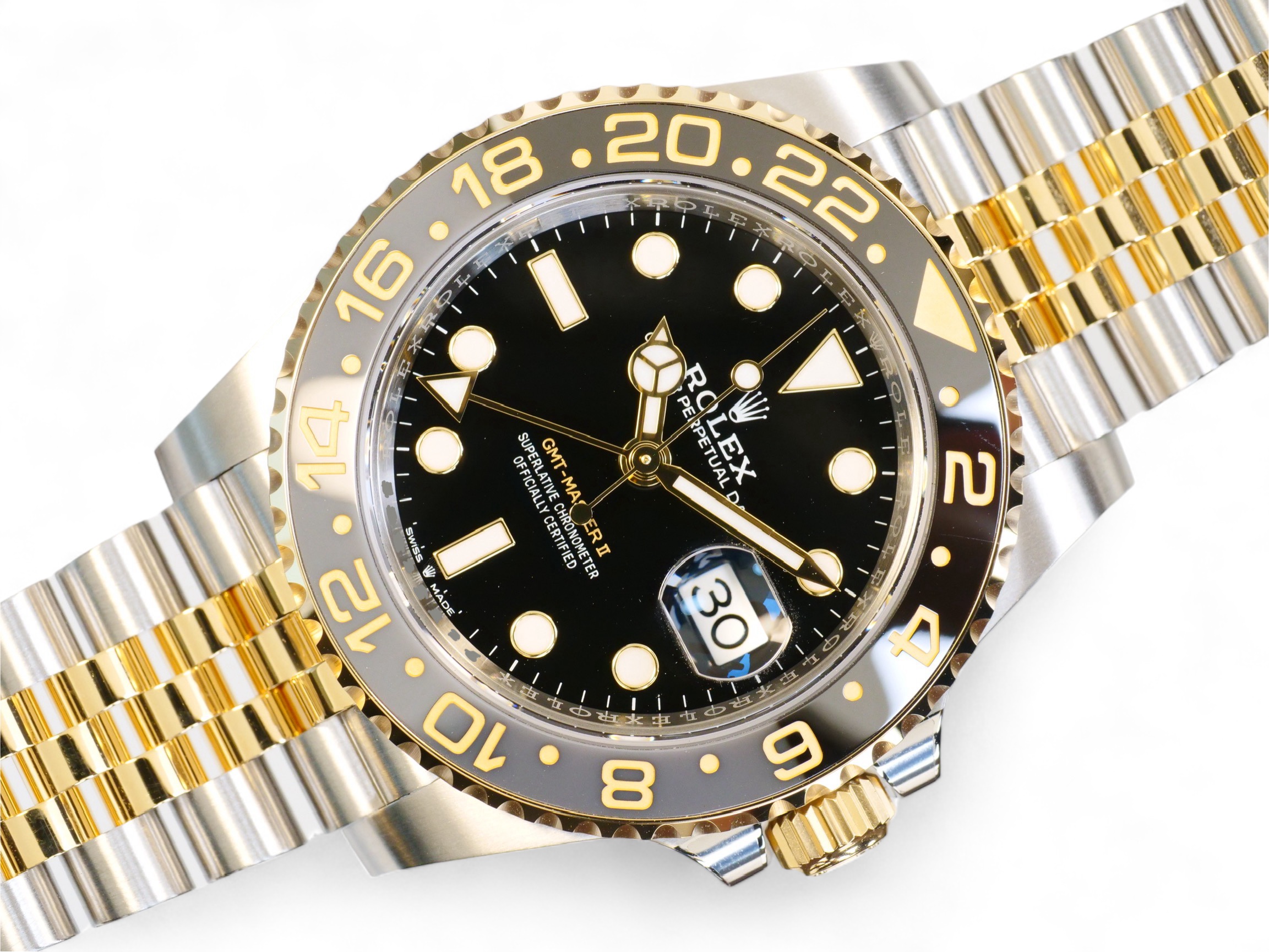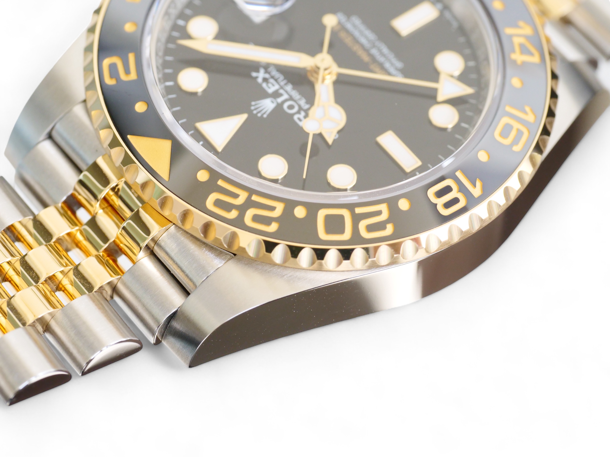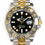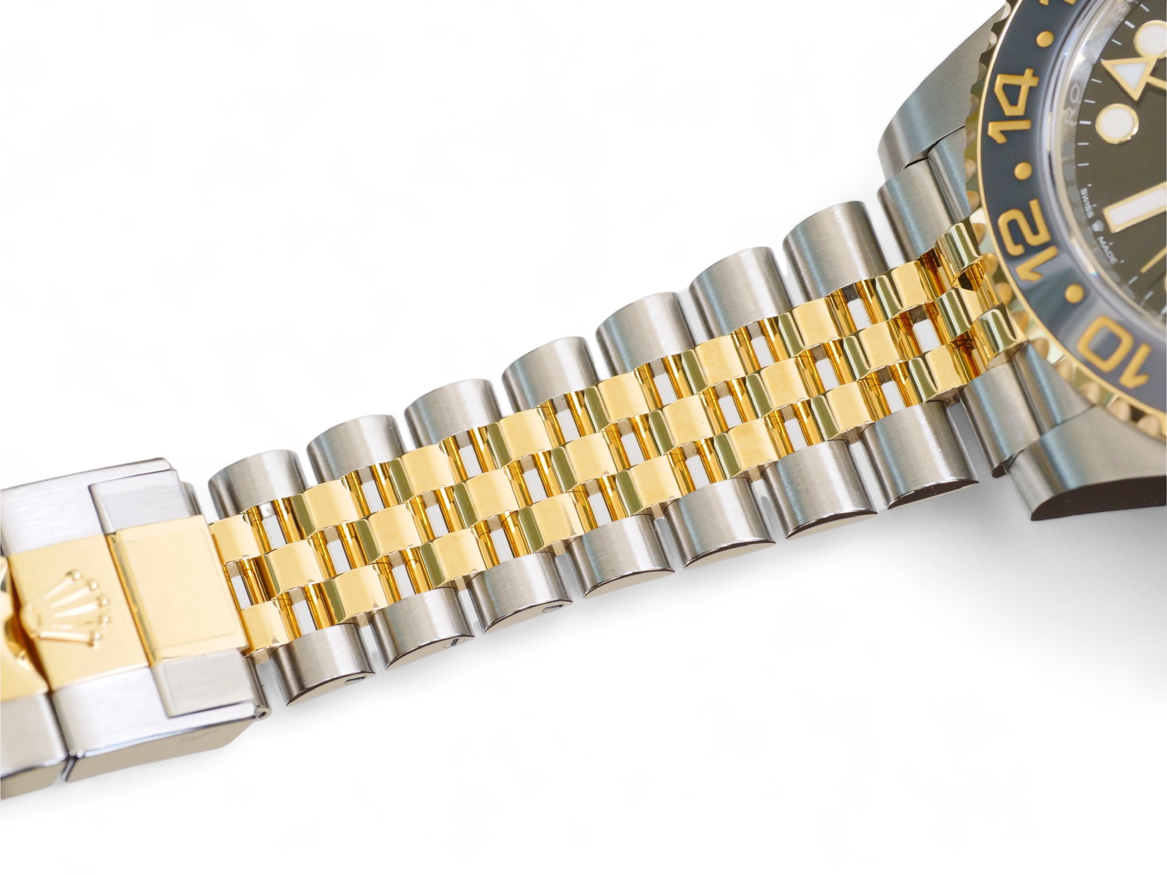 On offer for sale is one of the most sought after Rolex GMT Master in two tone with black and grey bezel model 126713GRNR.