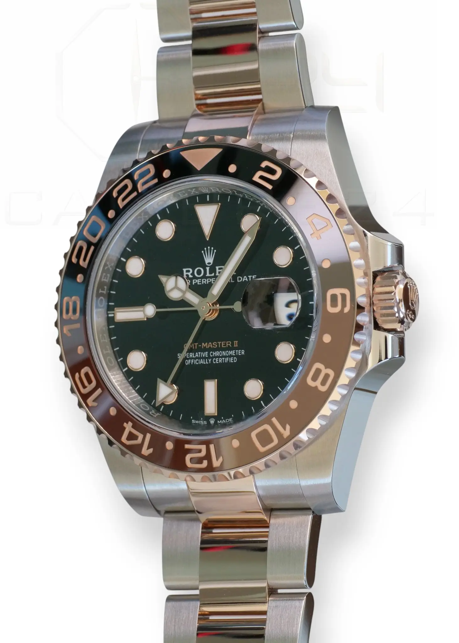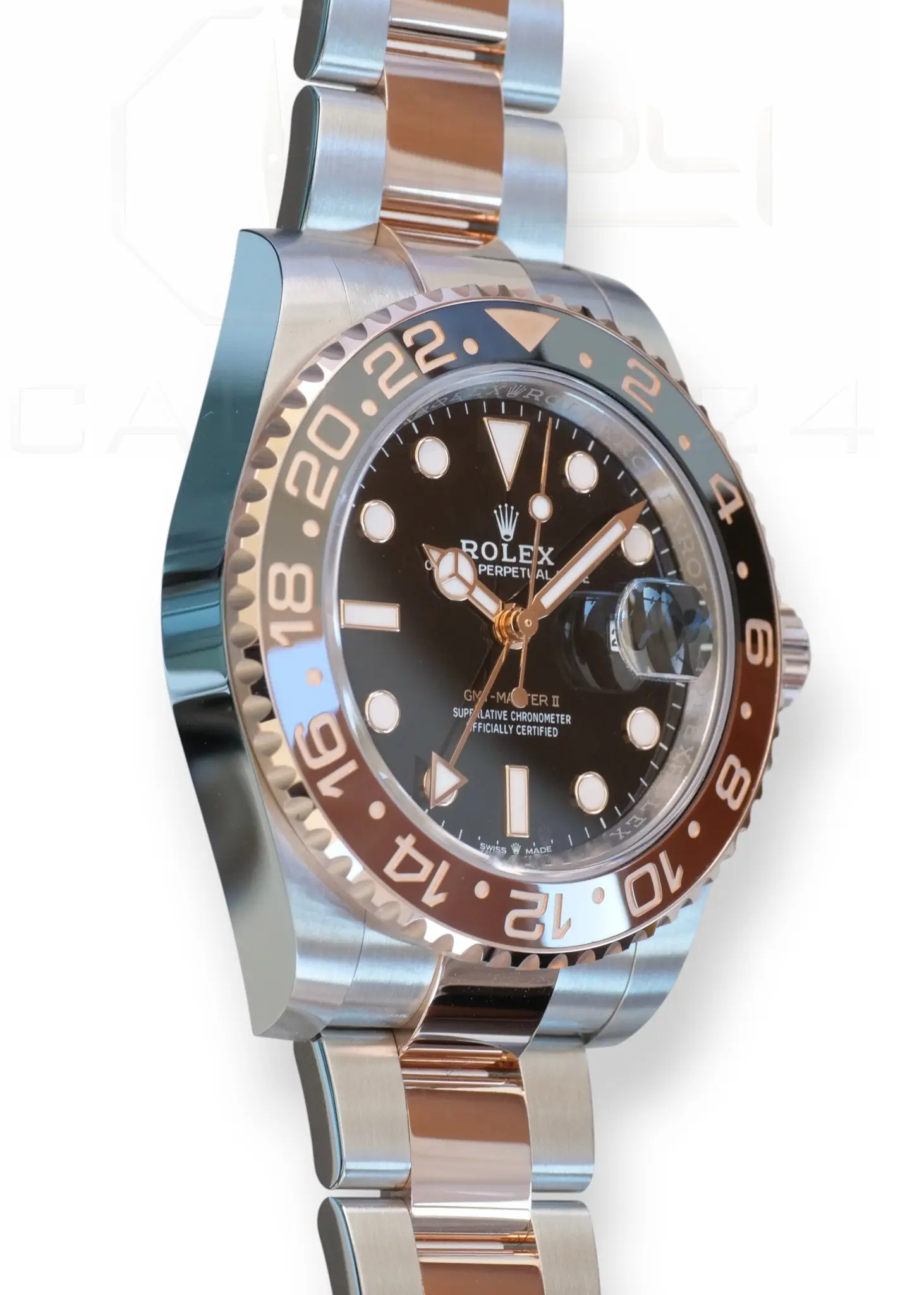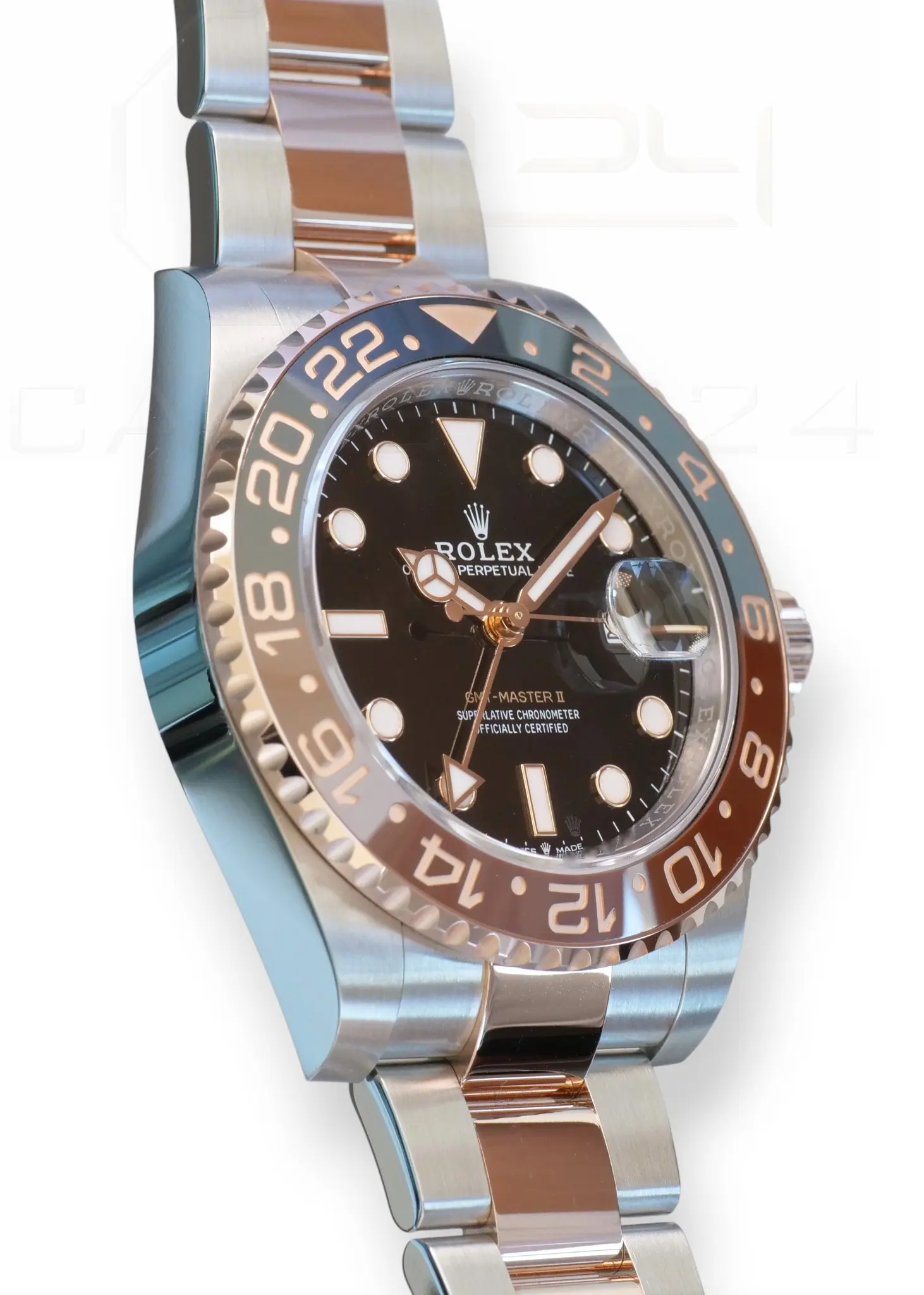 Rolex GMT Master II Rootbeer 126711CHNR, the highly desirable, iconic and historically rich, in a very beautiful configuration of 904L Oystersteel and 18ct Everose gold, and a spectacular brown-black ceramic bezel.