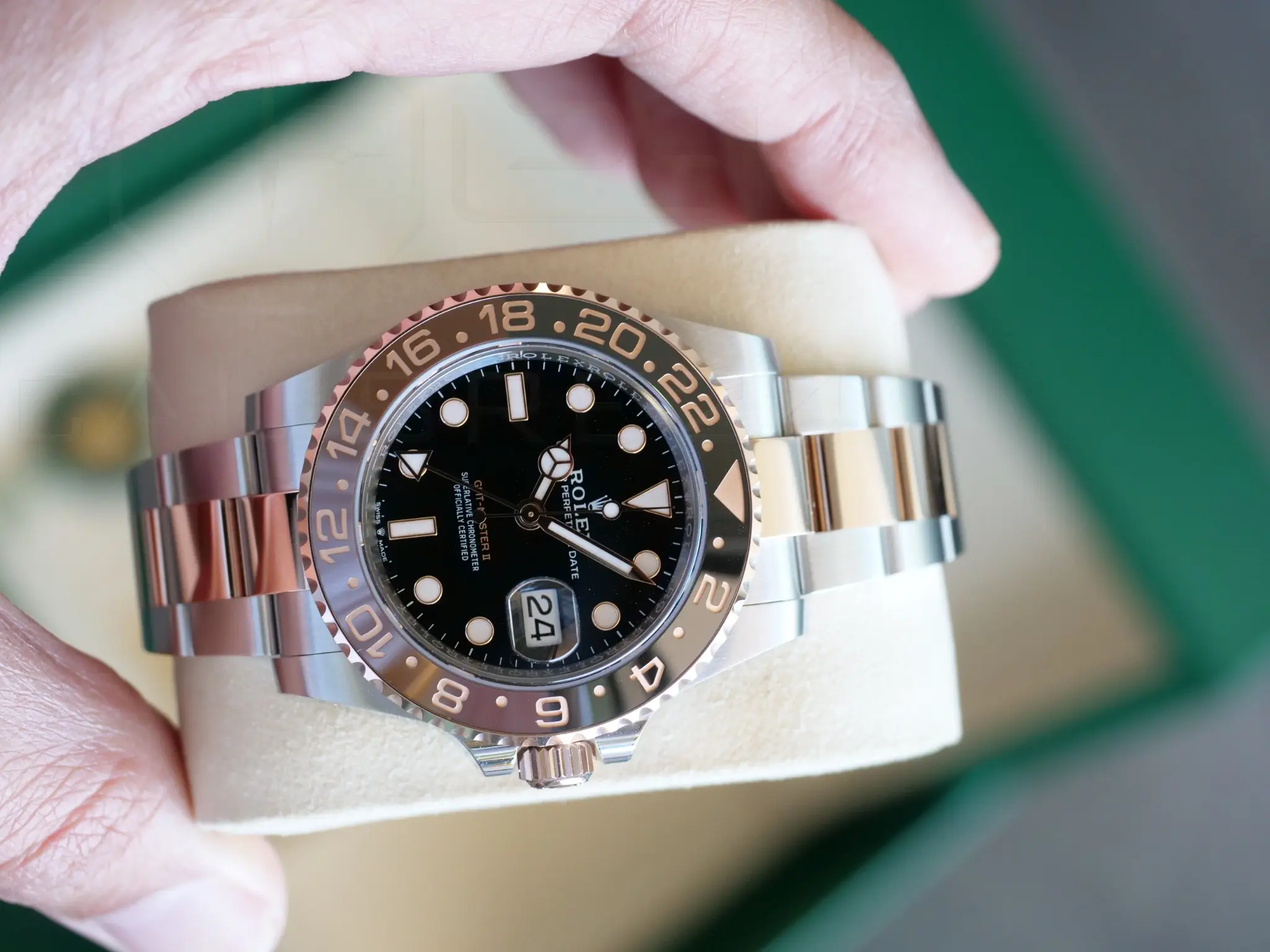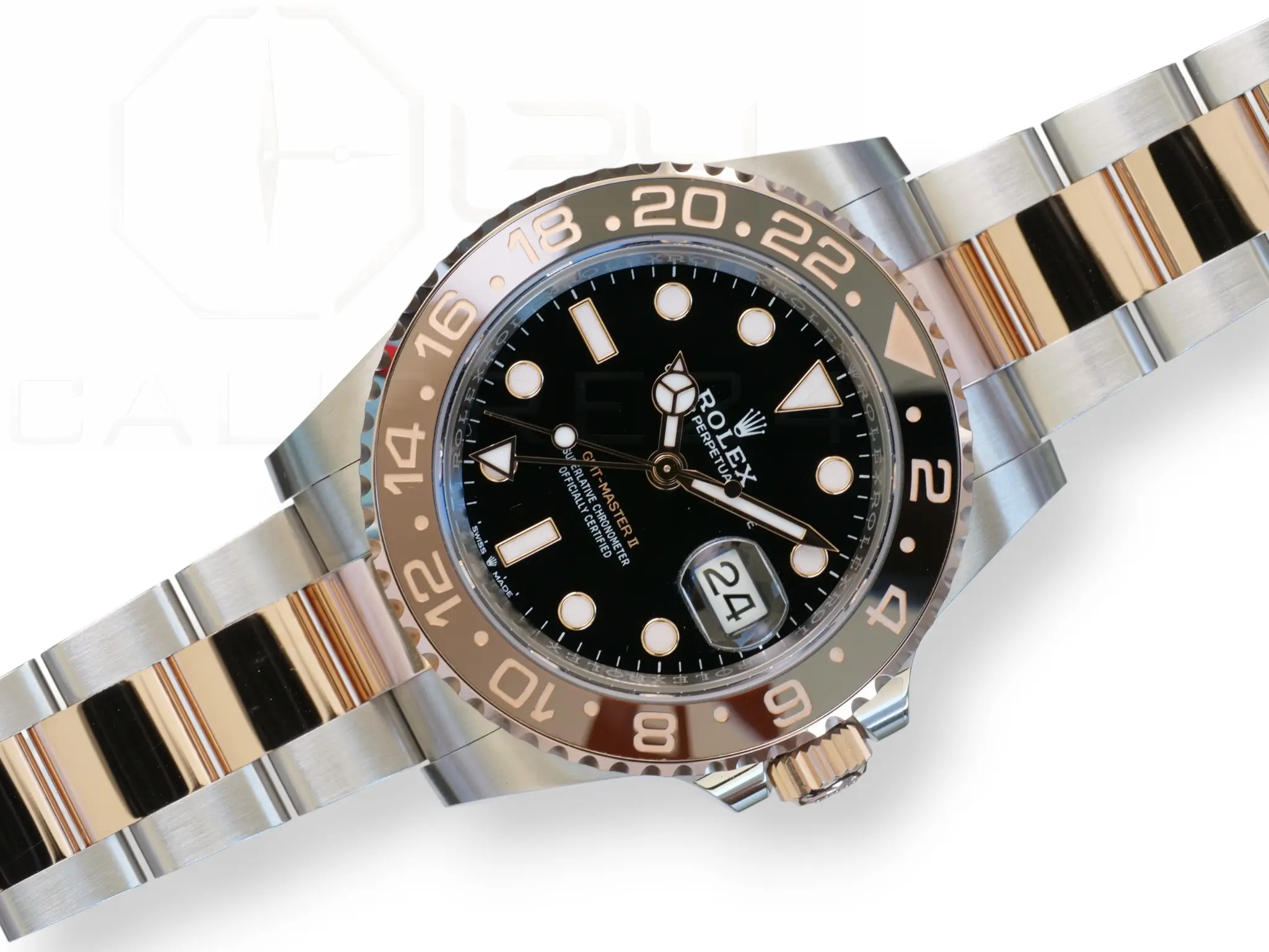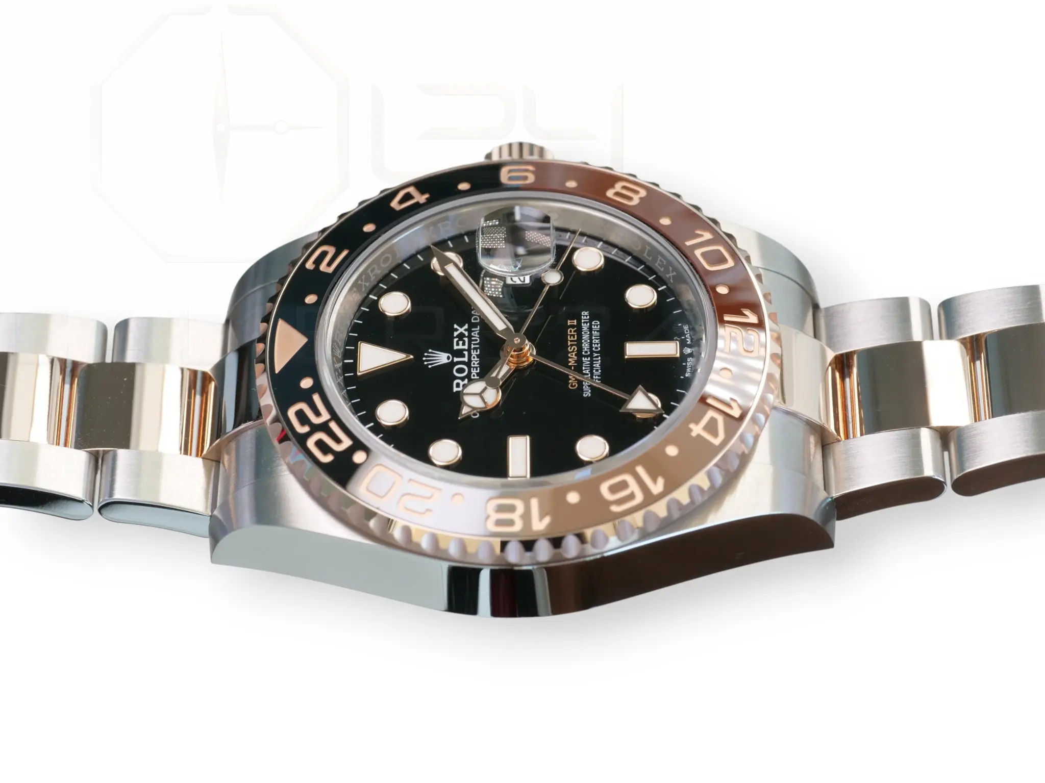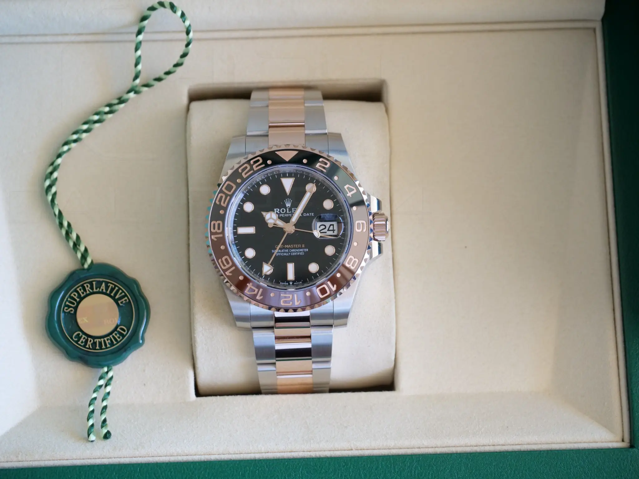 Rolex GMT Master II Rootbeer 126711CHNR, the highly desirable, iconic and historically rich, in a very beautiful configuration of 904L Oystersteel and 18ct Everose gold, and a spectacular brown-black ceramic bezel.