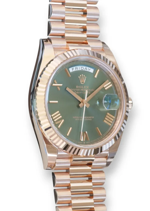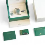The vibrant ceramic bezel not only punctuates the watch’s distinct identity but is also virtually scratchproof and immune to fading. The combination of white gold, green dial, and the “Sprite” bezel distinguishes it as a grail piece within the contemporary GMT catalog. Practical for frequent travelers and visually magnetic in any setting, reference 126729VTNR reaffirms Rolex’s ability to innovate within its own traditions. Water resistance is rated to a robust 100 meters, ensuring utility rivals prestige. Its release marks not just another GMT, but a category-defining evolution appealing to advanced collectors and those who appreciate the nuances of horological progress. Unworn and unused in condition with some factory stickers still intact, complete set with Rolex boxes and papers dated 2025.