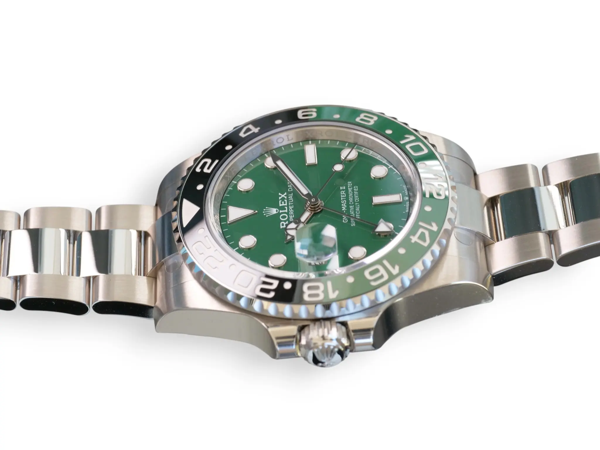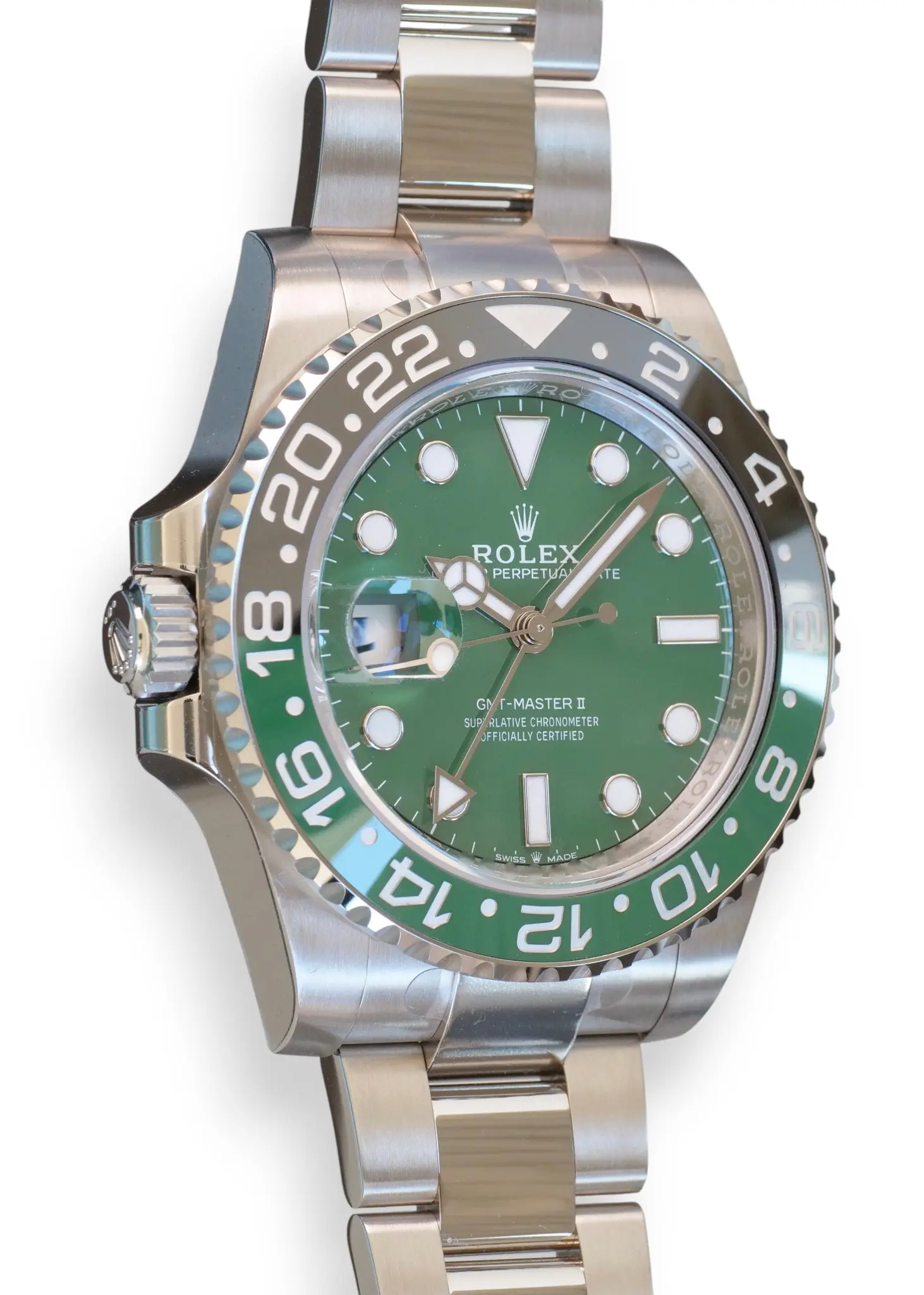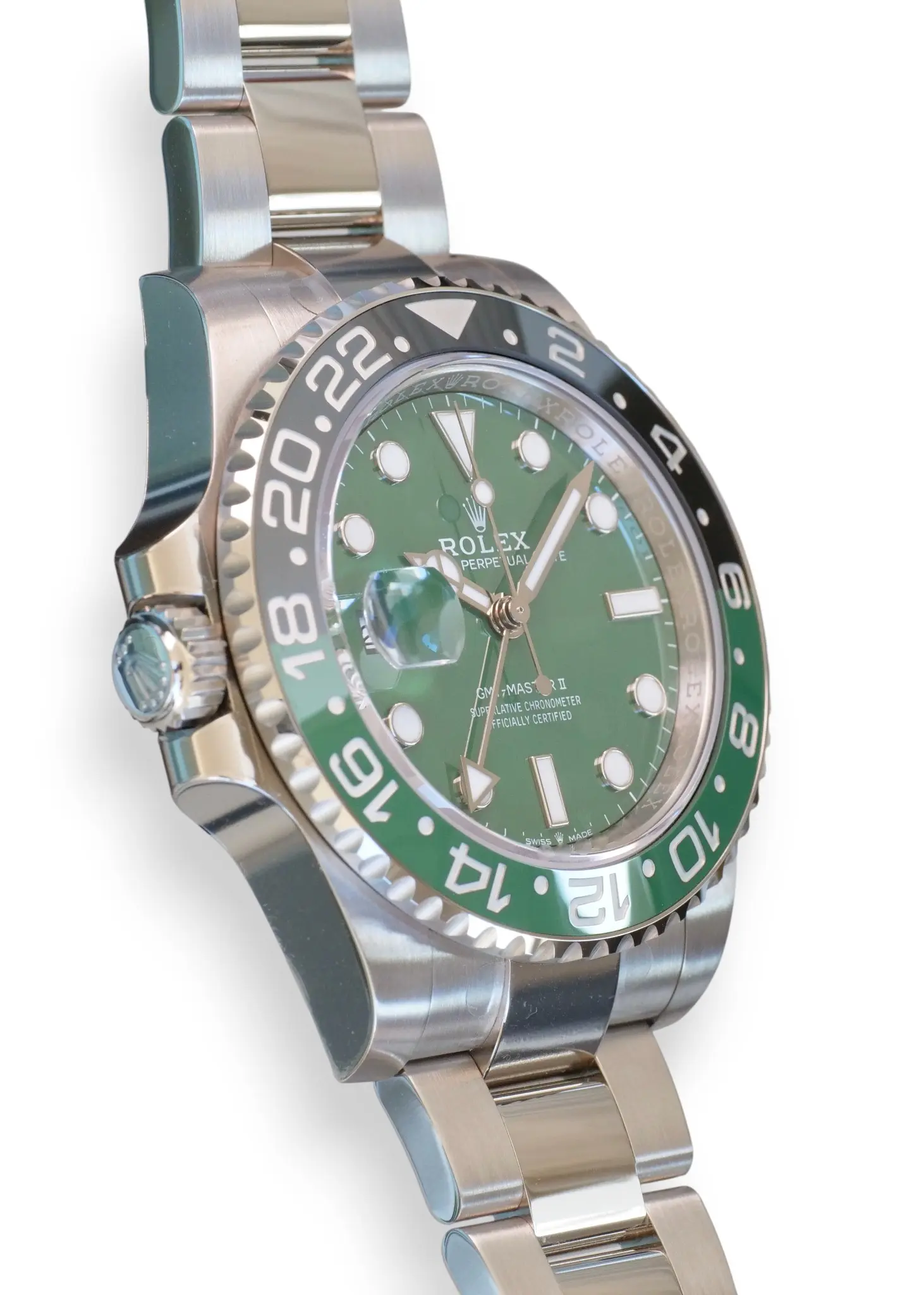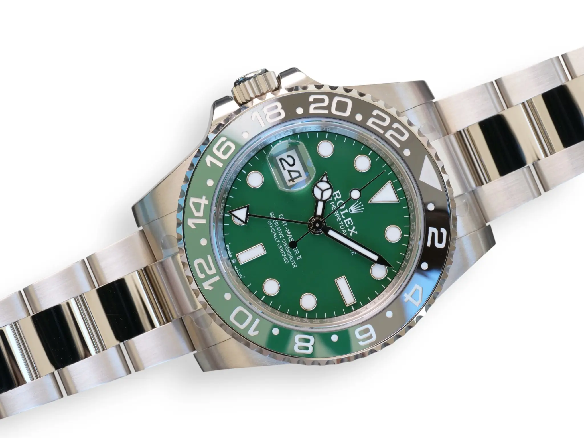 Rolex GMT Master-II White Gold Sprite, Rolex elevated the legacy of its legendary travel watch with the introduction of the GMT-Master II reference 126729VTNR, debuting a striking green-and-black Cerachrom bezel and a lush green dial. Crafted in solid 18K white gold, this model is a rare fusion of precious metal luxury and uncompromising sport utility, further enhanced by the coveted left-hand crown—an historic first for the GMT-Master II. The robust 40mm Oyster case combines elegance with the trademark durability of Rolex’s monobloc construction, ensuring its standing as a future collector classic. At its heart, the automatic Rolex caliber 3285 movement delivers a 70-hour power reserve, facilitating the signature independent GMT function prized by globetrotters and watch scholars alike.