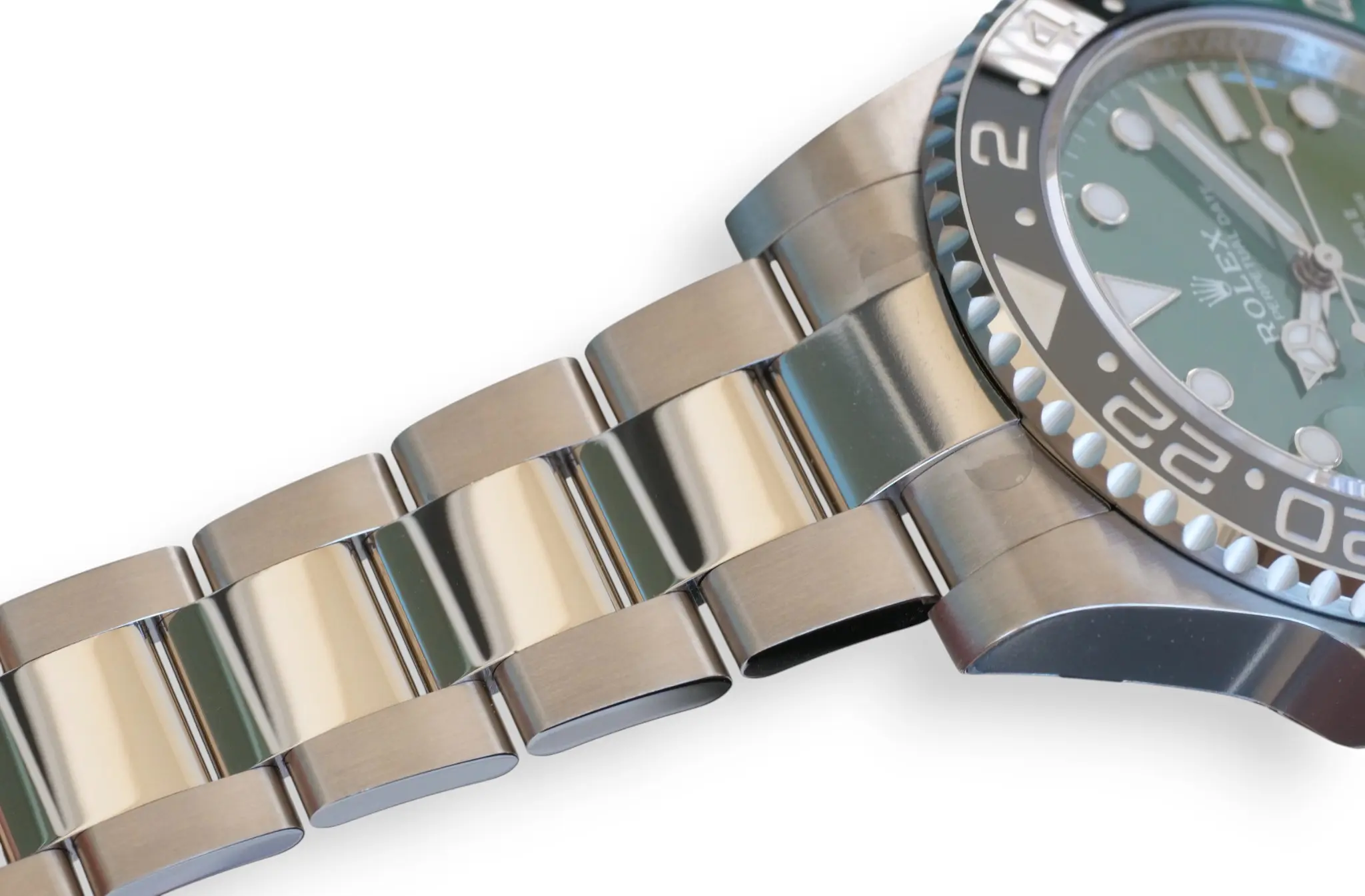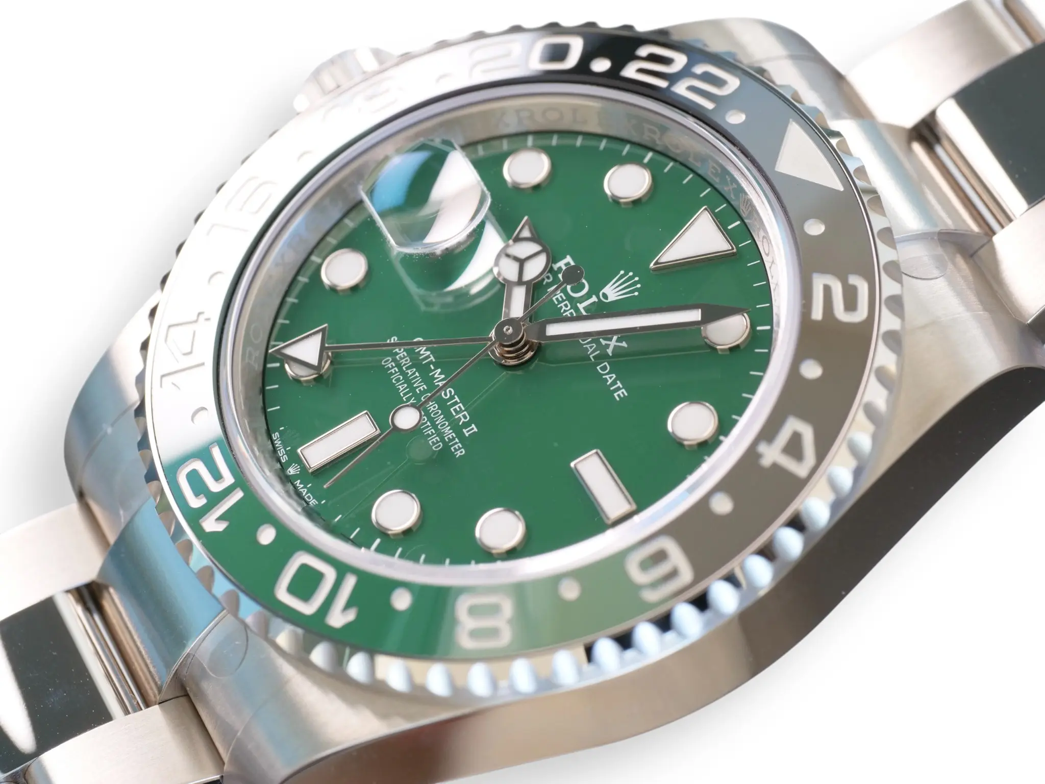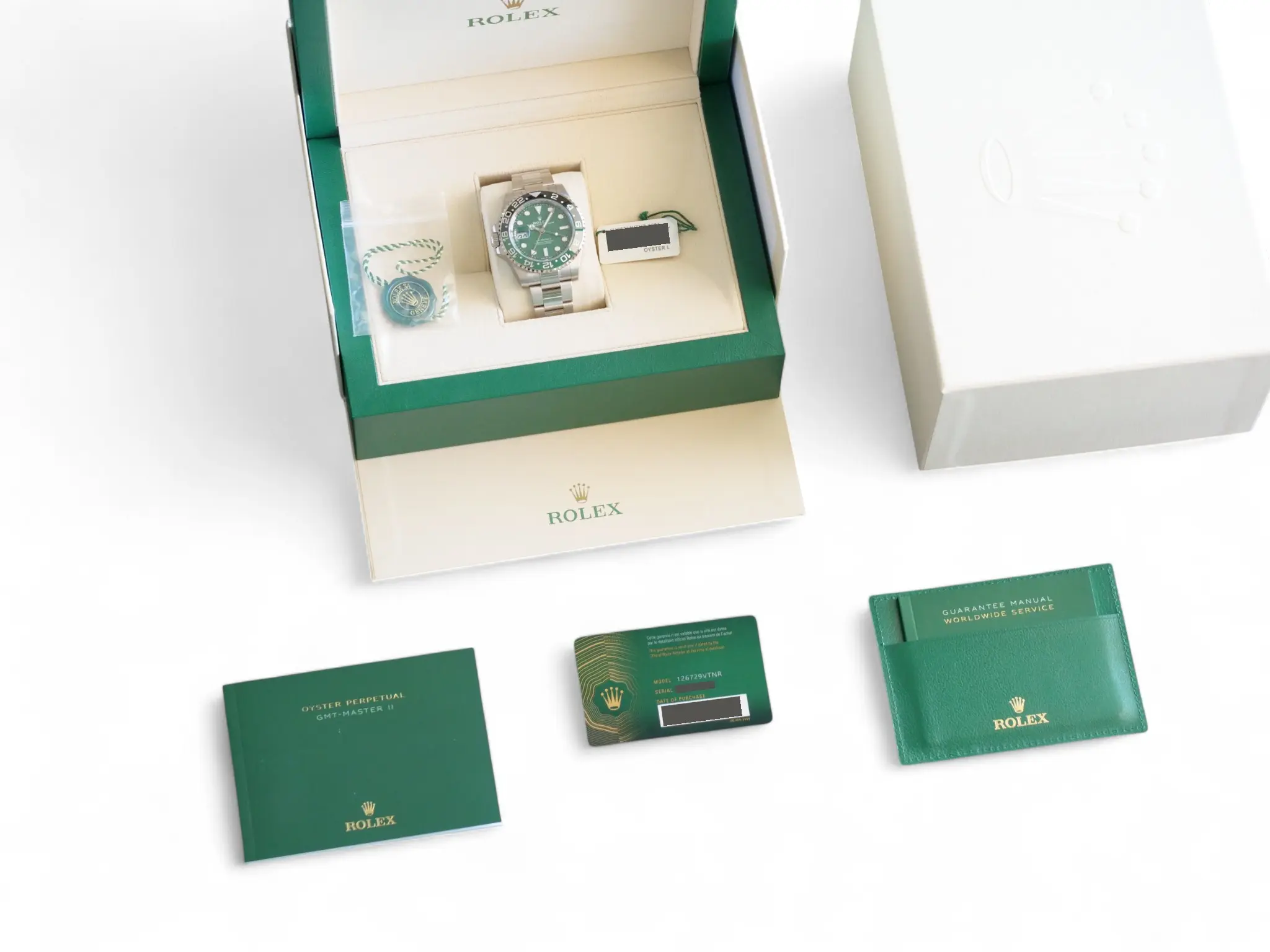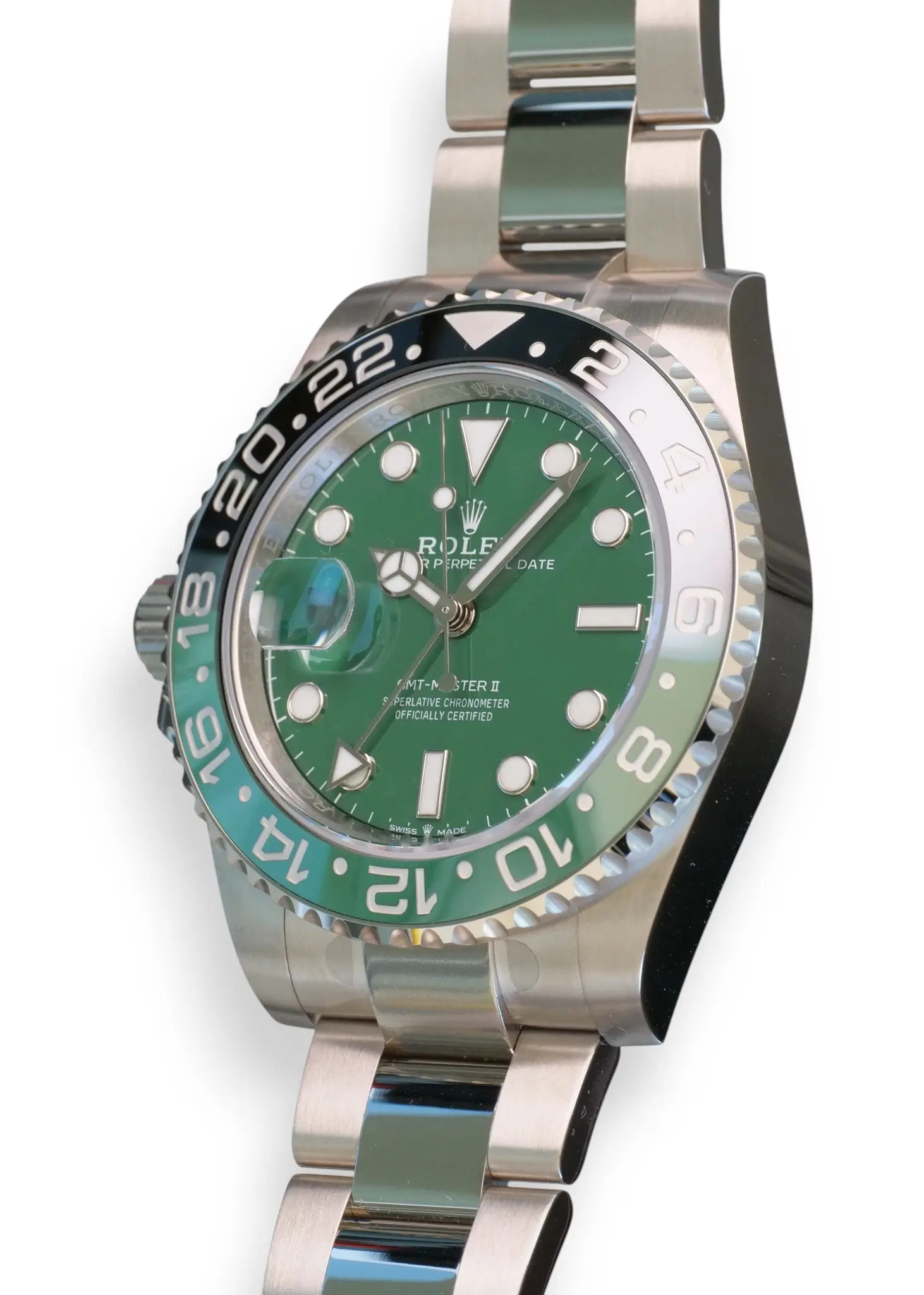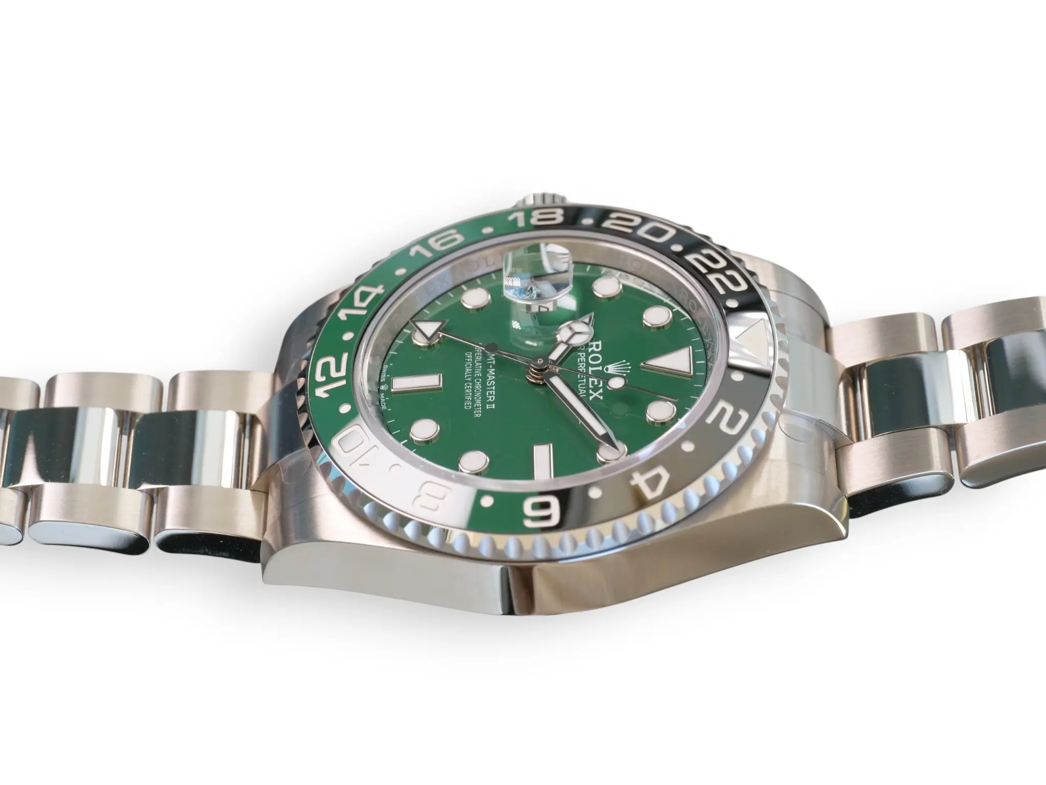 Rolex GMT Master-II White Gold Sprite, Rolex elevated the legacy of its legendary travel watch with the introduction of the GMT-Master II reference 126729VTNR, debuting a striking green-and-black Cerachrom bezel and a lush green dial. Crafted in solid 18K white gold, this model is a rare fusion of precious metal luxury and uncompromising sport utility, further enhanced by the coveted left-hand crown—an historic first for the GMT-Master II. The robust 40mm Oyster case combines elegance with the trademark durability of Rolex’s monobloc construction, ensuring its standing as a future collector classic. At its heart, the automatic Rolex caliber 3285 movement delivers a 70-hour power reserve, facilitating the signature independent GMT function prized by globetrotters and watch scholars alike.