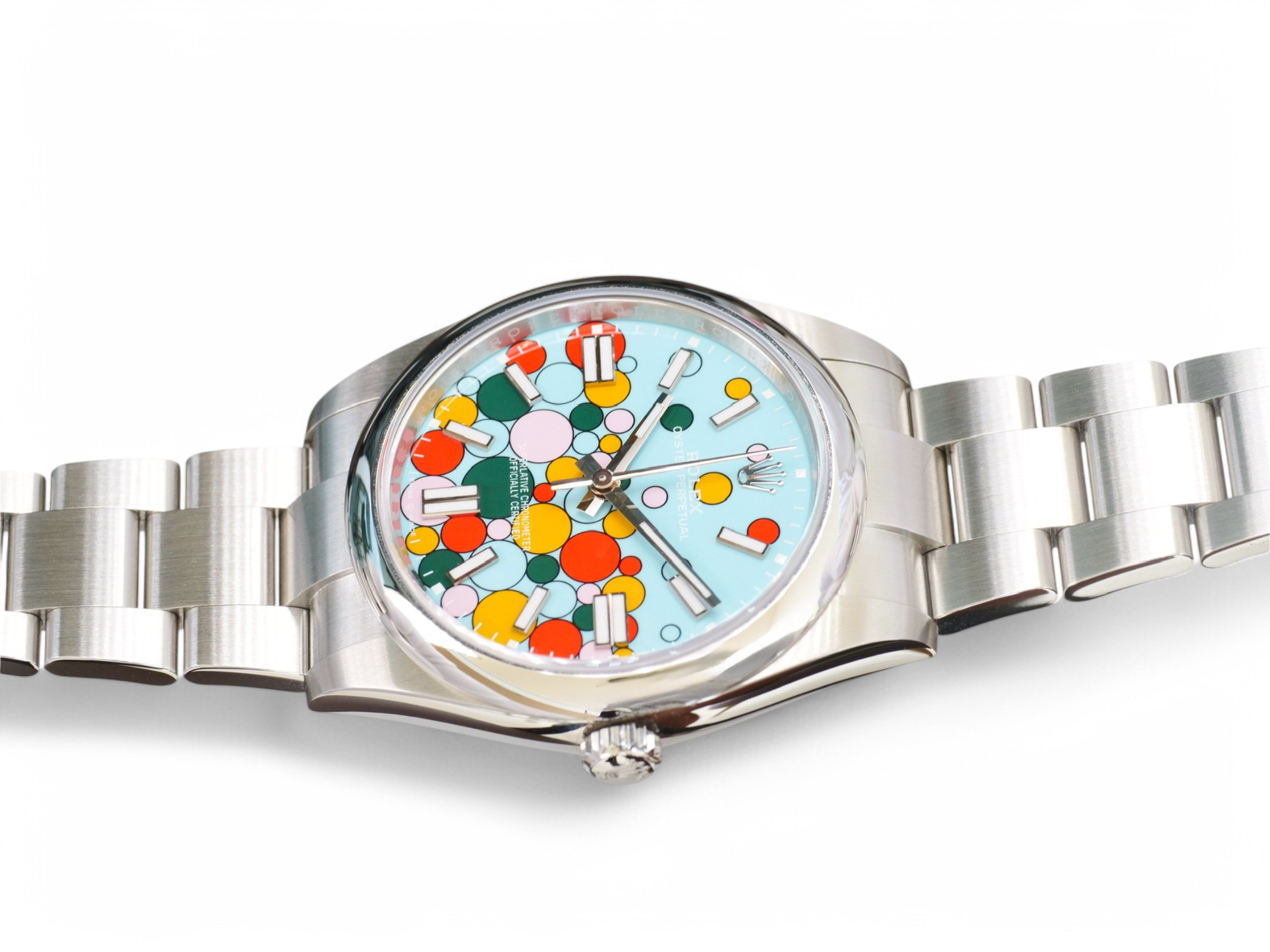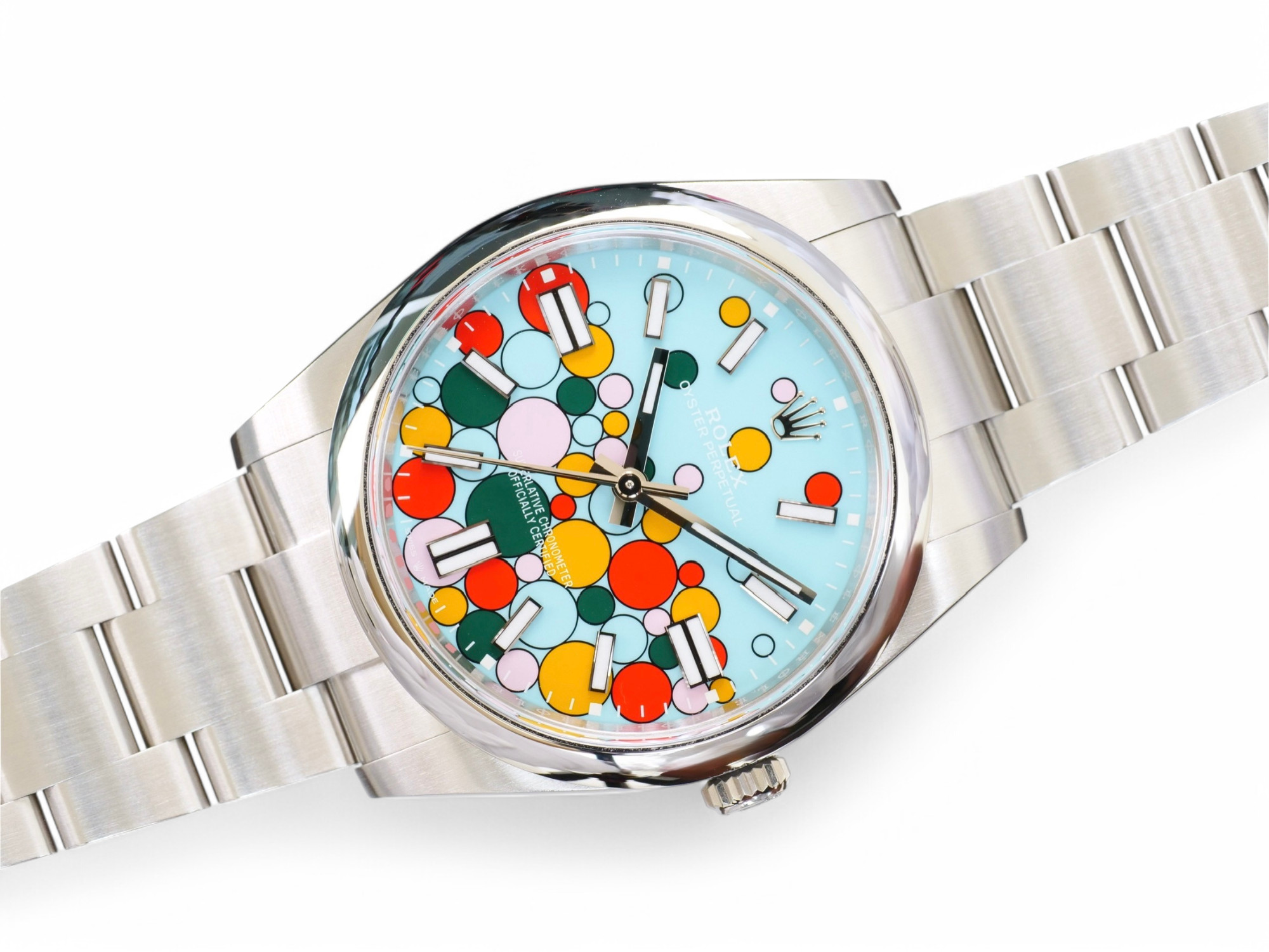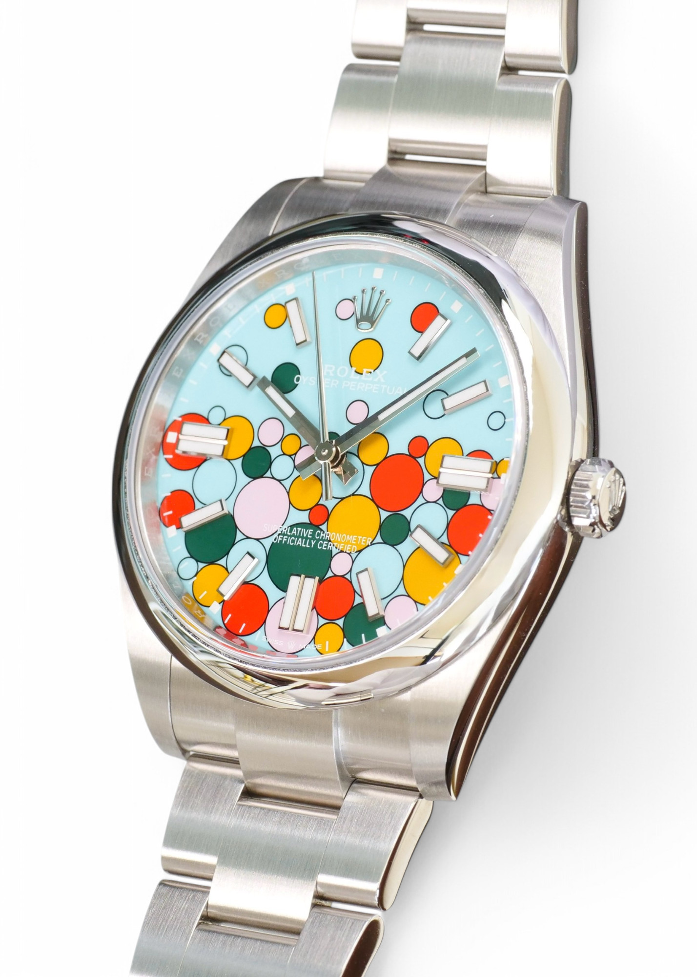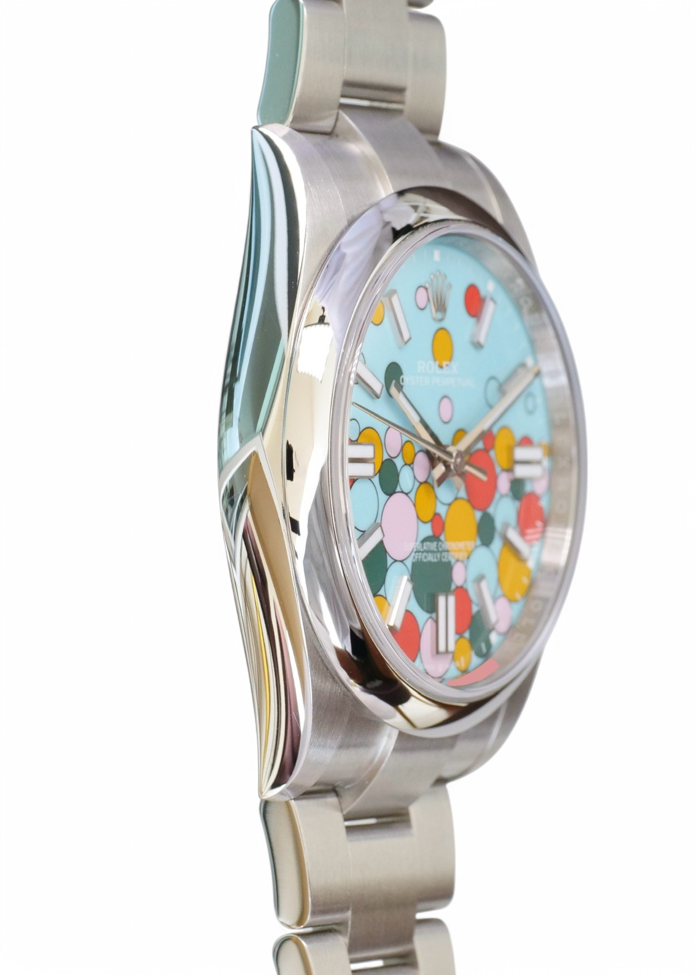The very sought after, now discontinued, and extremely hard-to-find Turquoise Rolex Oyster Perpetual 41 “Celebration-motif Dial” model 124300.