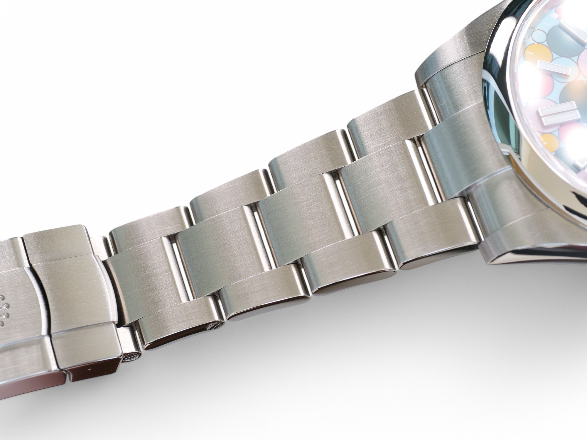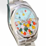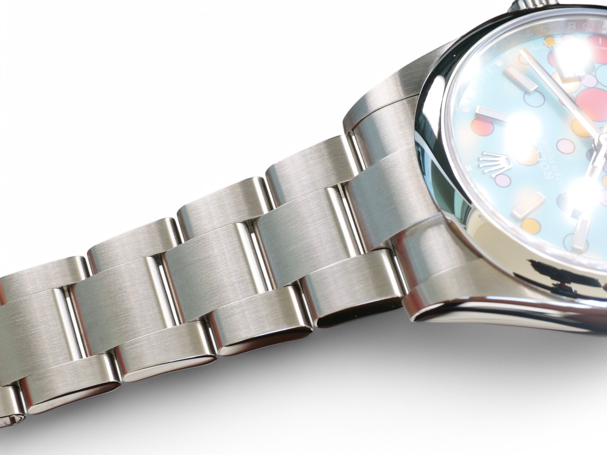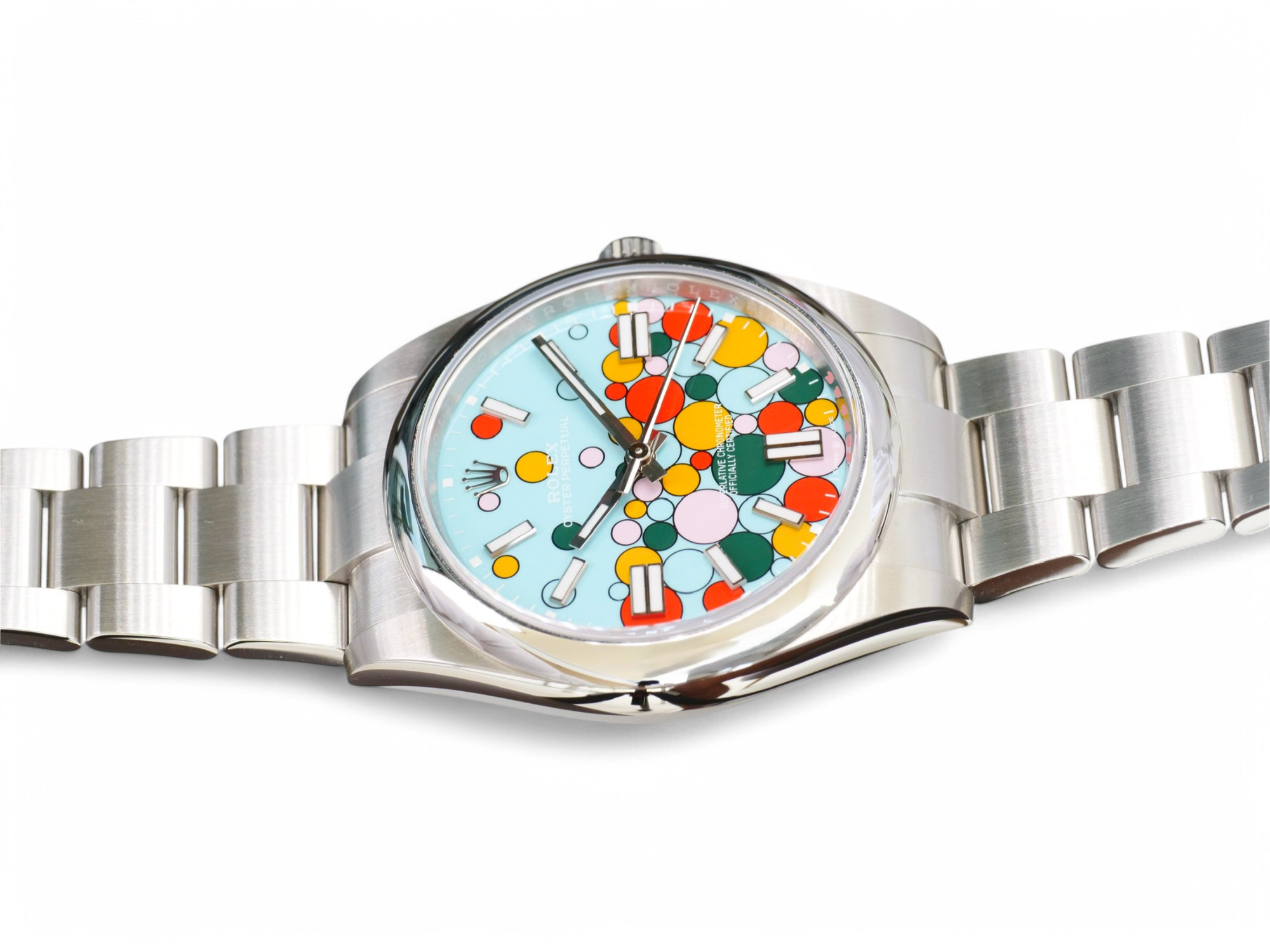 The very sought after, now discontinued, and extremely hard-to-find Turquoise Rolex Oyster Perpetual 41 “Celebration-motif Dial” model 124300.