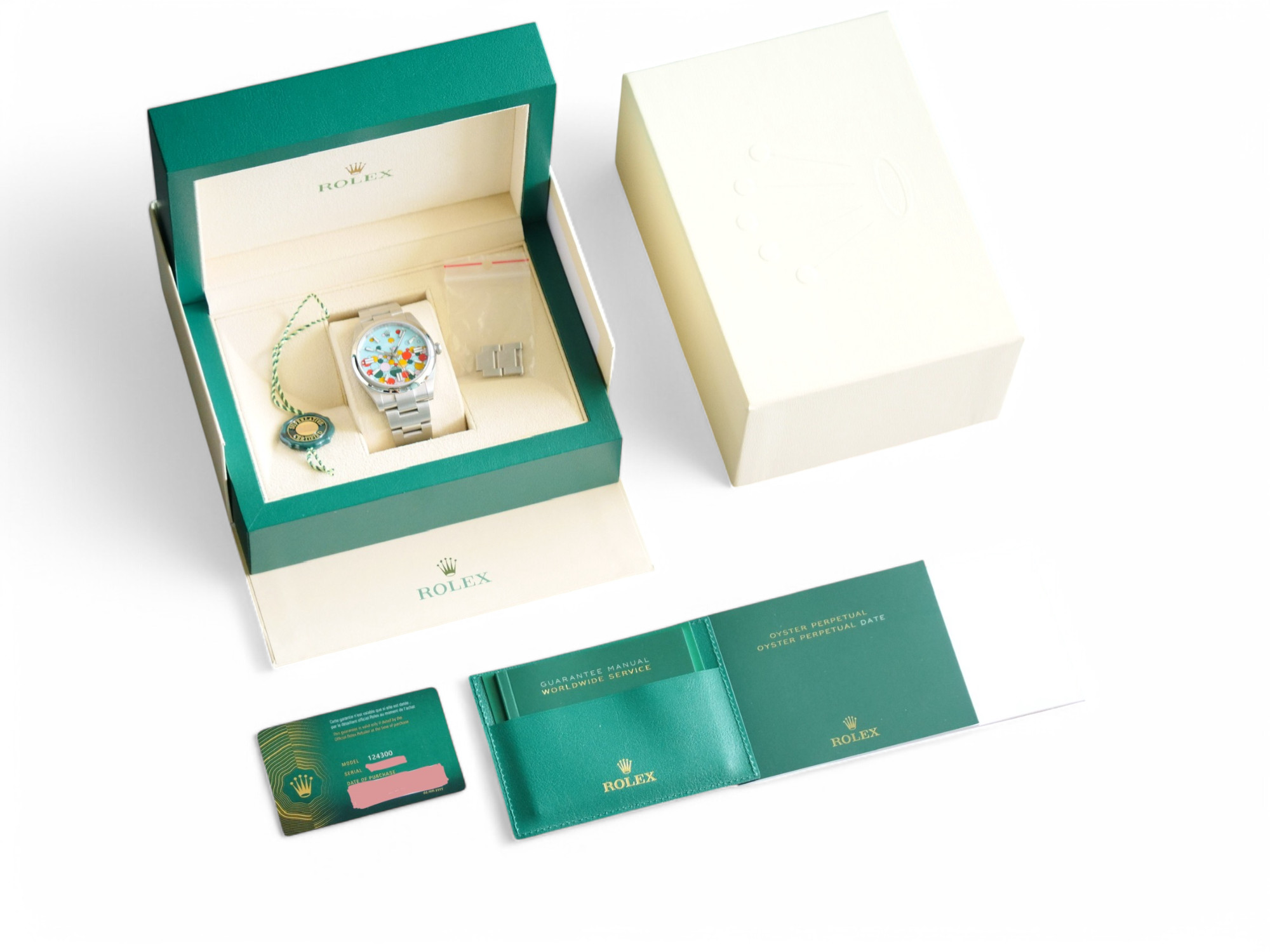 The Rolex Oyster Perpetual 41 Celebration-Motif is offered in Mint condition, dated 2024 and comes as full set with factory presentation boxes and papers, including the green hang tag, and the original sales invoice from the Rolex boutique confirming the dial — refer to the last photo for full delivery contents.