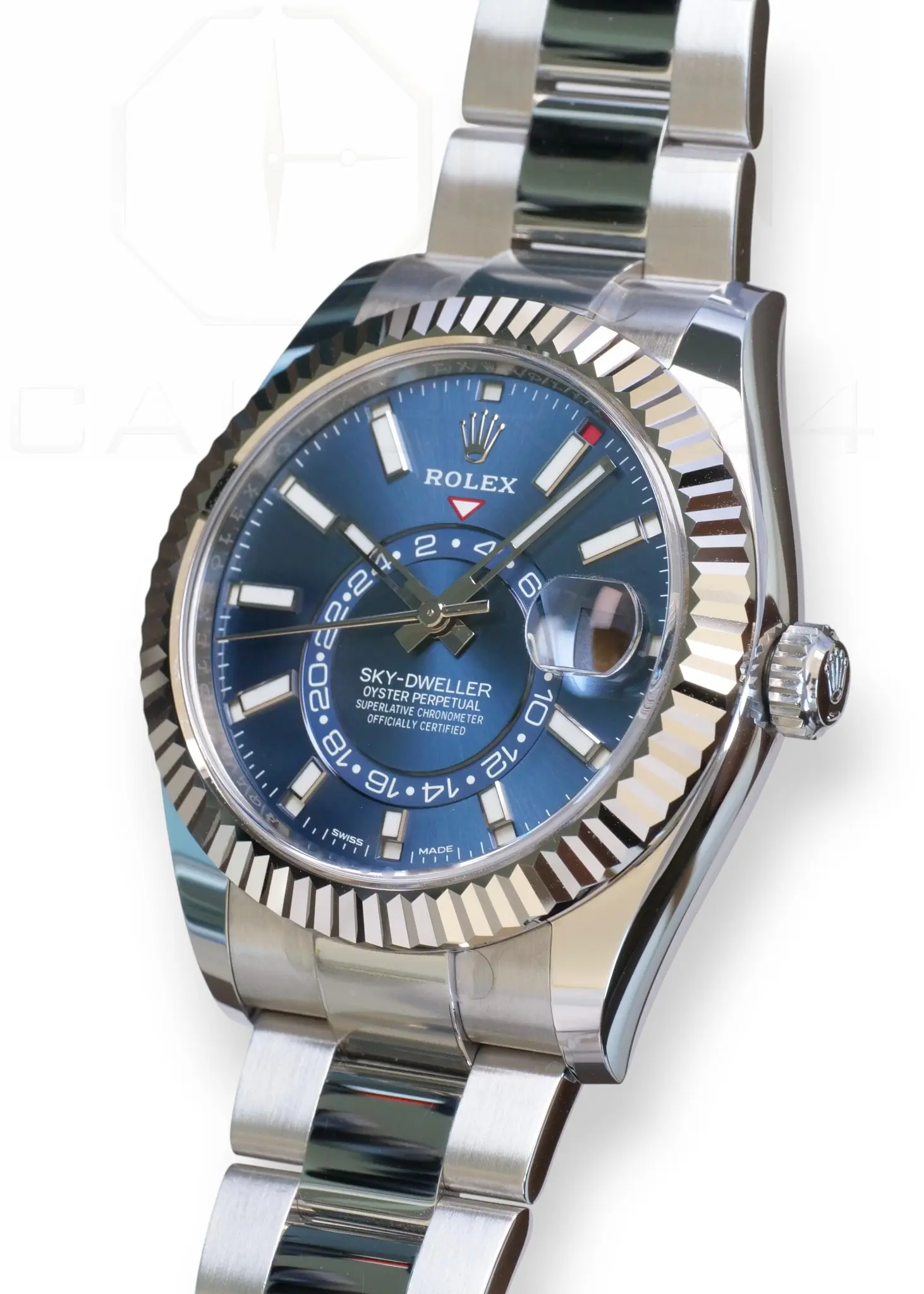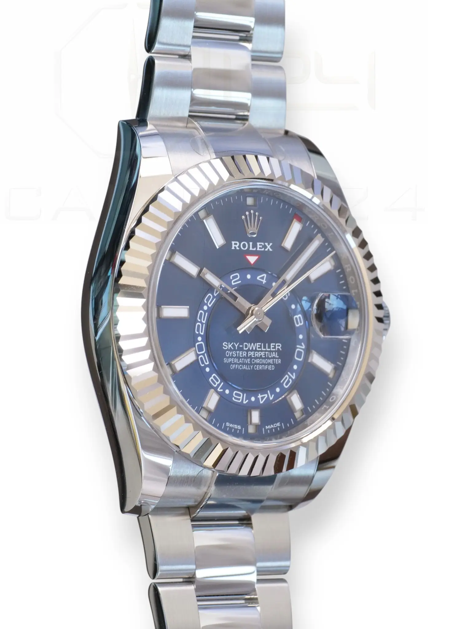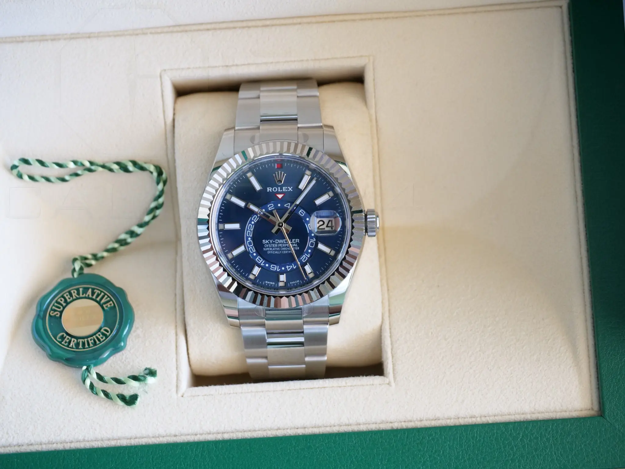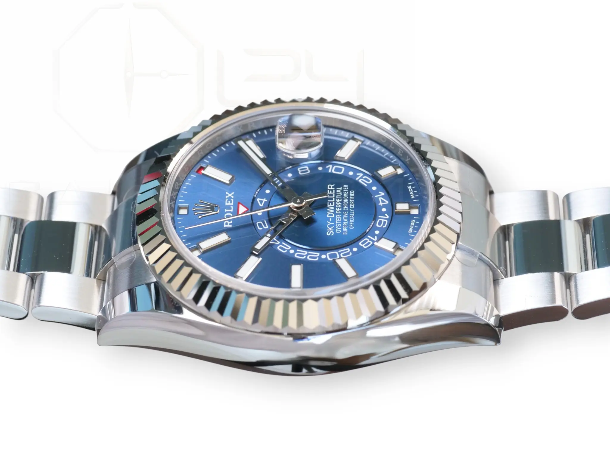 Rolex Sky-Dweller Blue Dial 326934 Oyster Bracelet, one of the most desirable watches and technically, the highest complication Rolex watch to exist, with the Annual Calendar, dual time and date functionality, in a spectacular sunburst blue dial with the iconic Oystersteel bracelet.
