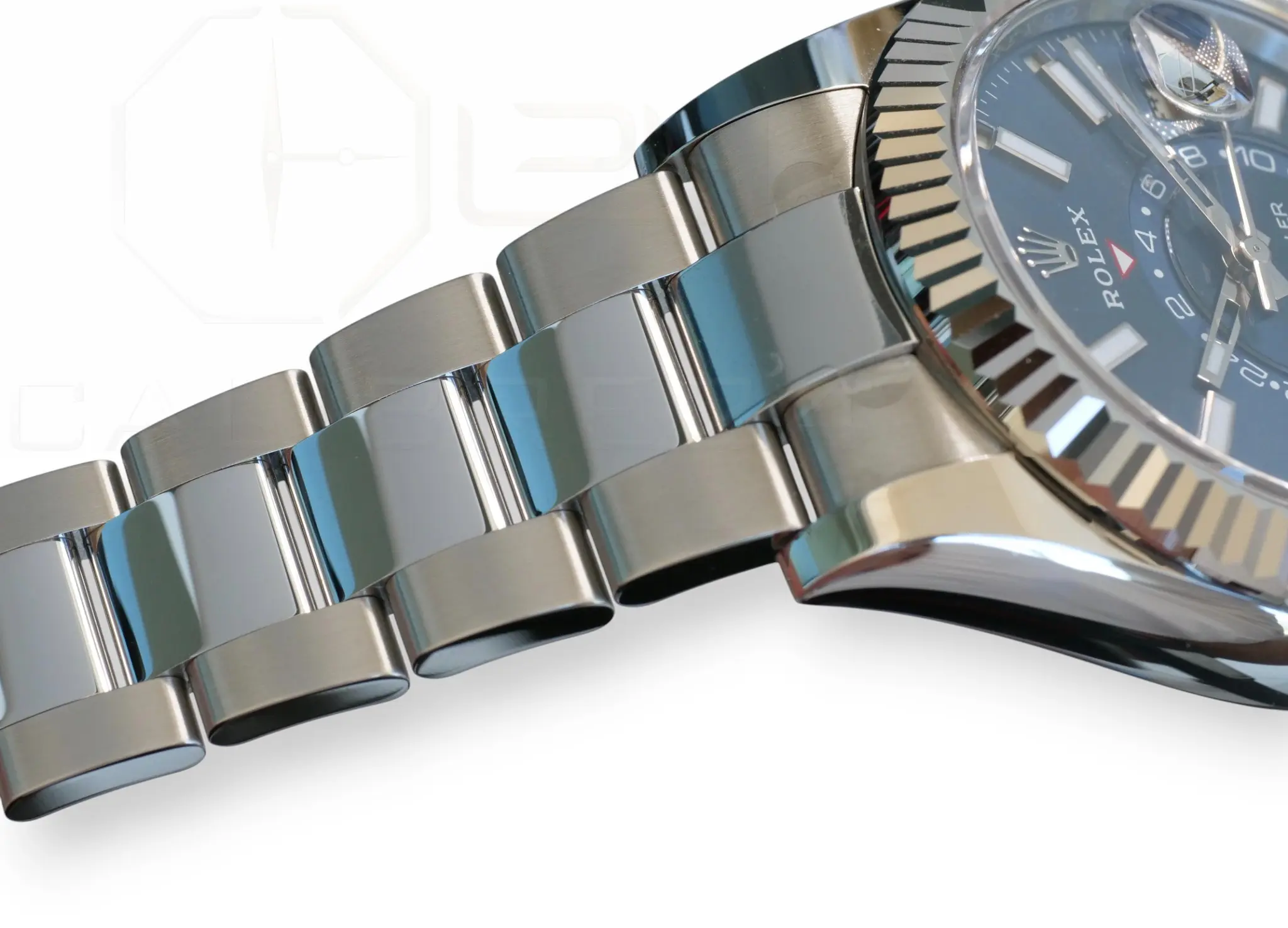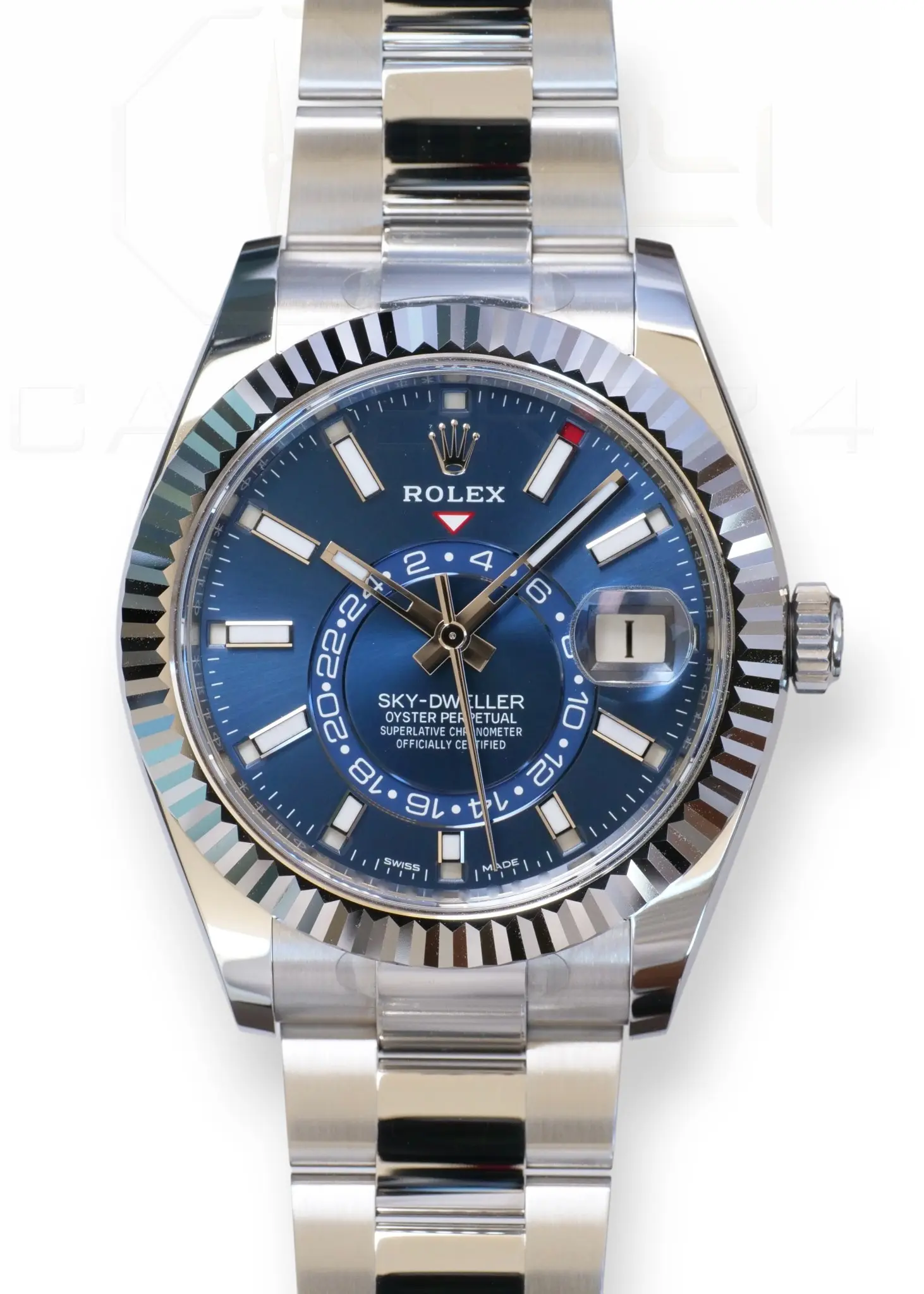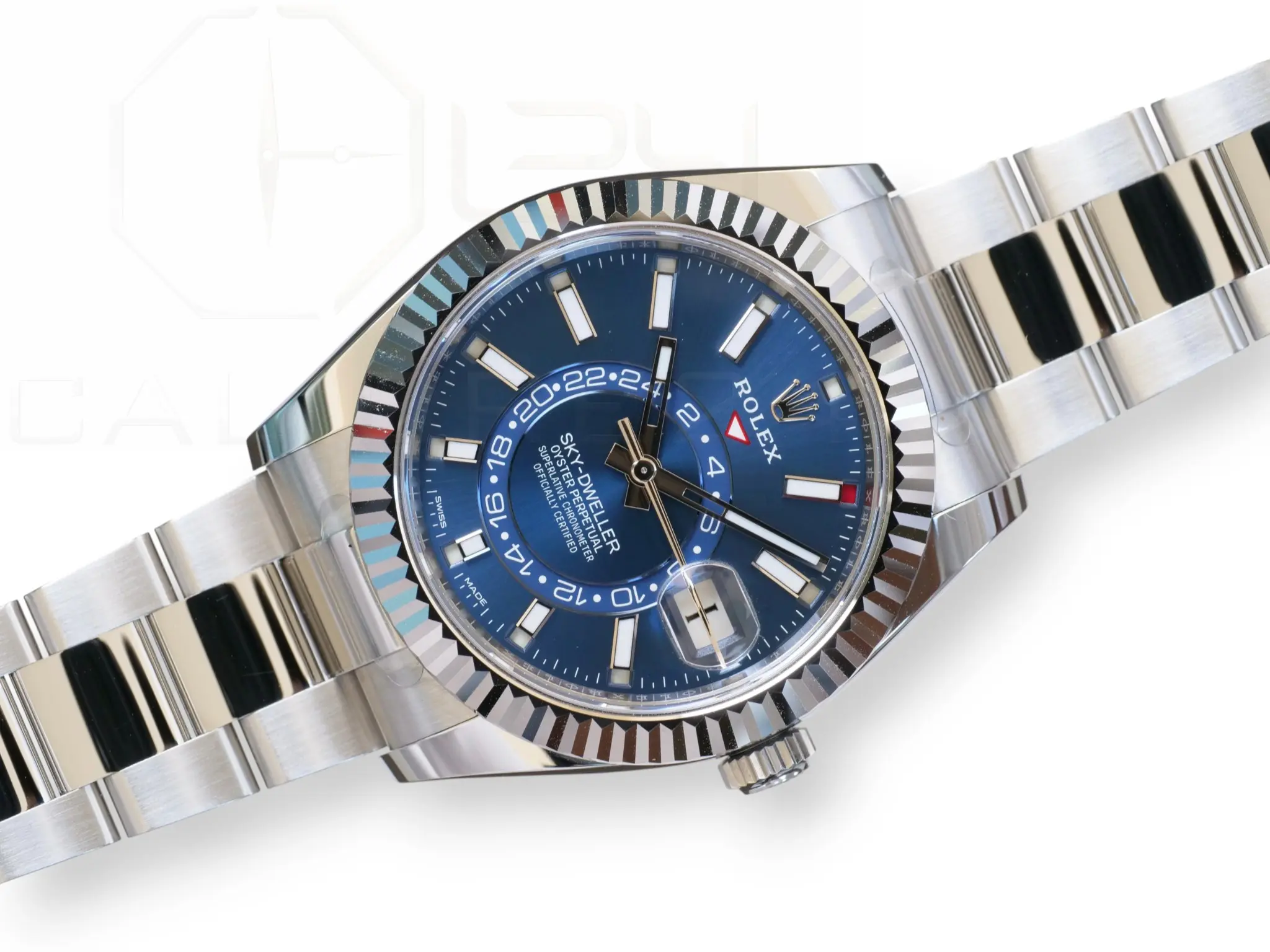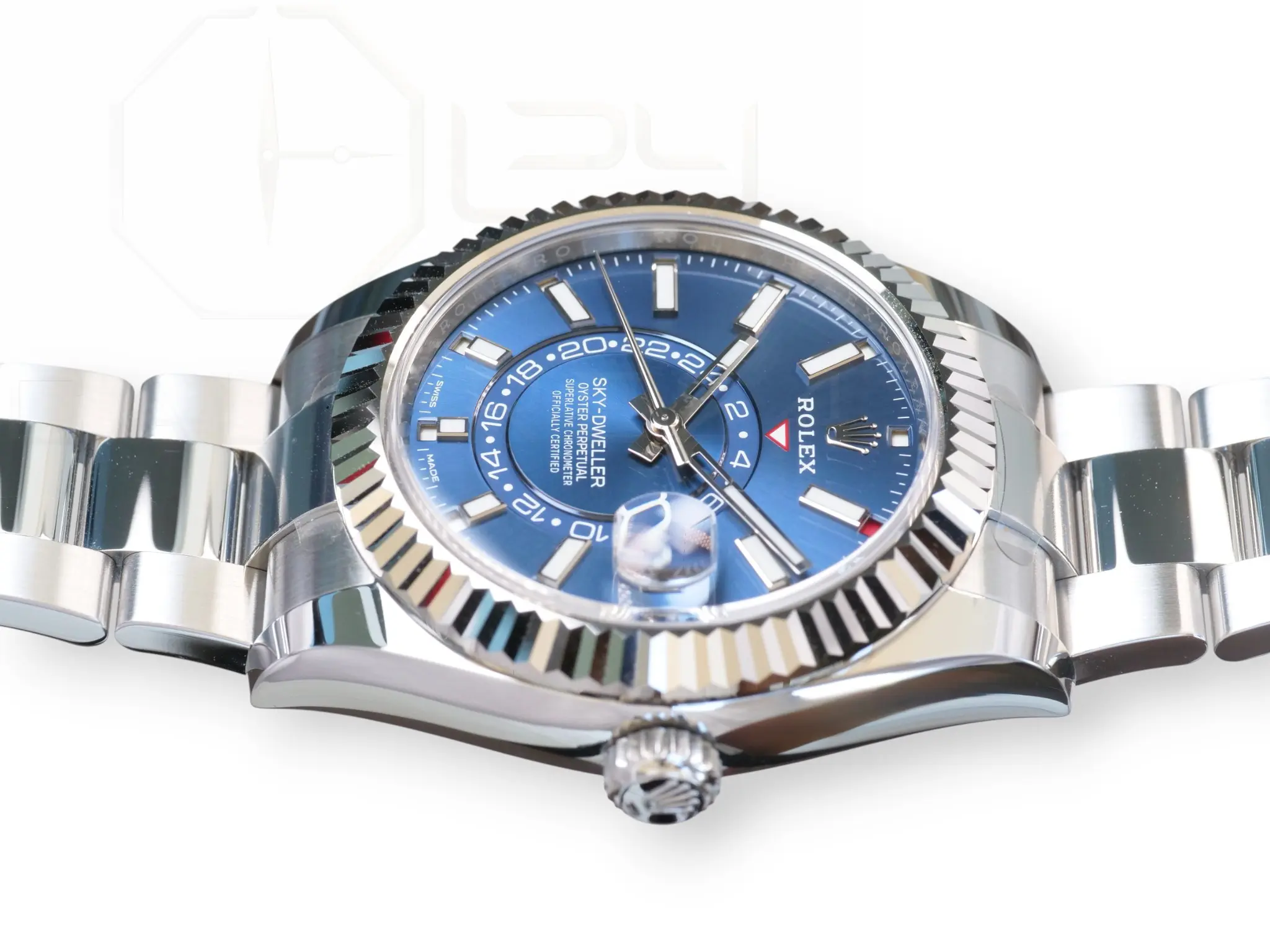 Rolex Sky-Dweller Blue Dial 326934 Oyster Bracelet, one of the most desirable watches and technically, the highest complication Rolex watch to exist, with the Annual Calendar, dual time and date functionality, in a spectacular sunburst blue dial with the iconic Oystersteel bracelet.