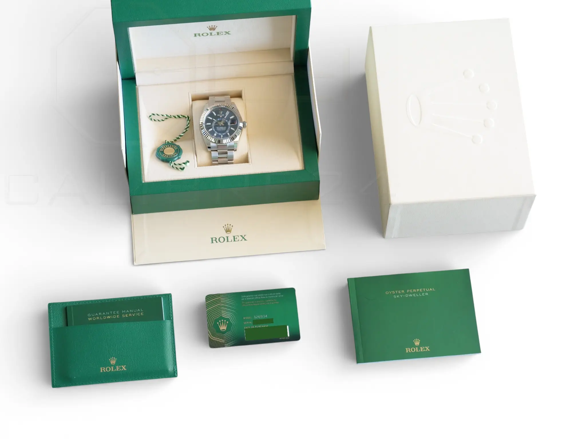 All photos are from the actual Rolex Skydweller Blue Dial 326934 timepiece for sale including the photo with delivery contents and form part of the description. The photos are indicative of the condition of the watch, and the items that come included in the box.