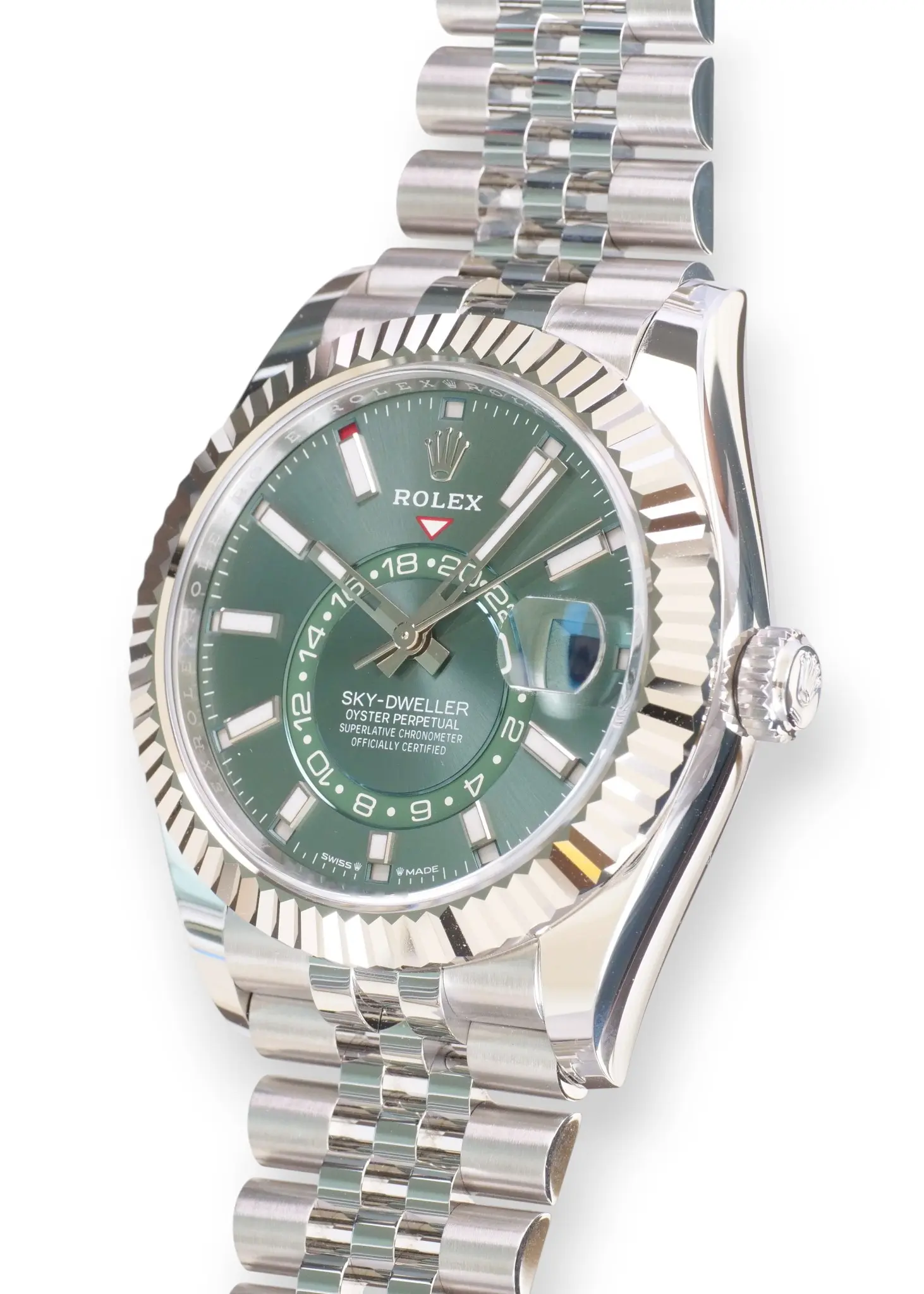 Rolex Sky-dweller White Dial, 336934, Oystersteel bracelet, a very beautiful and technically, the highest complication Rolex watch to exist with an annual calendar, dual time and date complication, all offered while featuring the iconic and timeless Rolex looks in an Oyster Perpetual model.