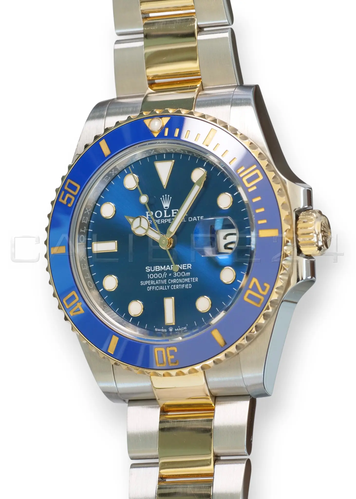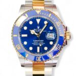 On offer for sale is a very iconic, and arguably, the most beautiful Rolex Submariner in two tone, the Bluesy, with a spectacular sunbursh and flashy blue dial, a ceramic bright blue bezel and a two tone configuration of Oystersteel and 18ct Yellow gold.