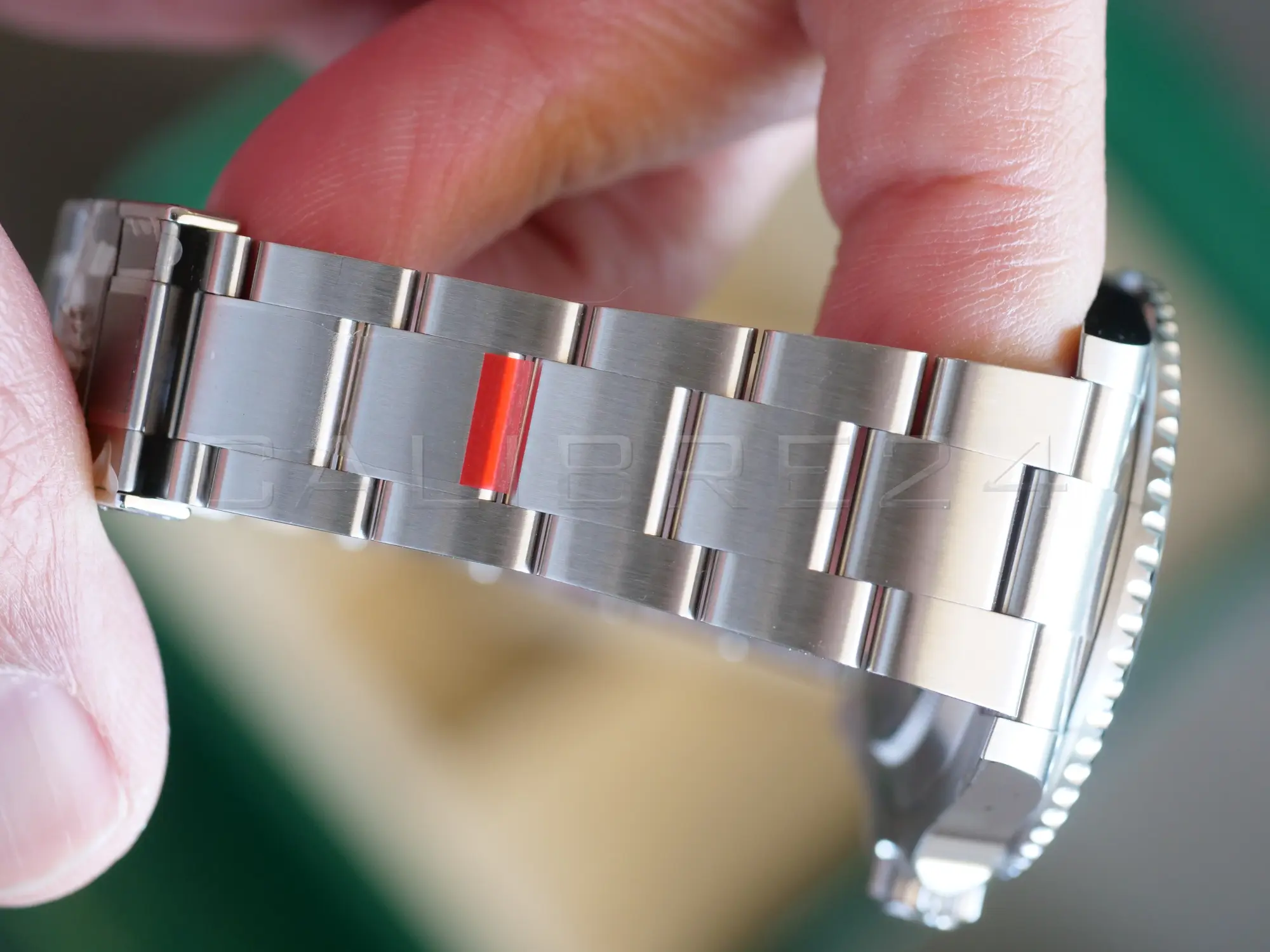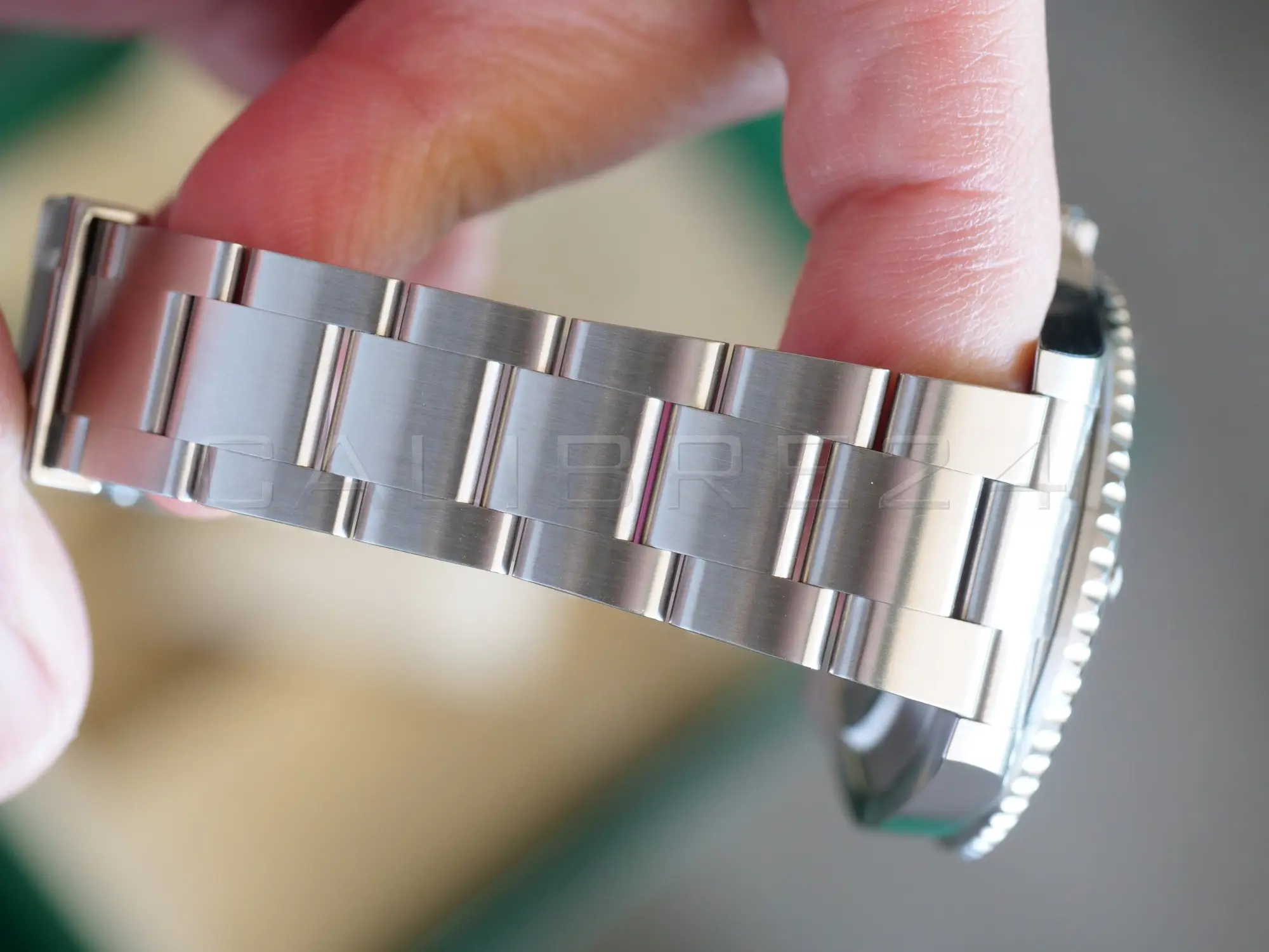 The Oyster bracelet in Oystersteel features the Oysterlock safety clasp and Glidelock extension system, allowing effortless adjustments without tools. Whether worn over a wetsuit or tailored cuff, it delivers comfort and security.
