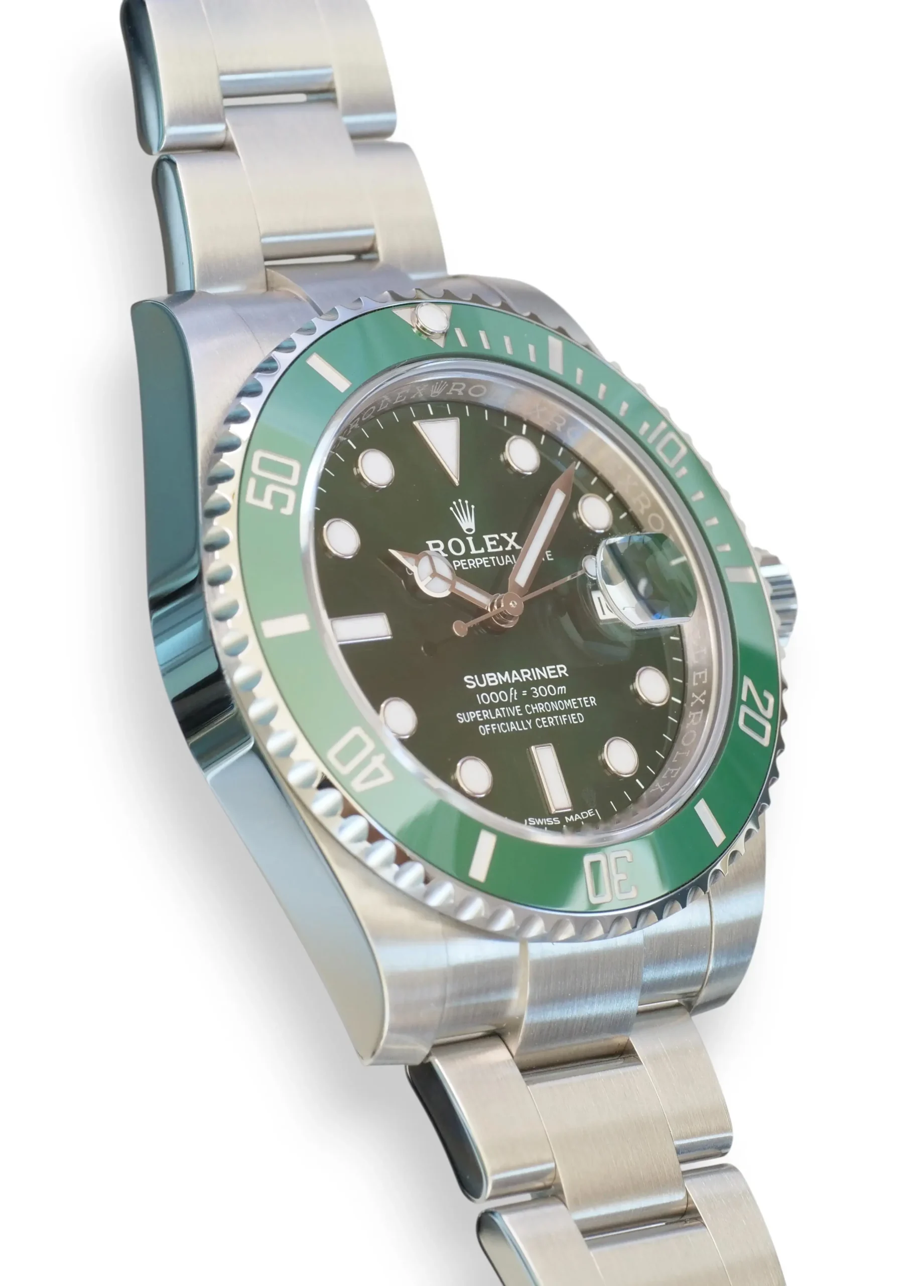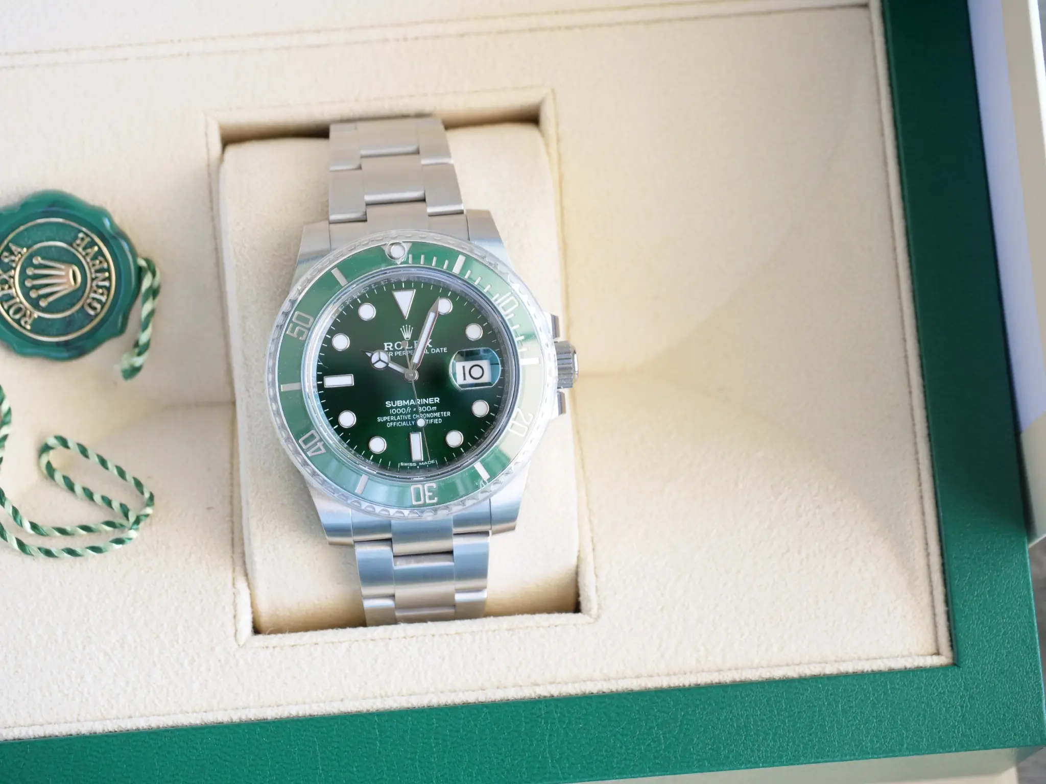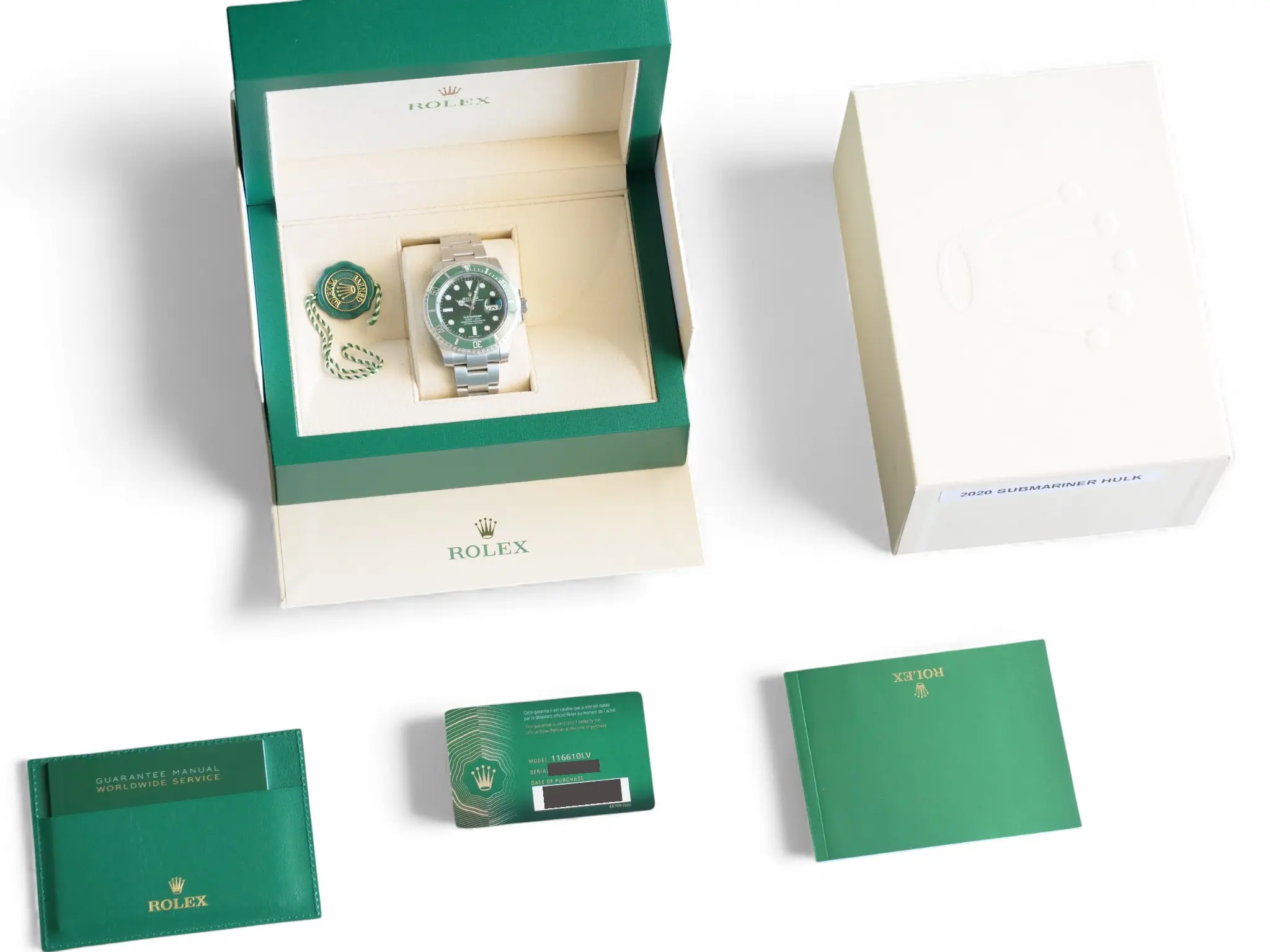 This particular example of Rolex Hulk is even rarer and the most collectible, as it is one of the last ones produced by Rolex before they were discontinued and is presented with the new-style Green computerized (NFC enabled) Rolex card, as opposed to all the previous year Hulks that were delivered with white (non-computerized) Rolex cards. The Green card Hulks were only sold by Rolex from March 2020 before they were discontinued shortly after in Q2 2020 and replaced by the now-in-production Starbucks 126610LV with black dial.