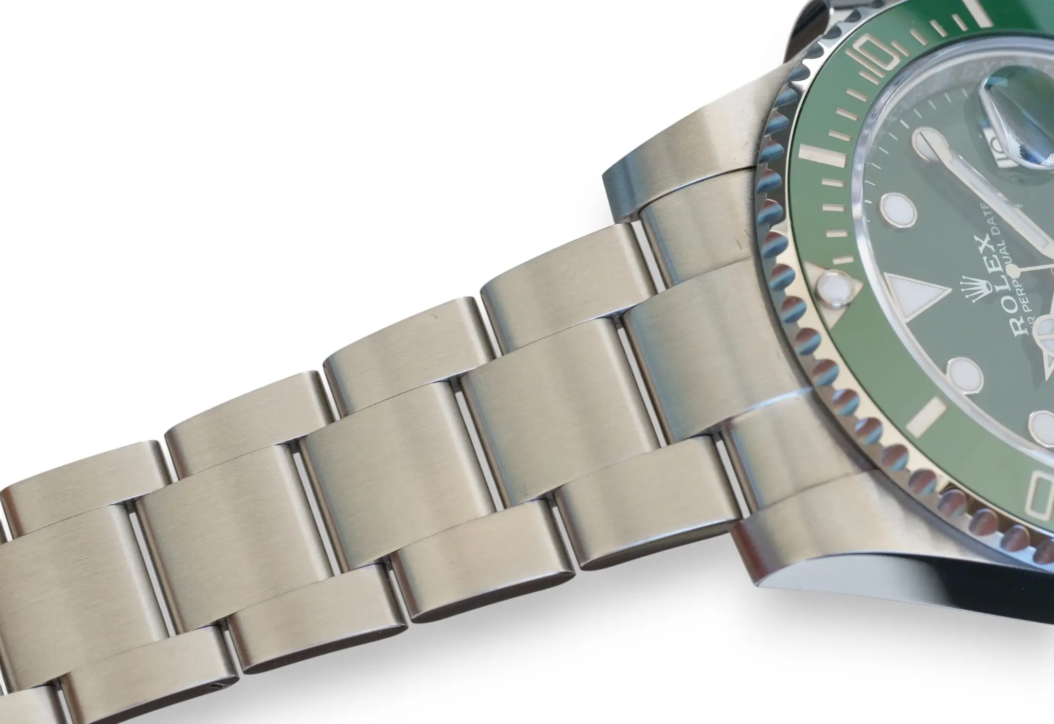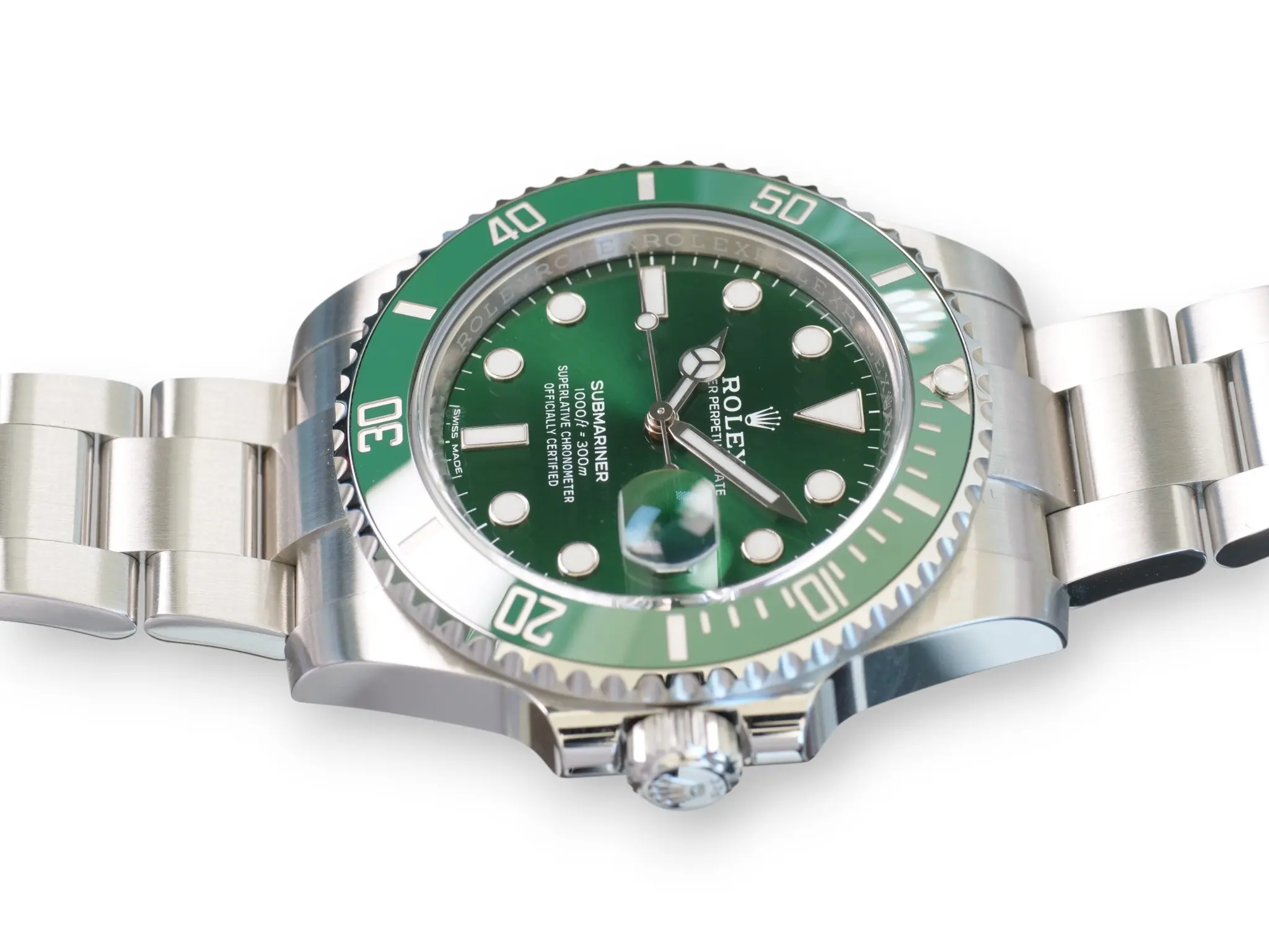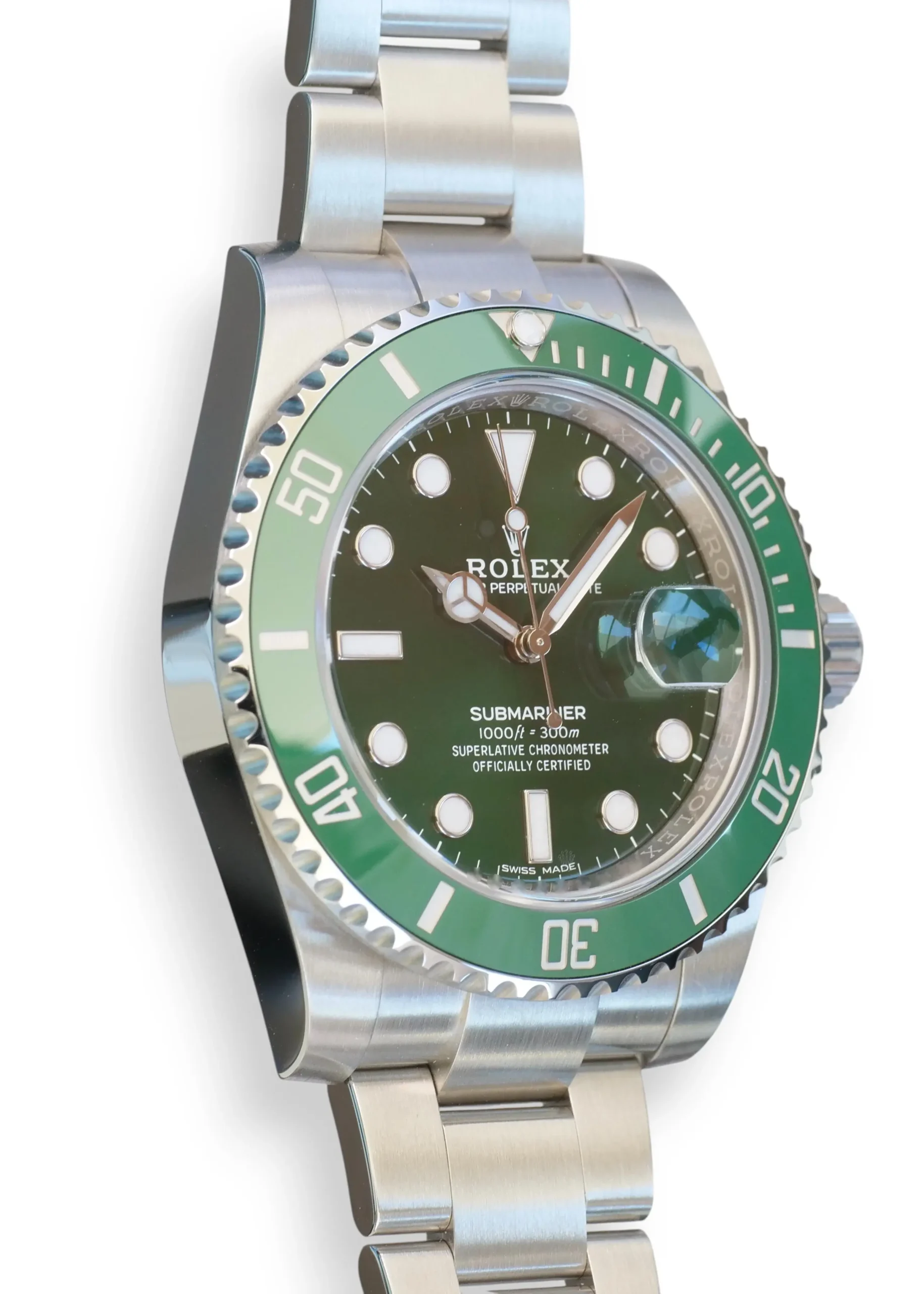 This particular example of Rolex Hulk is even rarer and the most collectible, as it is one of the last ones produced by Rolex before they were discontinued and is presented with the new-style Green computerized (NFC enabled) Rolex card, as opposed to all the previous year Hulks that were delivered with white (non-computerized) Rolex cards. The Green card Hulks were only sold by Rolex from March 2020 before they were discontinued shortly after in Q2 2020 and replaced by the now-in-production Starbucks 126610LV with black dial.