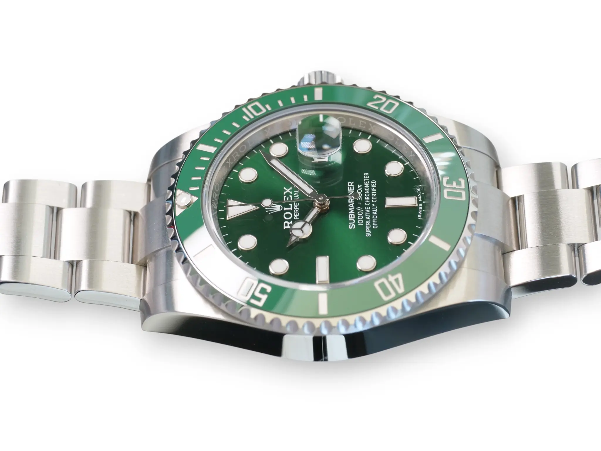 The Rolex Submariner Date Hulk is on offer for sale, a beautiful, long discontinued and very collectible Rolex in a spectacular green sunburst dial, and green ceramic bezel – the only all-stainless-steel Submariner in a colored, and then a green dial that Rolex ever produced in seven decades.